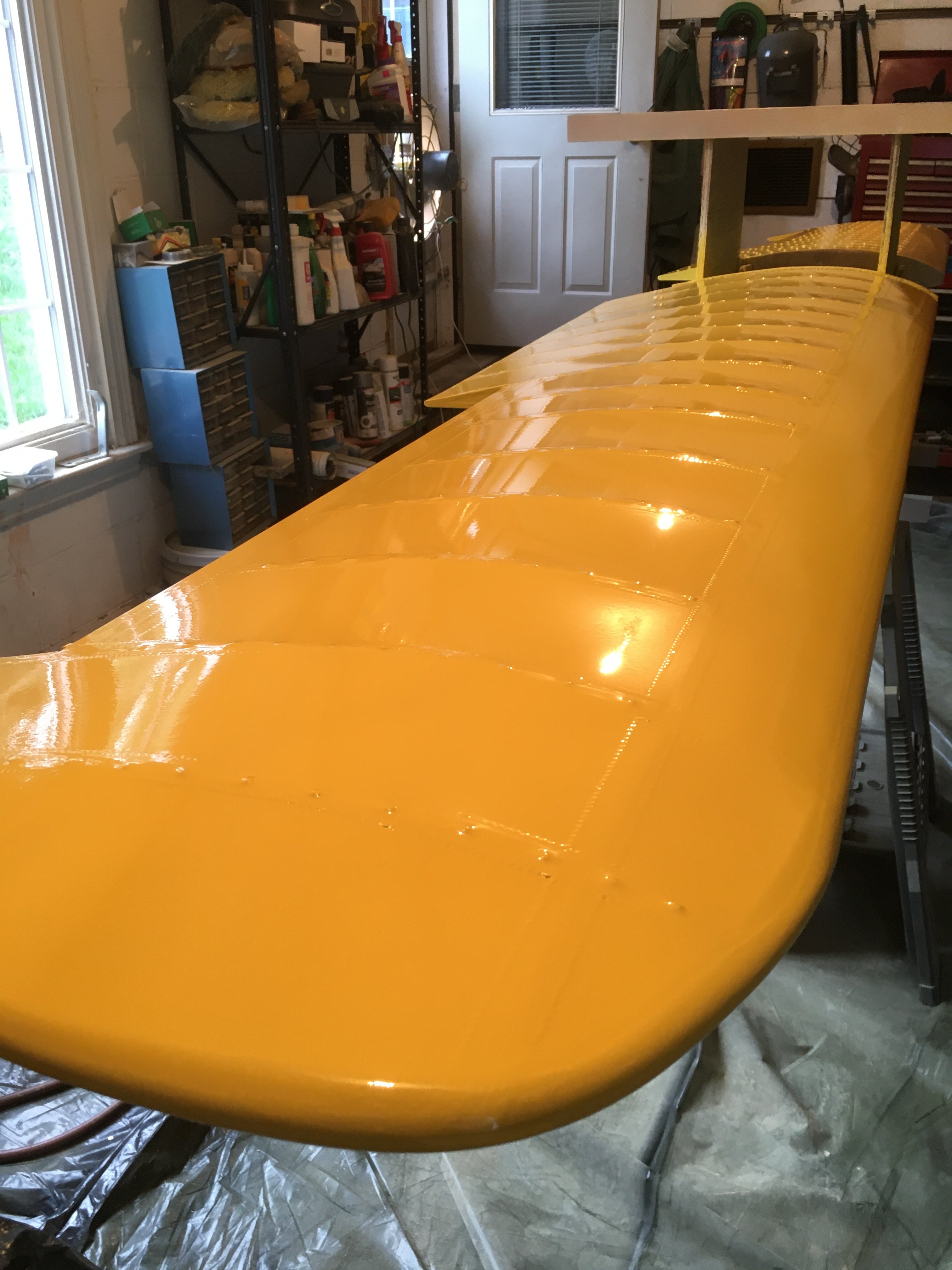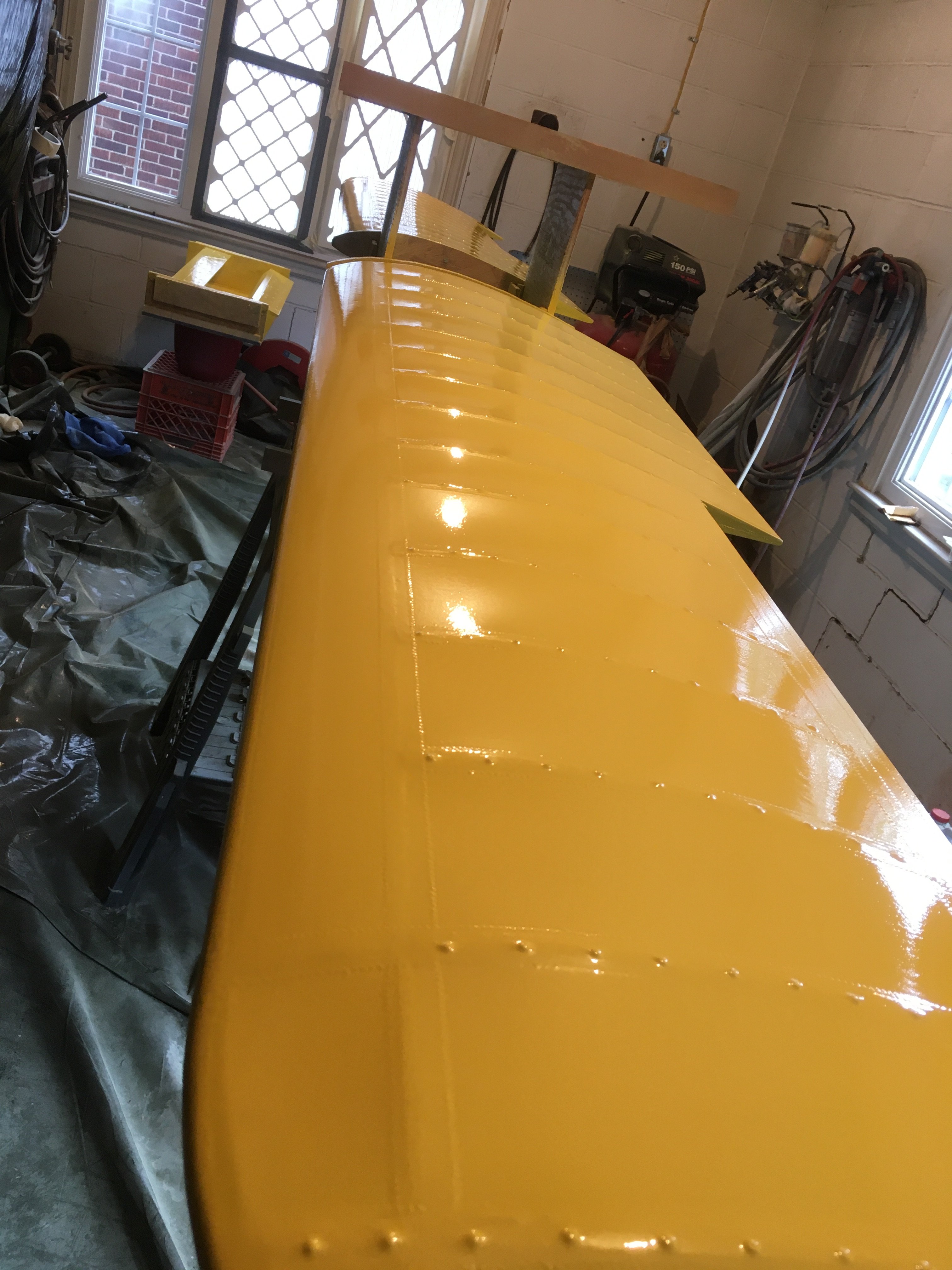 The paint is water based so no solvents fumes to worry about. The exhaust fan that I use was salvaged from a overhead furnace from by brothers auto repair shop, believe it is 1/3 hp, it moves a lot of air, previously used a box fan. It is mounted on a piece of plywood that is the same size as one of the windows in the storm door, remove the glass and pop the fan in, seen in photo 1 below.. The garage is about 18' wide, I hang the plastic from the ceiling and drape it across the floor. In the second photo you can see where two window panels are removes and 4 25"x16" furnace filters are installed. I have a homemade air dryer made from salvaged parts when I was employed, it was a steam sample cooler, the housing is stainless steel and weights about 30 pounds, filed with used desiccant, might have a gallon of volume, regenerate the desiccant in the oven when the wife is on, it lasts a long time. Everything was developed over time from previous failures, the air dryer by far was the best addition. I want to add a steel piping header that will cool the air before it goes to the dryer, I have the pipe on hand just need to install it. The dryer is so massive it does a good job without the header so I'm in no hurry.