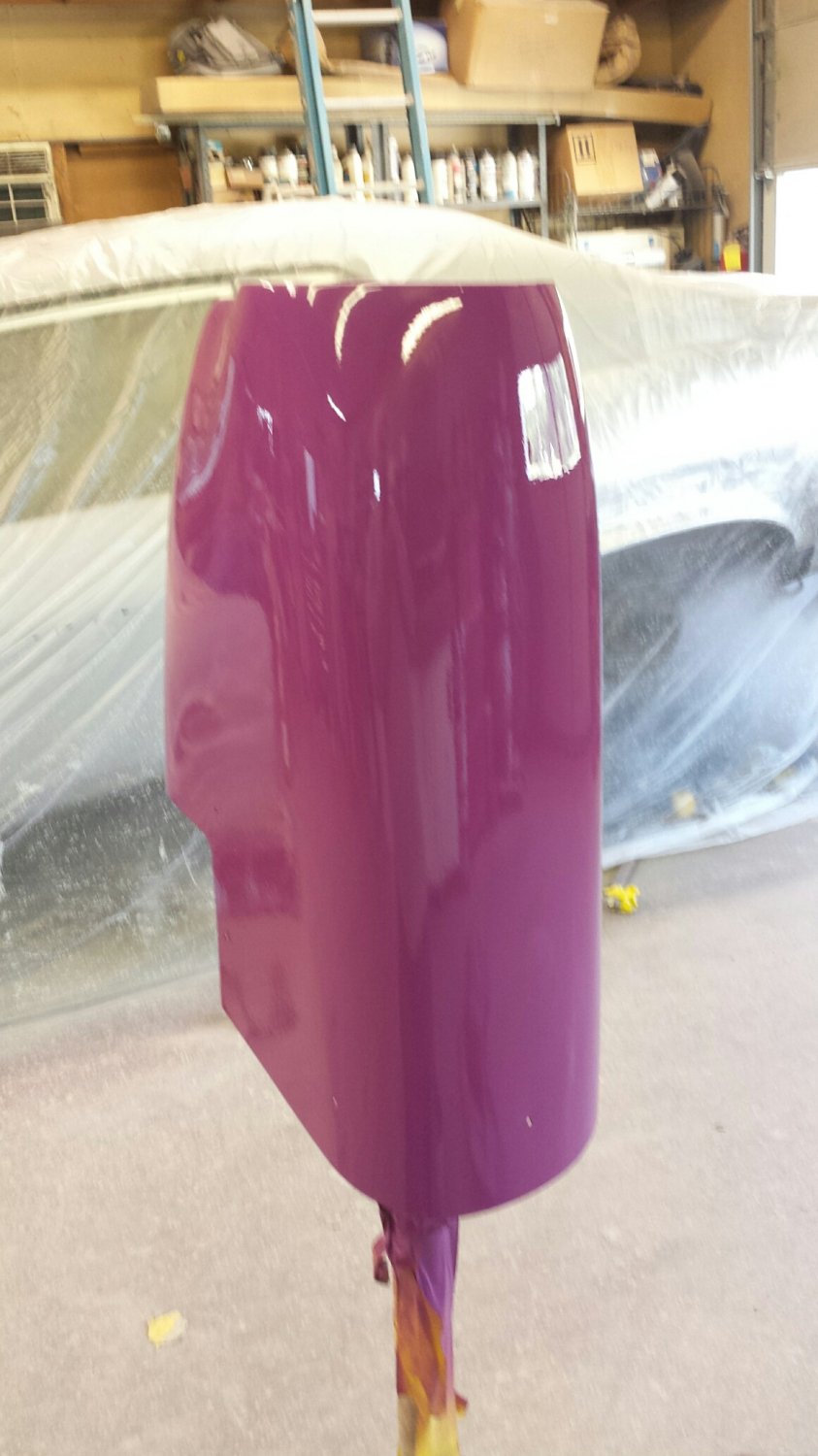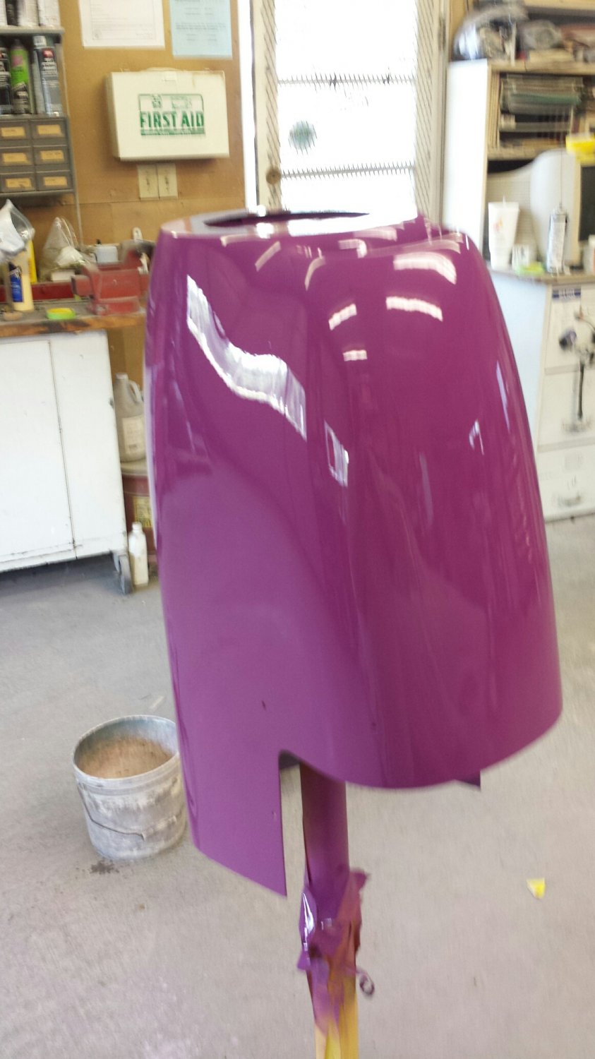 Great job Doug! I like purple.I got the cowl painted. It looks pretty good, but I wasn't thrilled with the paint he brought me. It's an acrylic enamel that had already been thinned with lacquer thinner. Not exactly ideal for a 95 degree day, but I managed to get it on pretty slick.