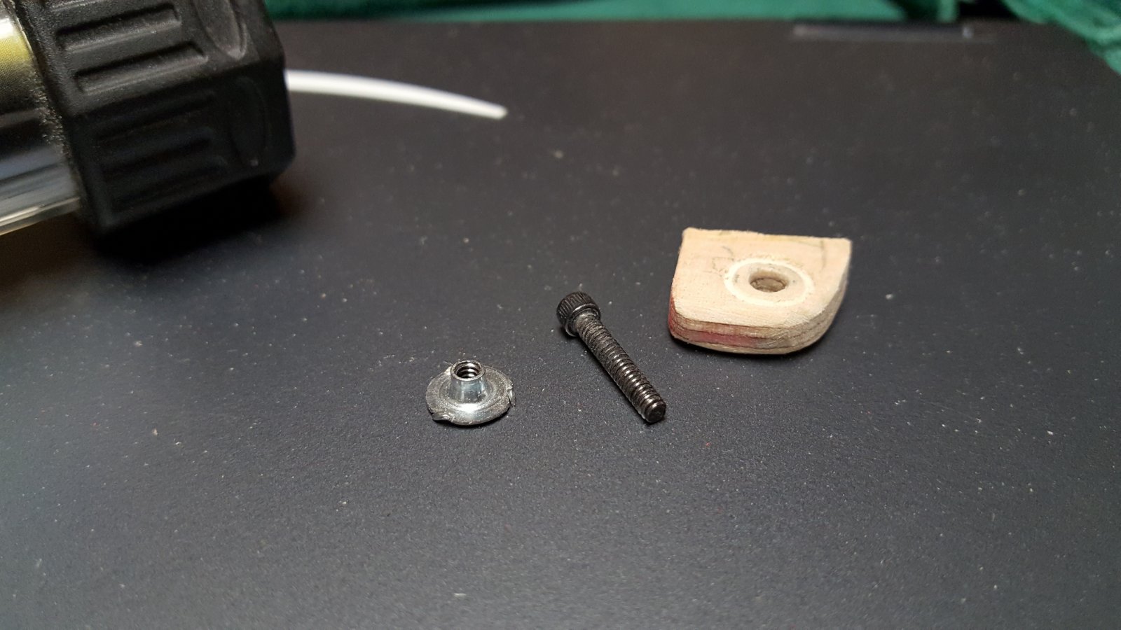 When I got it home, I finally did get the screw out, but even with being able to get to the back side now that the hatch was off, it fought me the whole way. The threads on both the screw and the nut don't look bad, but they're definitely screwed up.