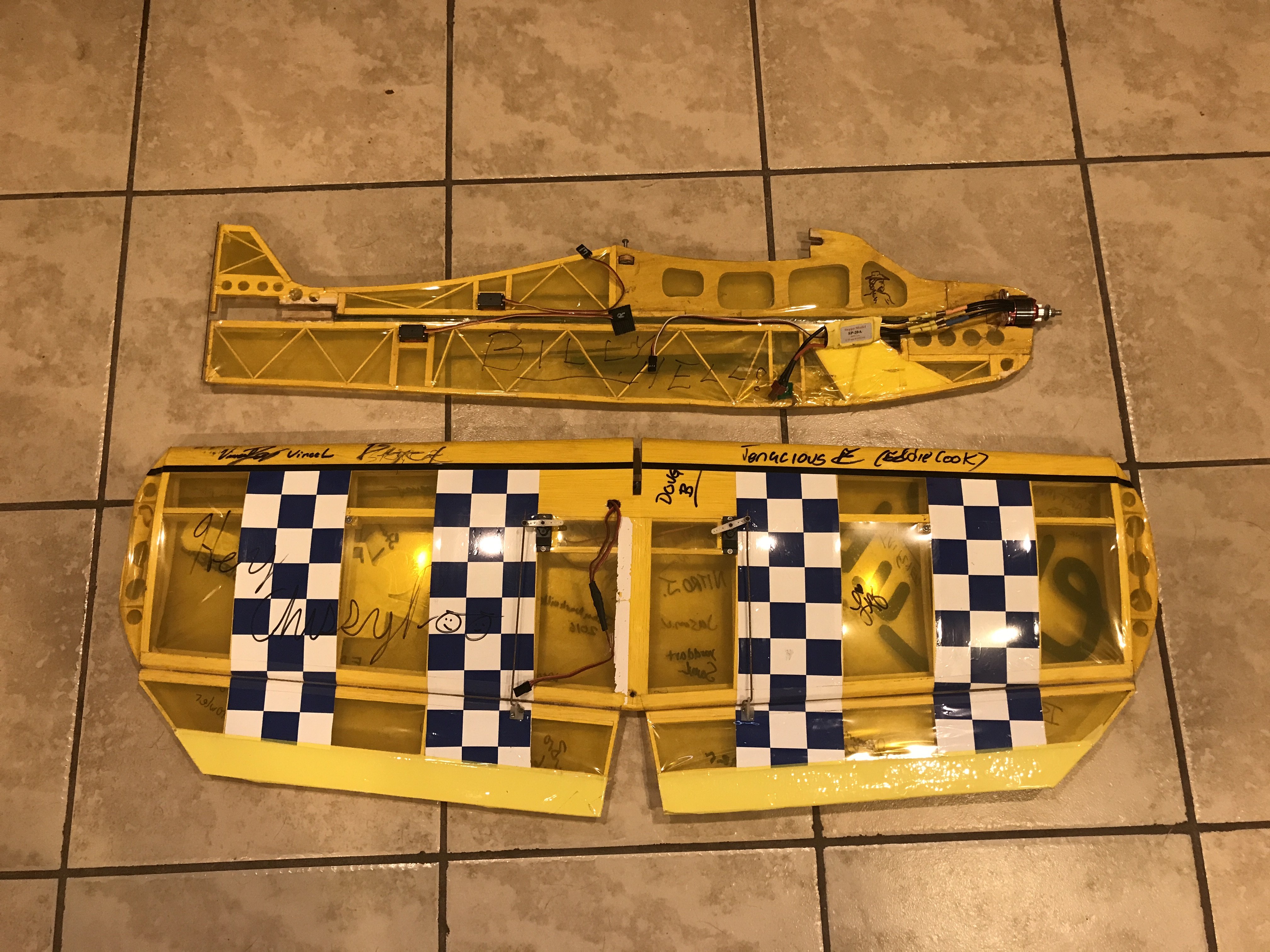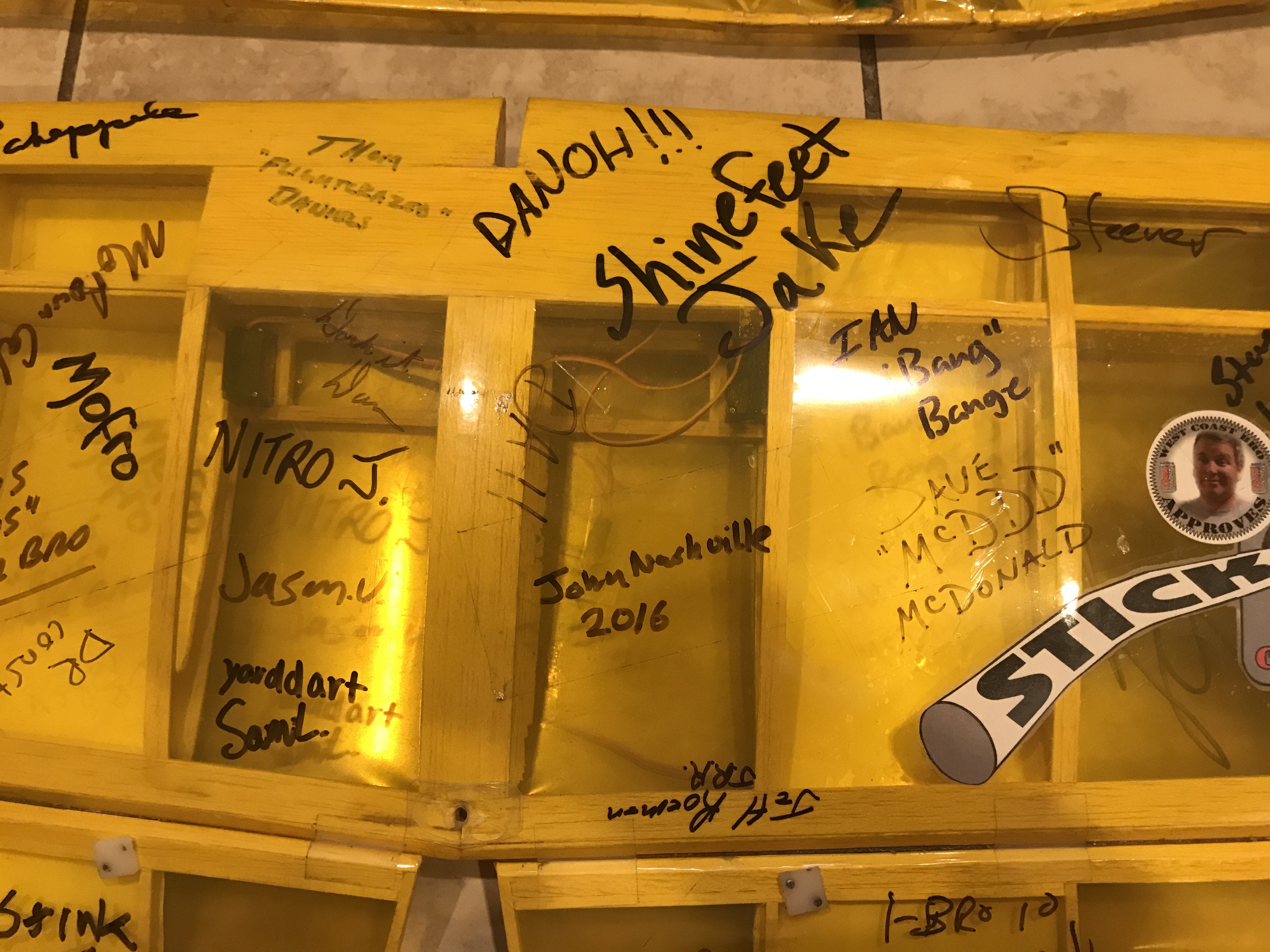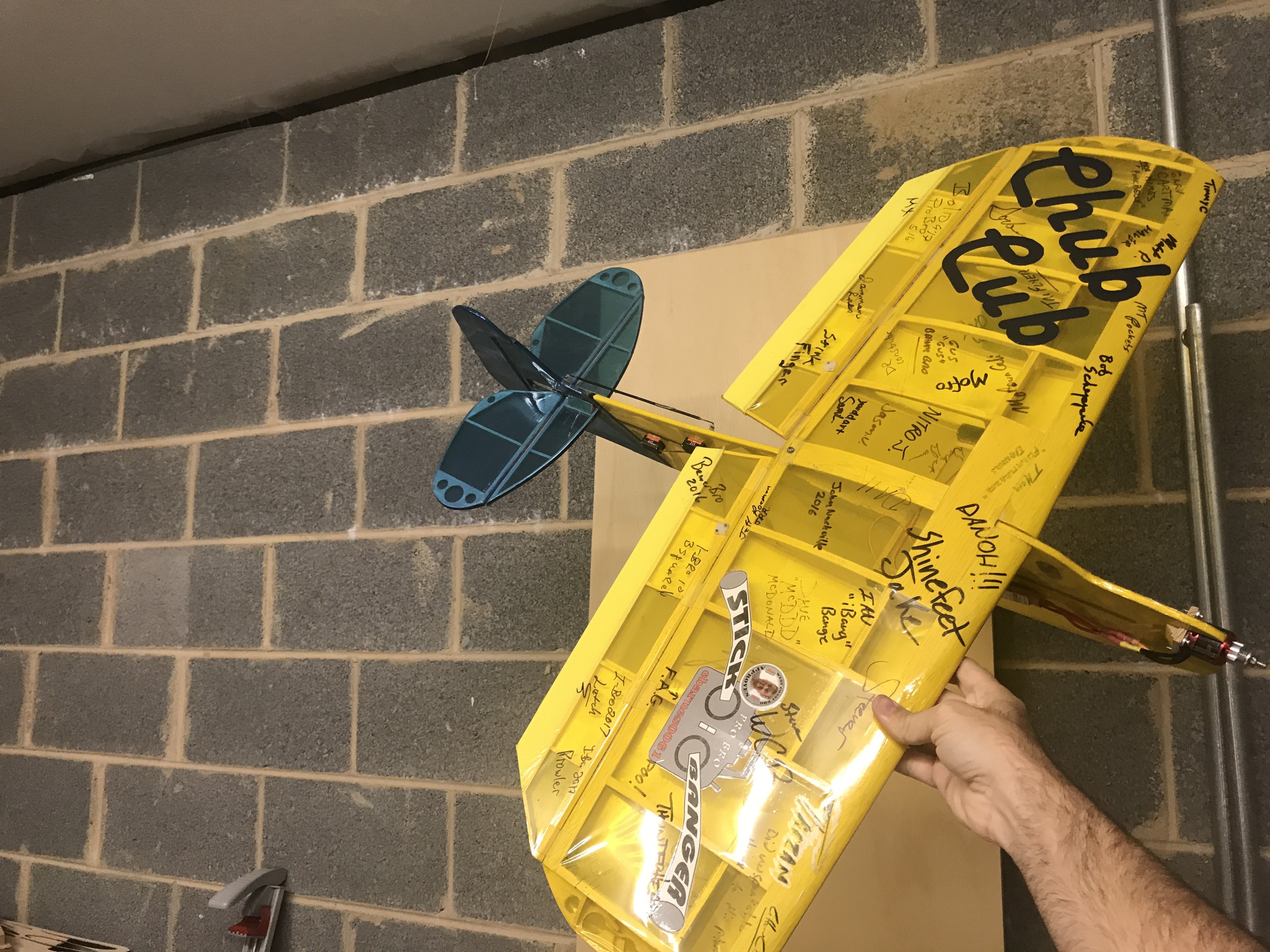 Blast from the past. This is the very first plane I designed back in 2014. After flying it for a year it went on a world tour all over the US and even out of the states once to different probros. All that was asked was to get some pictures and video of them flying it and before they where done to sign the wing. It made it back to me yesterday. It’s ready to make a handful of last flights before being hung on the wall in retirement to show off all of the signatures
