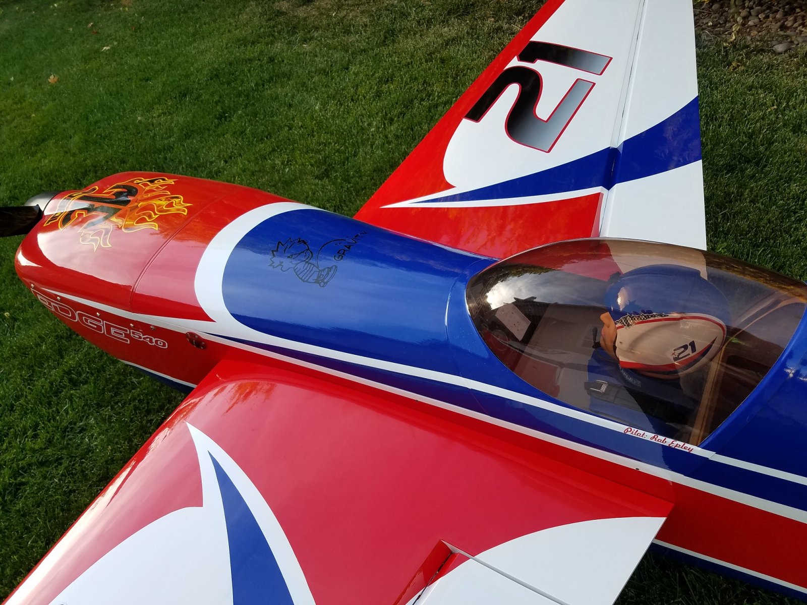 I may opt to trim them down a little, but right now not a huge concern. With the new Falcon Carbon Fiber 29x9 and 4.5"x5" spinner temporarily bolted in place on the front hub of that beasty 106cs red head, the post Huckfest damage repairs are now complete. And honestly, She looks nearly as new as the day I picked her up. That Pete's 4.5"x6' carbon fiber spinner better look really bad ass on this plane. I kind of like the looks of the Tru-Turn 4.5"x5" spinner. We'll see tomorrow once it arrives. For now, the 107" Pilot Edge is now ready for more action. Hopefully I remember to not get too close to the ground inverted???? LOL
