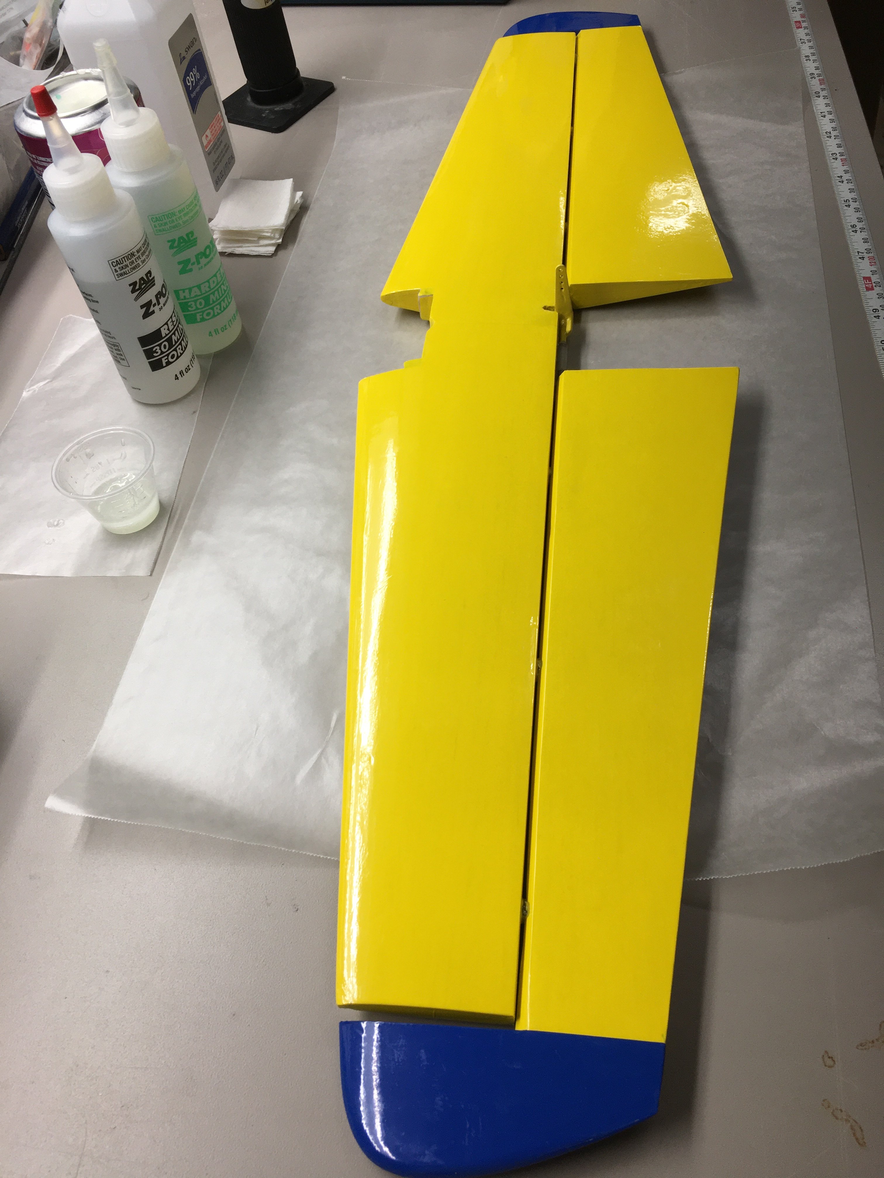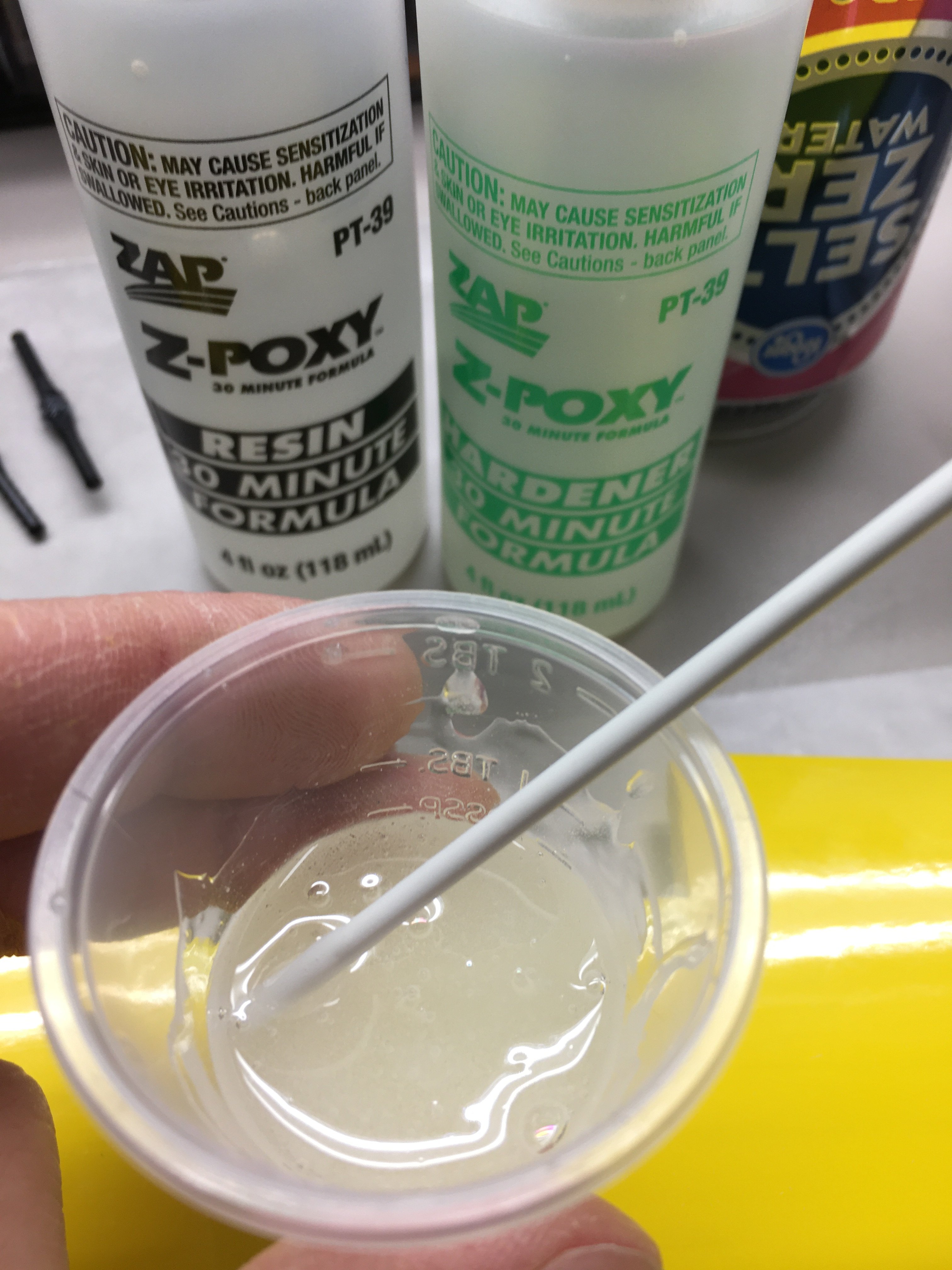 Using 30min Zap Epoxy, I mix it up in a mixing cup with a small plastic dowel used for rod building finishing resin. Use the rod to coat the epoxy inside the hinge holes. Lightly cover one barbed end of the pin by smearing with the mixing rod and insert into one half of the control surface. Do this with all the pins. You should have little to no excess resin. Do the other side and repeat.