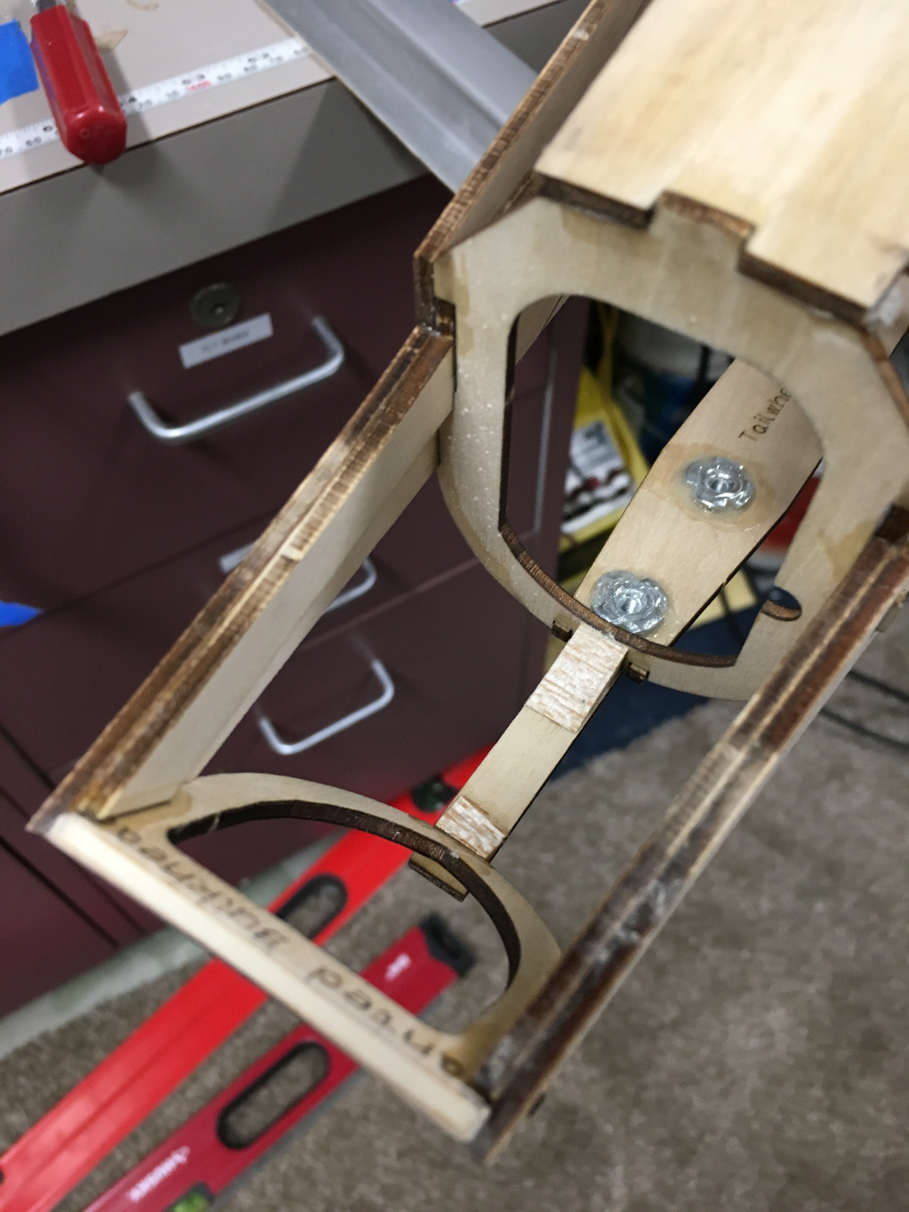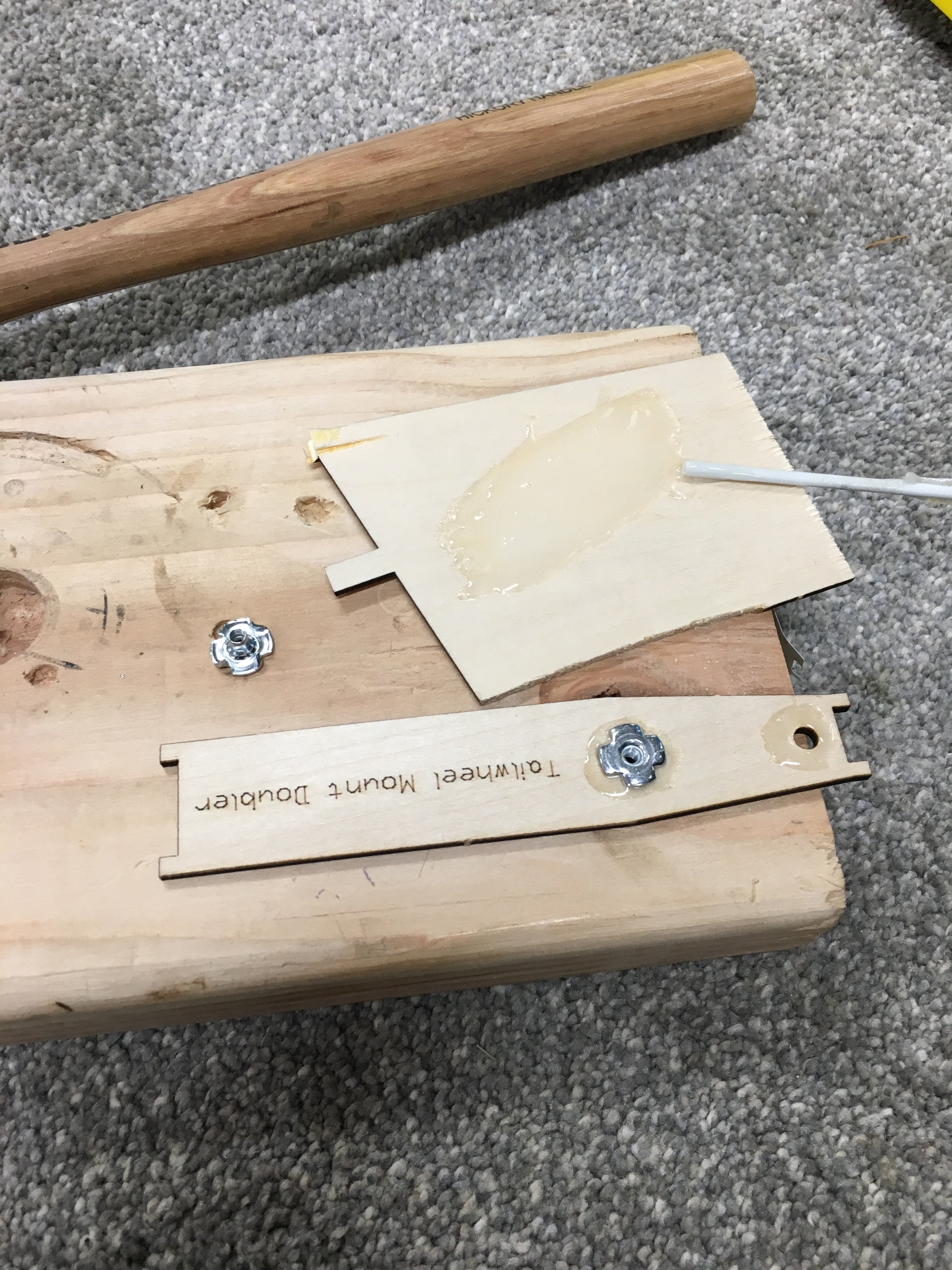installed blind nuts for the tailwheel mounting bracket. Fit like a glove. Made sure they didn’t bottom out by tapping them into a slightly larger hole below the board it’s on. They nestle into the lower fuse frame and everything just fell into place beautifully.