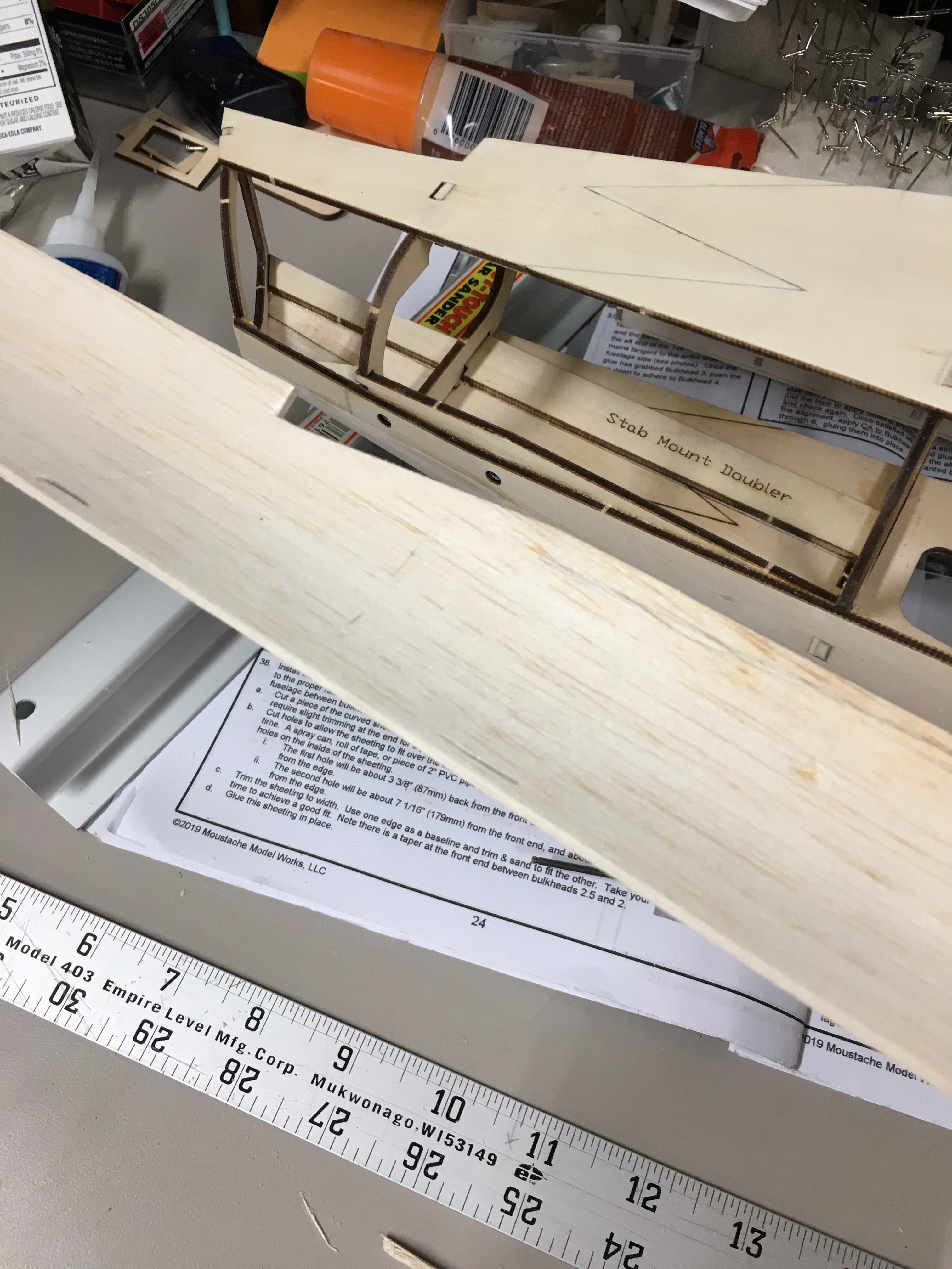 Well this was a major pain in the butt. I ended up tearing the top skin off after seeing the planes lower skin was aligned and when twisting the top skin into place it would enhance the twist. After conversing with other people who are building this model found they had similar issues. They all wished they fitted the sheets and bulkheads before any glue was added. The manual misleads you a bit by glueing the sheets in place but make no mistake dry fit every bulkhead in place and keep the horiz stab alighted with the wing tube the whole time.