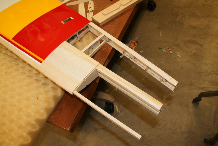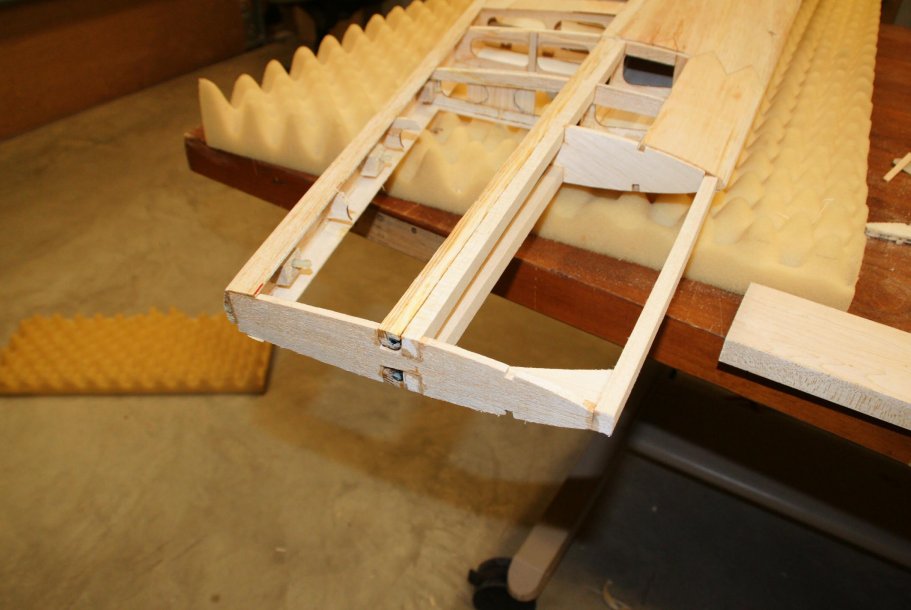 Ok I see now thanks Earl.Outer wing coming along. Cleaned up the jagged sheeting. Re-enforced the spar extensions with square balsa stock. Glued in a LE support and one nose rib. Used the old tip rib to pattern a new one and glued that in pace. Now I can tape some string from that tip rib back to the existing sheeting and ribs . That will help me define the shape of the missing ribs.