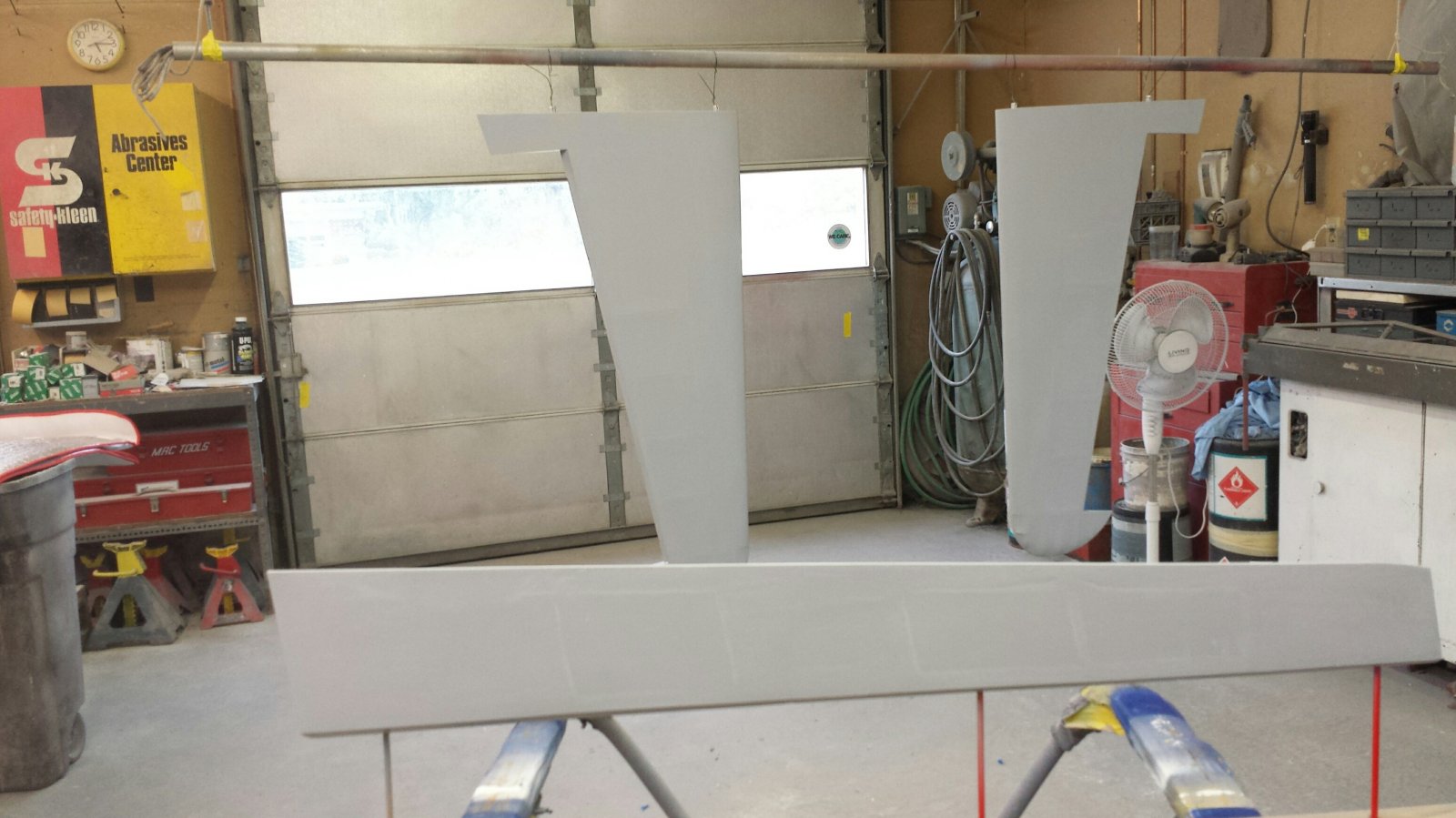 This evening I sprayed a coat of white on the top of the wings. Tomorrow I'll mask the area where the white stripe will be and spray the red, then more masking then black, then clear and yada, yada, yada.;)