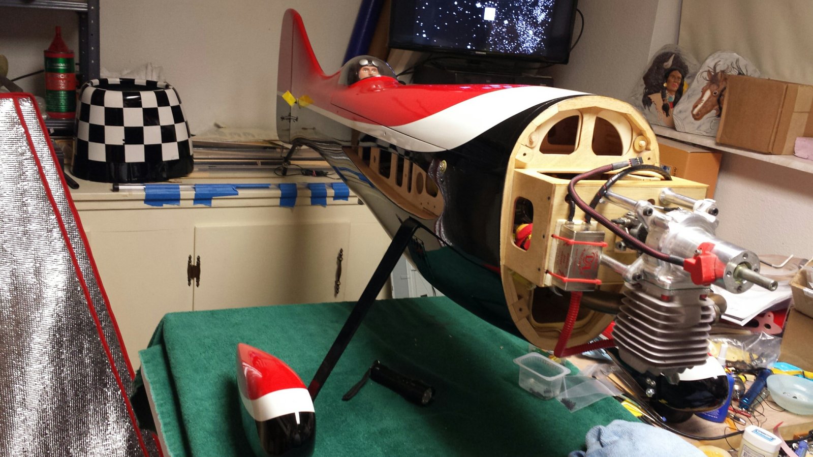 This is the Frankenstein of airplanes. Wings and stabs rebuilt and modified from an Aeroworks Yak 54. Engine, tuned pipe and servos from my Aerowrks Extra 300 that I sold and SparkSwitch, batteries and receiver were out of my Carf Extra.