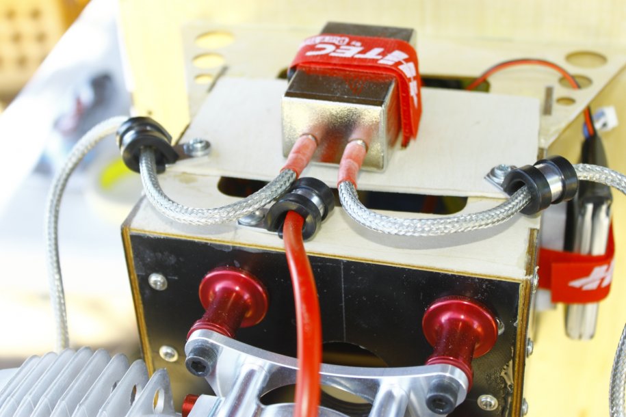 Cowl back off, I decided to make a mounting plate for my ignition to sit up top. Some velcro and a Hitec Velcro strap hold it in securely.