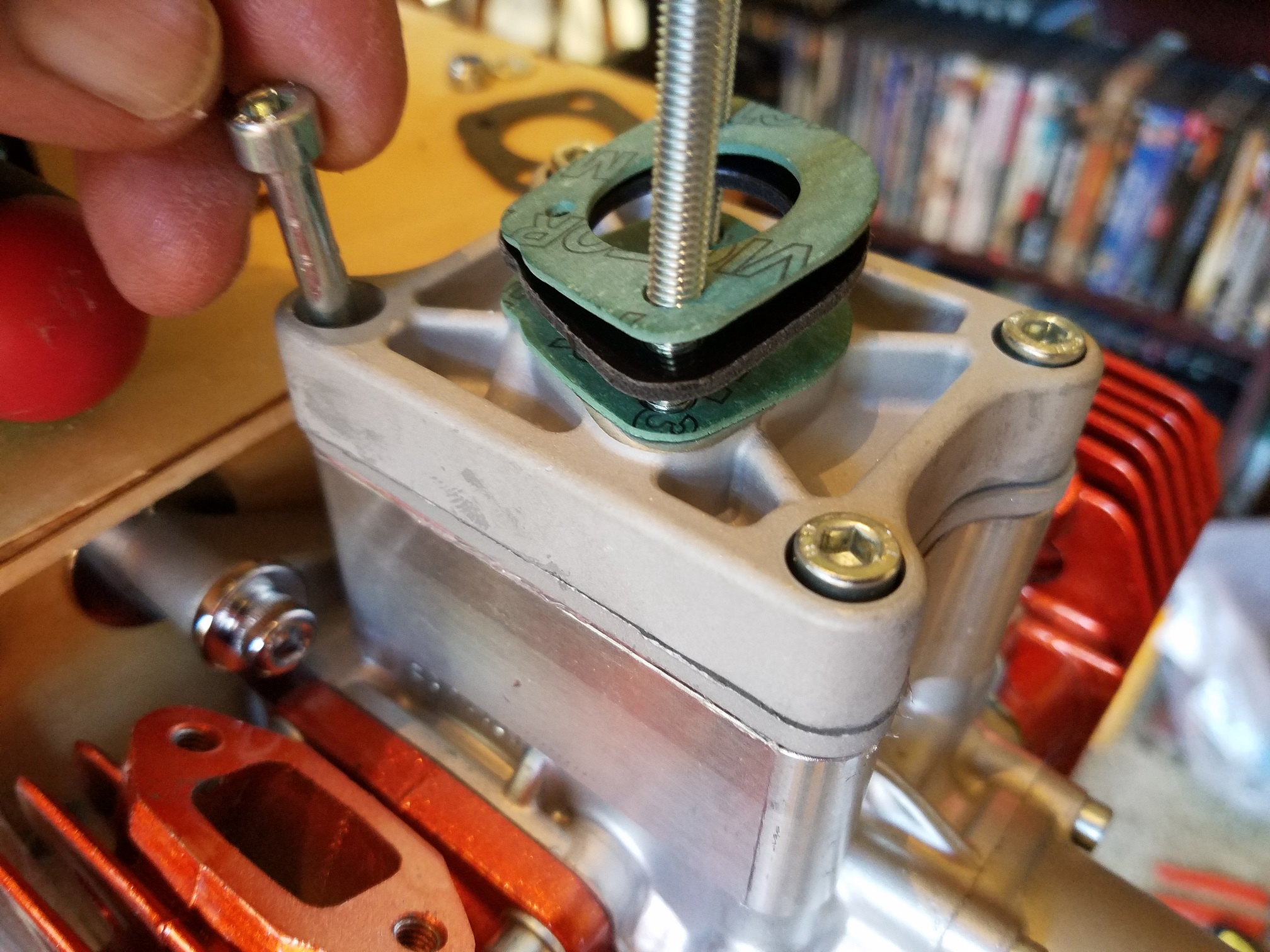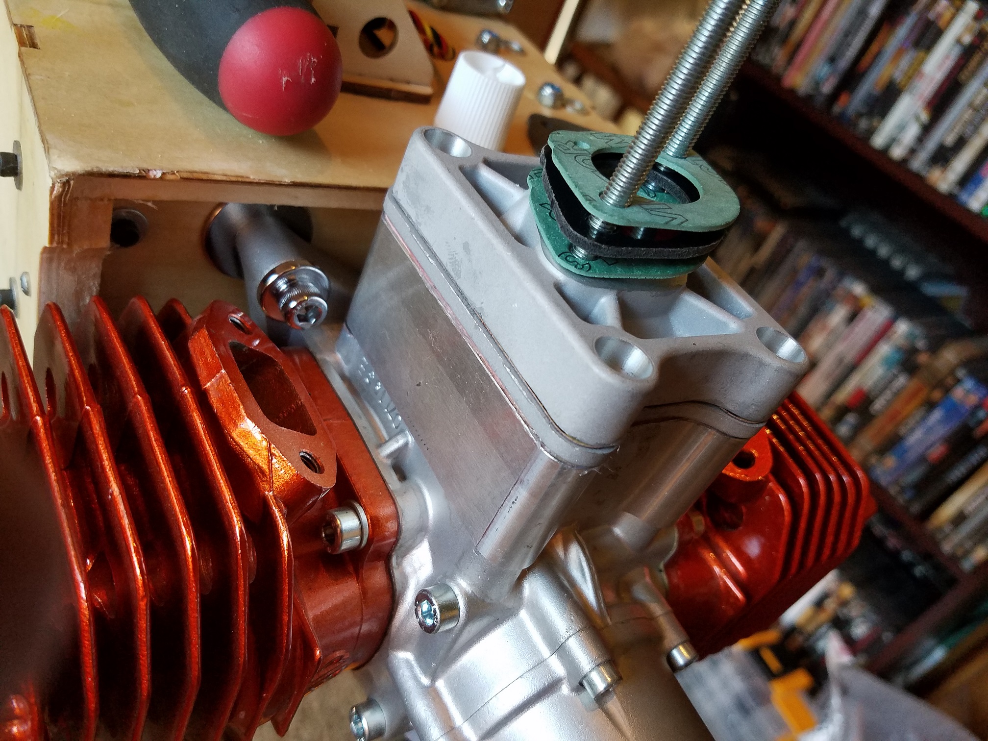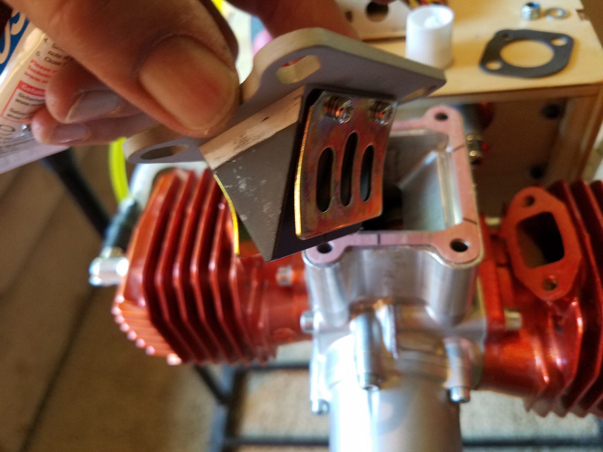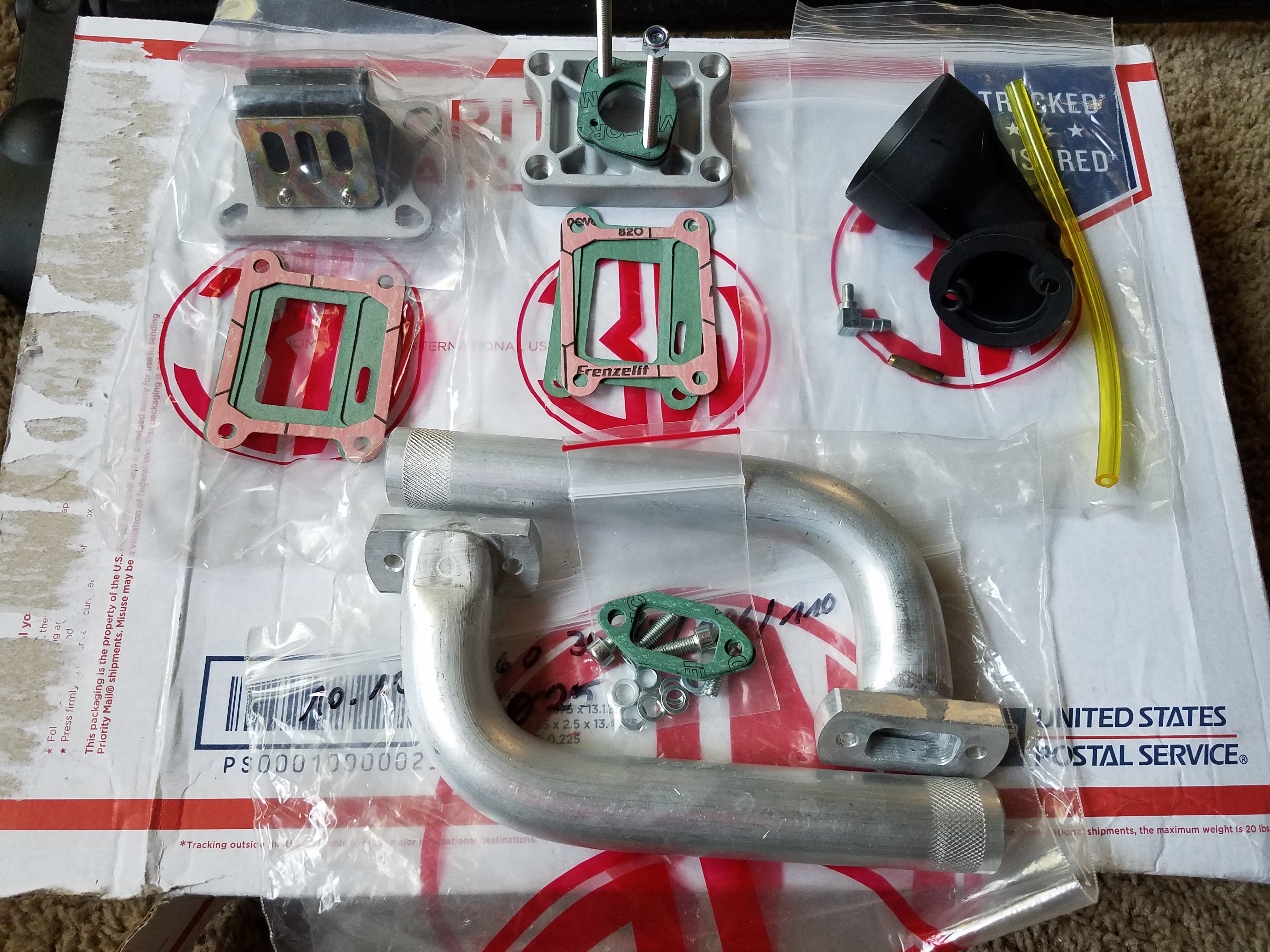 Installation order: Engine case, corresponding gasket. Aluminum reed block, corresponding gasket. Updated aluminum reed cage, corresponding gasket. Aluminum carb base, carb base gasket, carb base insulator, carb base gasket, carb. (Note the arrangement of the pulse ports)