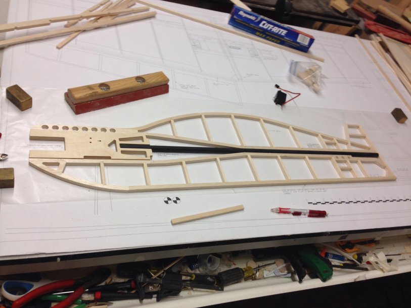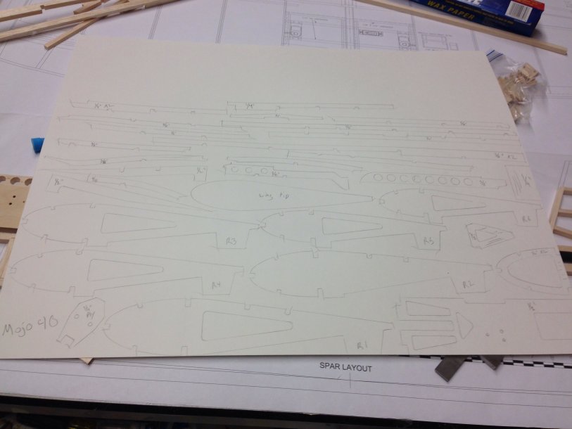 Start of the mojo. Most important part was to trace all the cut parts as I know I will need another at some point. I will get more pics tonight as I have the rudder stab and elevator all framed as well and the wing is ready for sheeting. Not as much as I wanted to get done today but it will have to do. Had other things come up like getting the white and blue slime scheme profile shipped to its new owner in Texas, work on gifts for the wife, and go get our tickets for the 1PM showing of Star Wars on Saturday. Should finish framing it tomorrow and have it ready to cover.