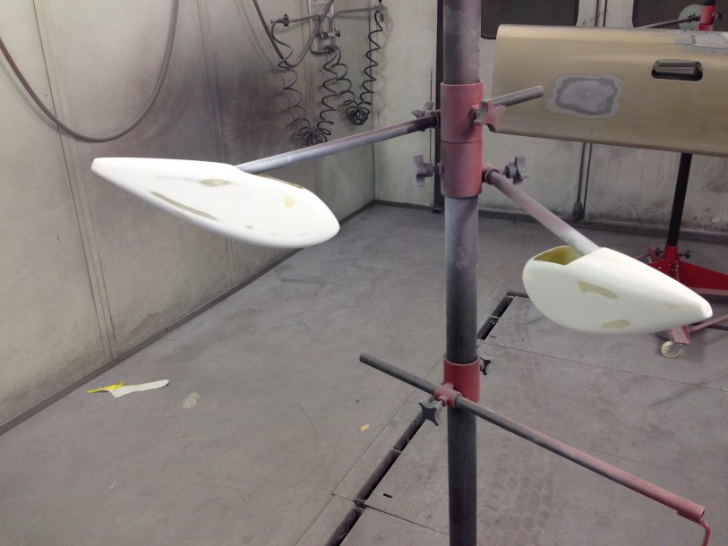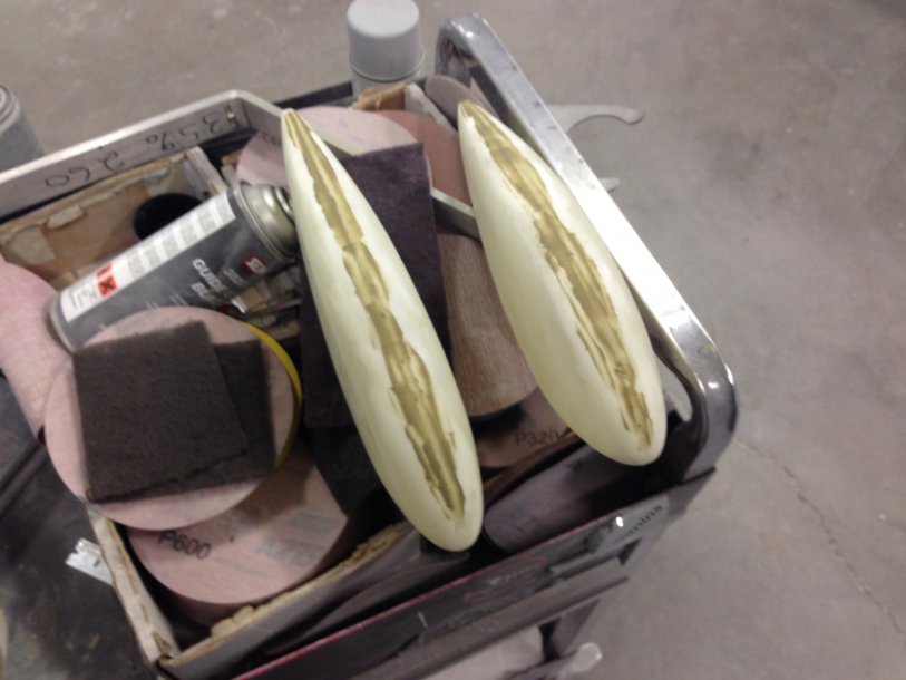The second picture is after I filled the sean of the wheel pants and sanded smooth with a lightweight body filler. The first picture is after I primed them and sanded them. Now I will give it one last coat of primer before I paint. These parts were so full of pinholes, so a little trick is to spray a really wet coat of primer and then take a paint roller and roll the whole thing. Then a couple more coats of primer. All the pinholes get filled. It makes sanding the first time a little longer, but you don't have to deal with those little pinhole buggers.