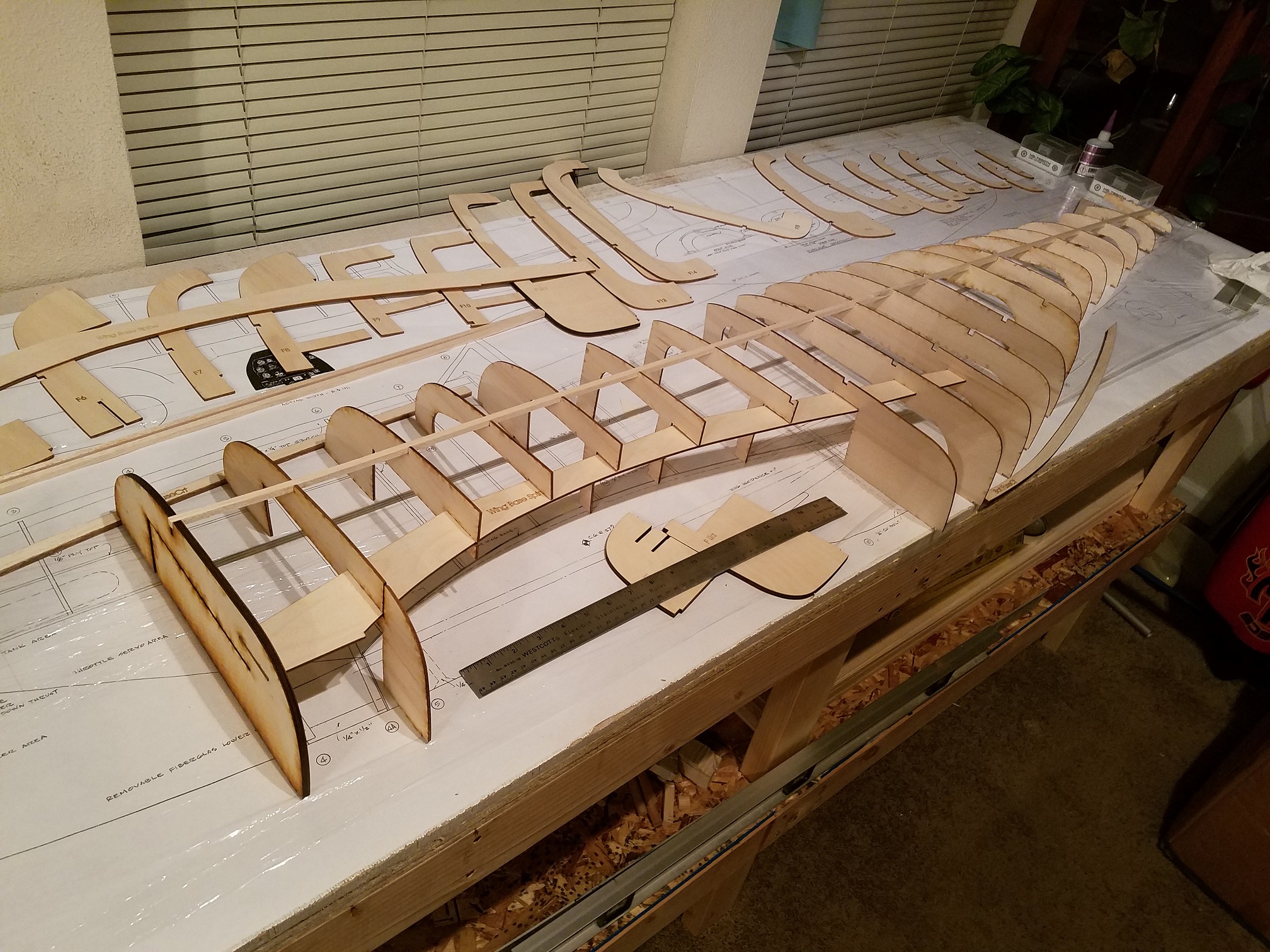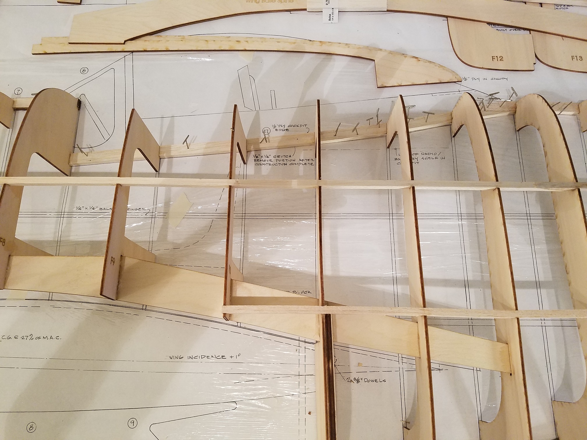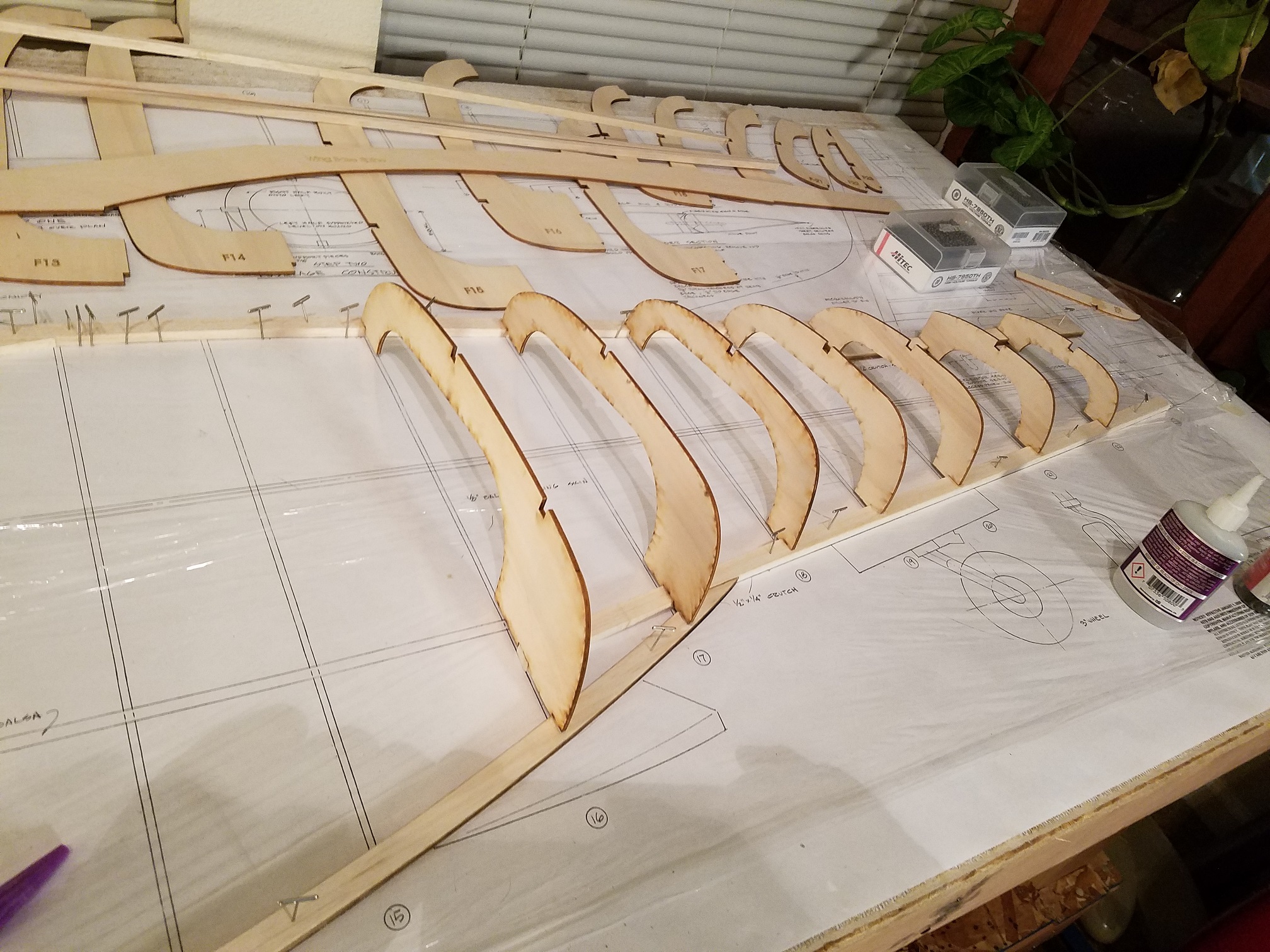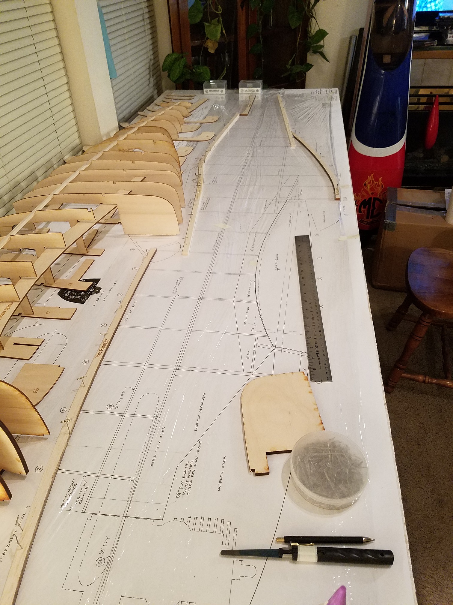 I started tinkering this evening by going through the wood and inventorying everything. As far as I could tell, it was all there. So, according to the plans, the left side is built right on "top" of the plans. I layed out the fuse and protected them with plastic wrap. I've been doing this for years and as long as a guy is cautious, the plans stay perfectly clean with no glue droplets or cut marks. I then started laying out the formers. First one, then another and before I knew it I had all 23 fuse formers layed out and basically resting in position.