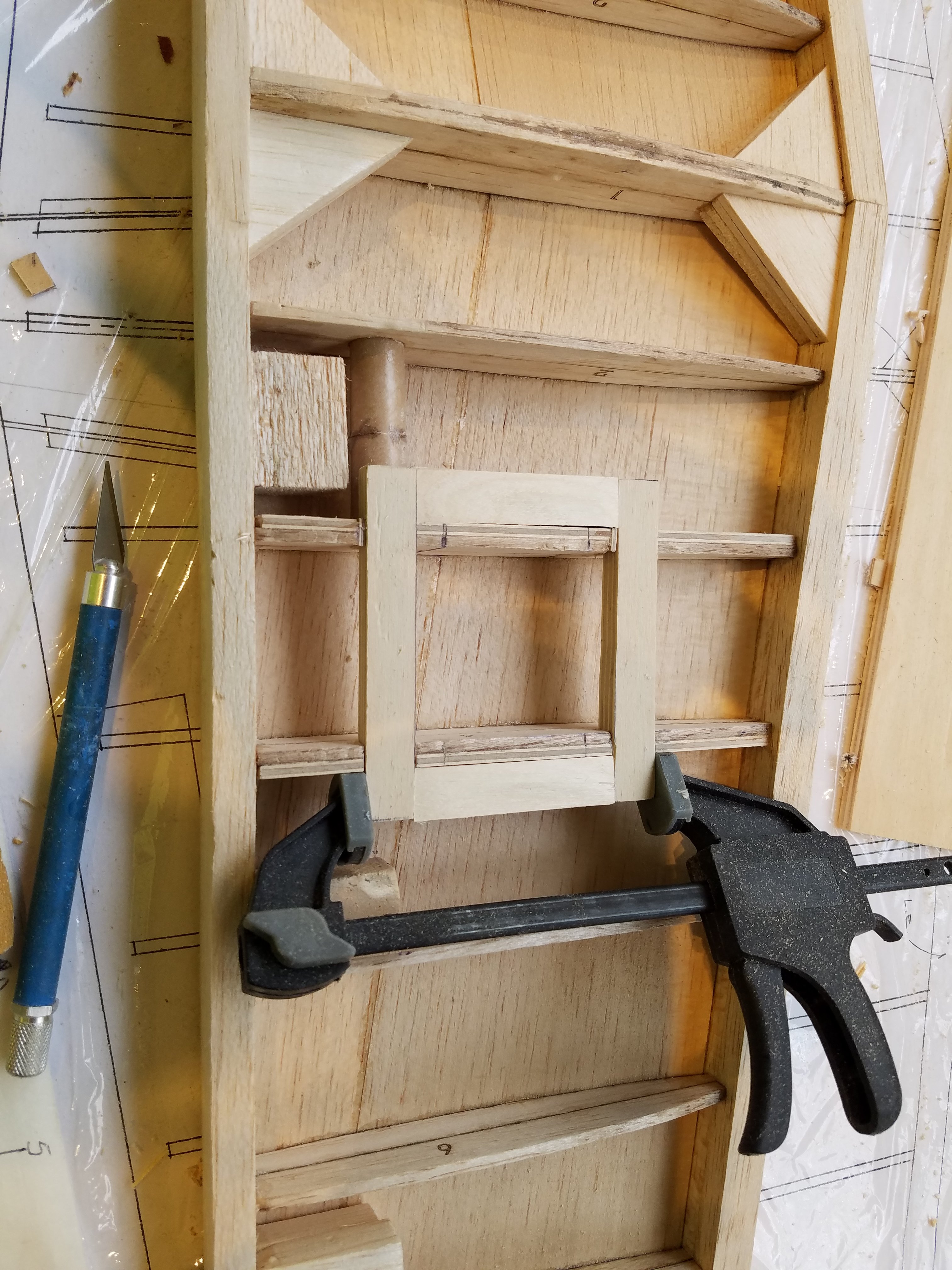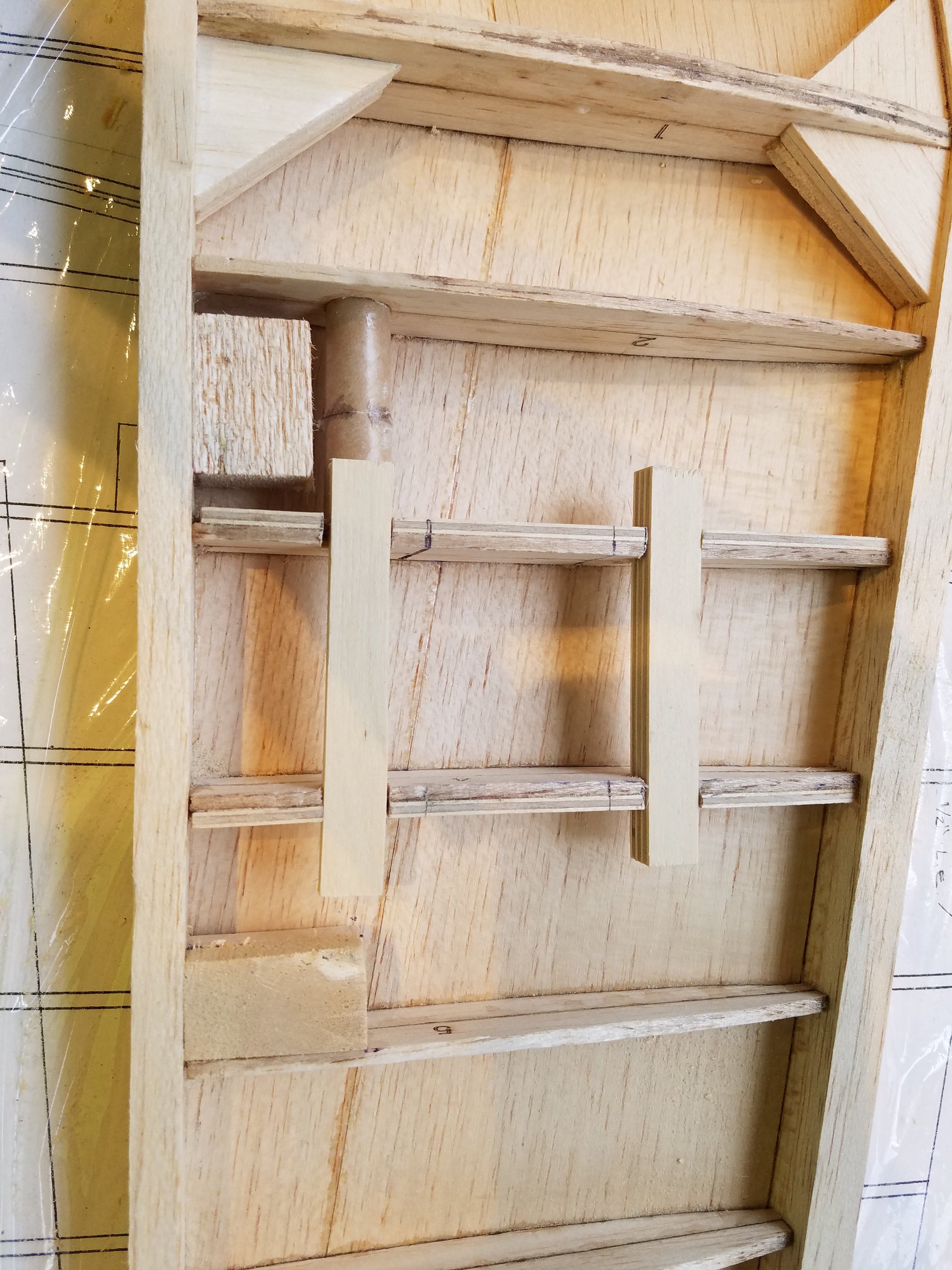 I have the two doors now laminated and under the press. This gives me some time to do the border sheeting and start sheeting the bottom of the stab/elevators.