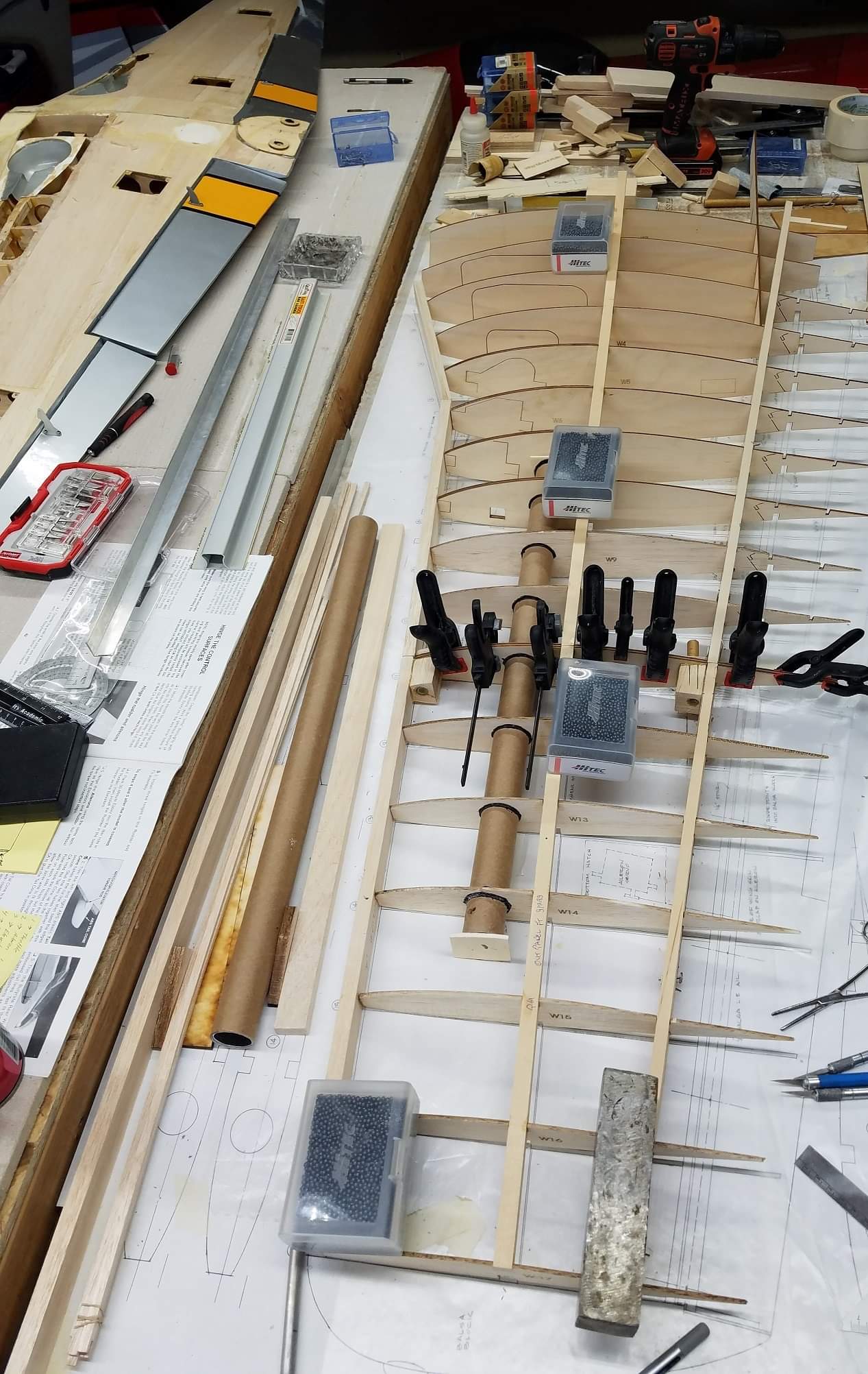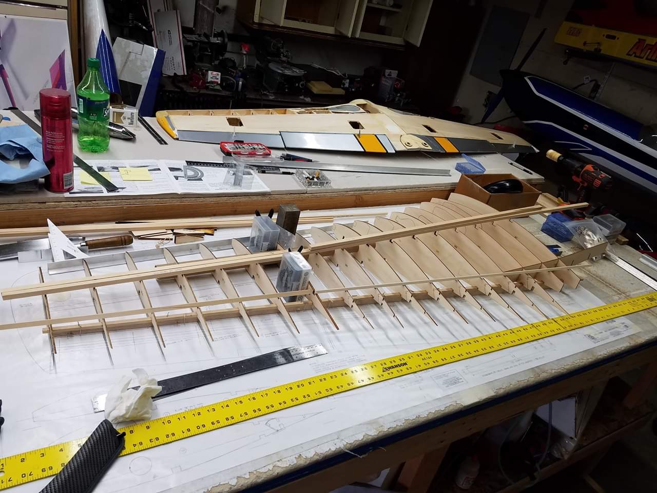 Got a pretty good start on the top half of the right wing. Trying very carefully to build this strong, but no extra weight. I have built some pretty darn straight fuselages and tail feathers in my day. But one thing I've learned really well, is the overall handling and flight characteristics are 90% dependent on the construction of the main wing. So I spend way more time, (maybe too much) on the accuracy and structural integrity of the wing as i do any other part of the build.