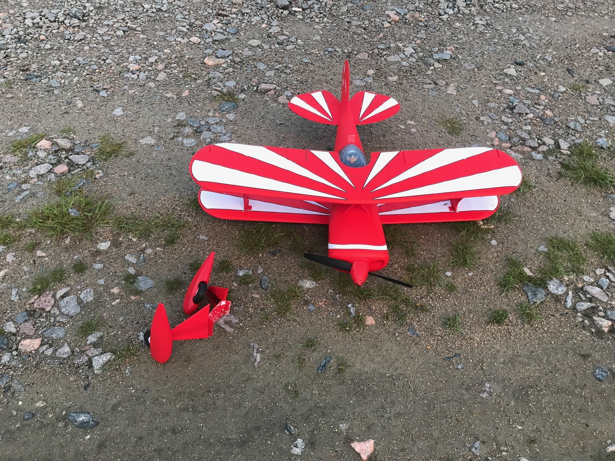 Now to the rough part. Bringing it in to land did a couple approaches to feel out the plane and it does need a little speed. Make a nice smooth touchdown but did not see the bigger rock in my path. Rock caught the right gear and basically caused the plane to do a high speed ground loop that when the gear leg bent and folded up the plane then cartwheeled causing the other damage.