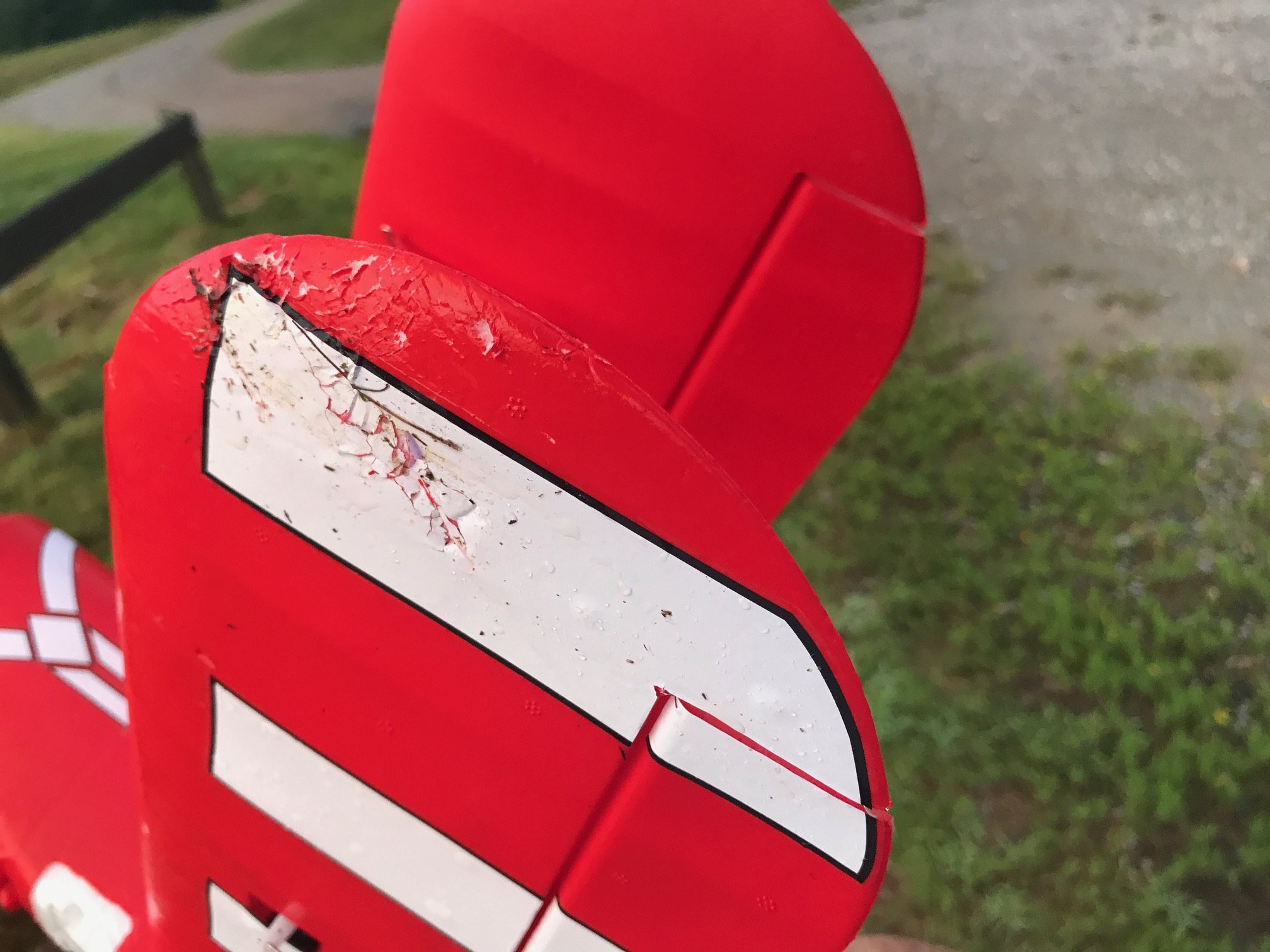 Now to the rough part. Bringing it in to land did a couple approaches to feel out the plane and it does need a little speed. Make a nice smooth touchdown but did not see the bigger rock in my path. Rock caught the right gear and basically caused the plane to do a high speed ground loop that when the gear leg bent and folded up the plane then cartwheeled causing the other damage. Will repair the gear at work today and so long as the prop adapter isn't bent then it will fly again soon. I'm thinking though the wheel pants may have to come off in favor of some slightly bigger wheels for when flying off of the grass runway at my club field.