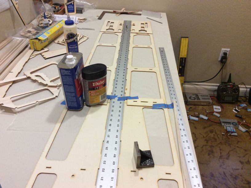 So it looks like these kits has sides that are all laser cut. I guess they are pre built? Sure looks like it would build fastFamily Holiday schedule has slowed the build down a bit. Was able to glue the fuse doublers on last night. My boys' jar of BB's sure does make a nice weight. Used the tape so the doubler didn't slide out of position while adding weights. Next is to glue on the stab doublers, make up some longerons and get them glued to the fuse. Will work on getting the aluminum landing gear brackets located and bolted up to the motor box while glue dries.