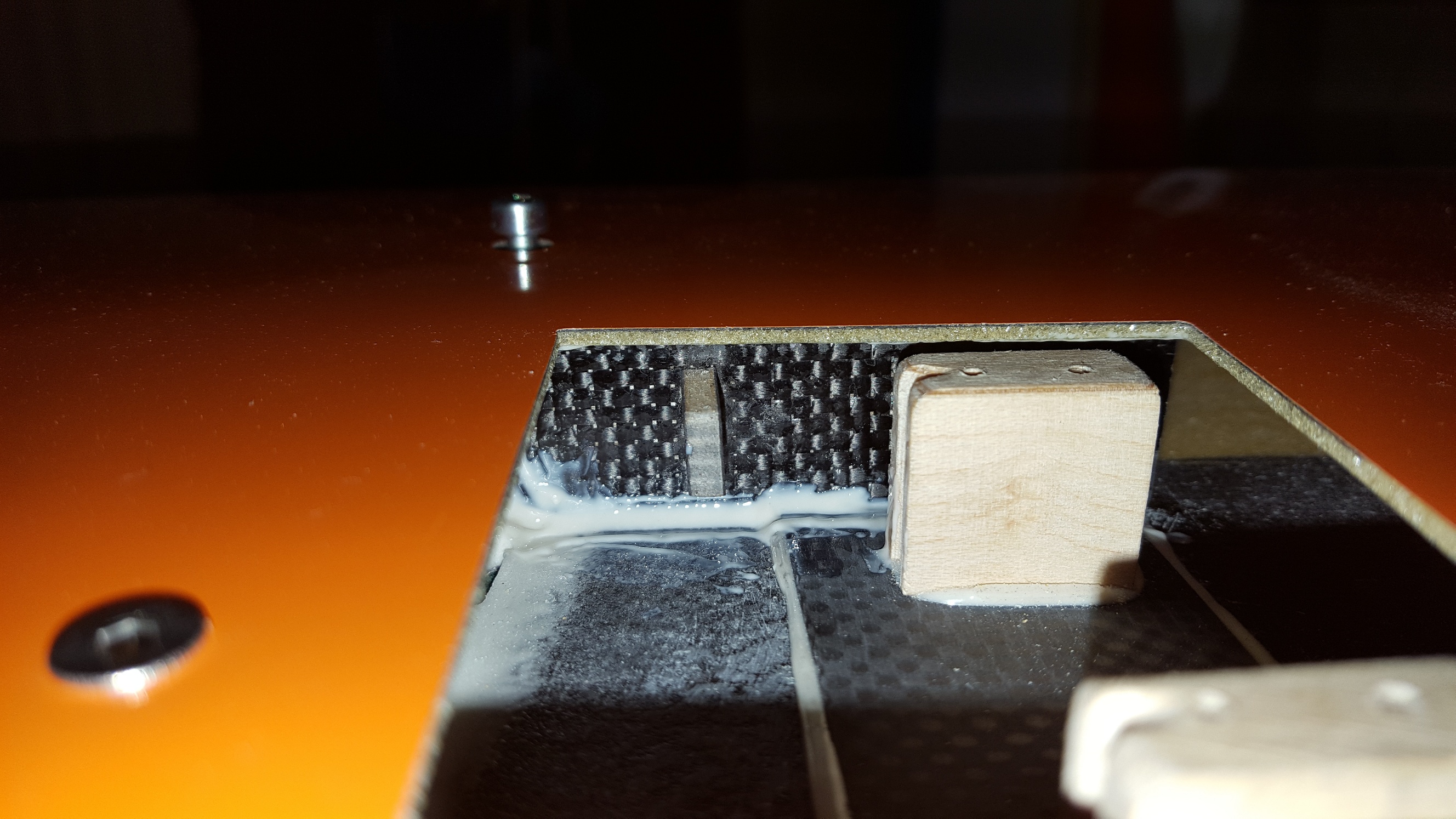 After making all the aileron servos work I didn't like the way the wing skin that the mounts are glued to flexed at full throw, so I made reinforcements to go between the upper and lower skins, and butts against the closest rib. Not an easy task to fit or glue in with the room available, but it worked out fine. I made them out of some balsa carbon fiber sandwich material that is light, strong, and easy to work with. I had to add a small square on the side to use as a handle to get them in position. I did the lower wings last night, and hope to do the top tonight.