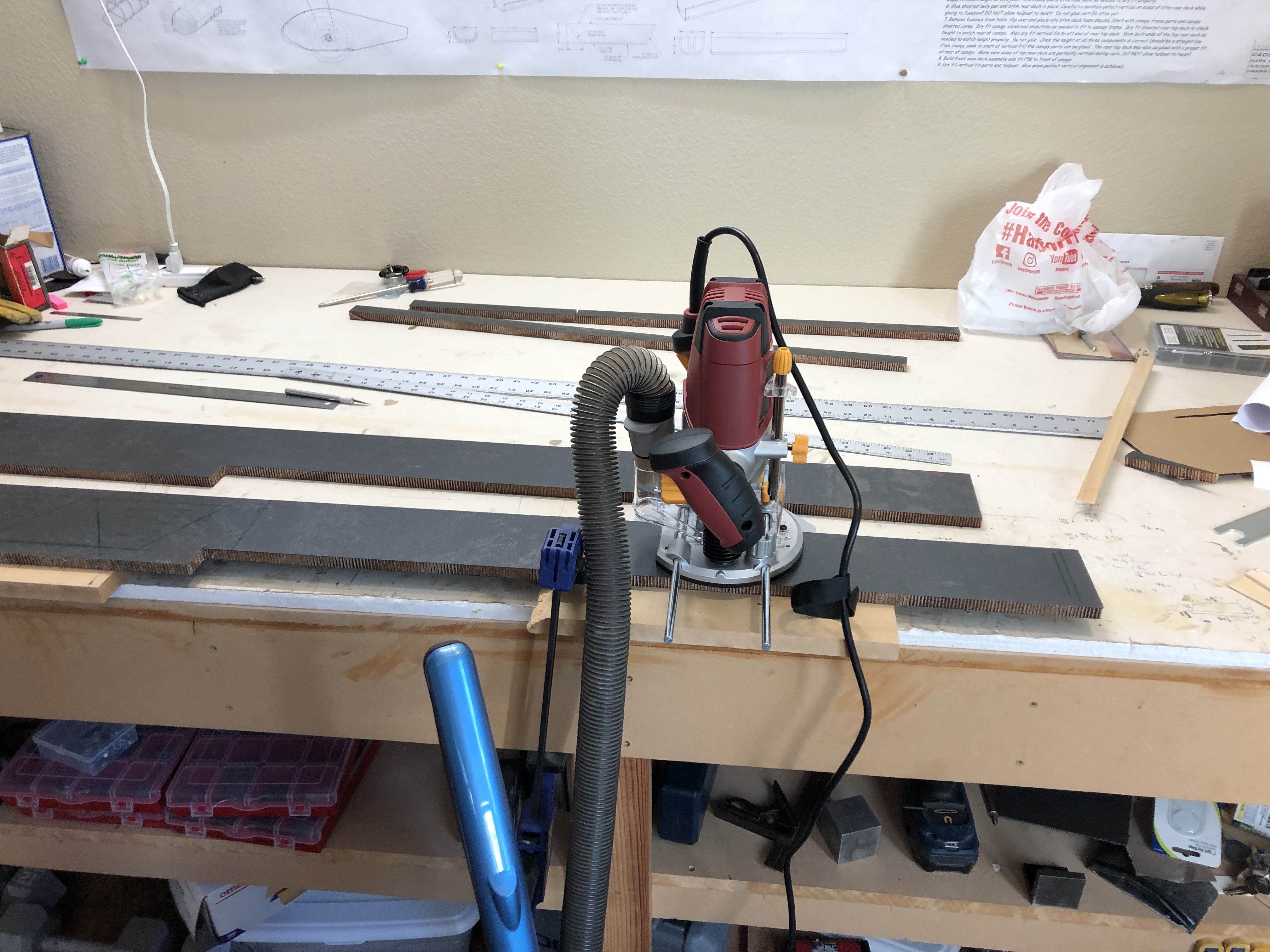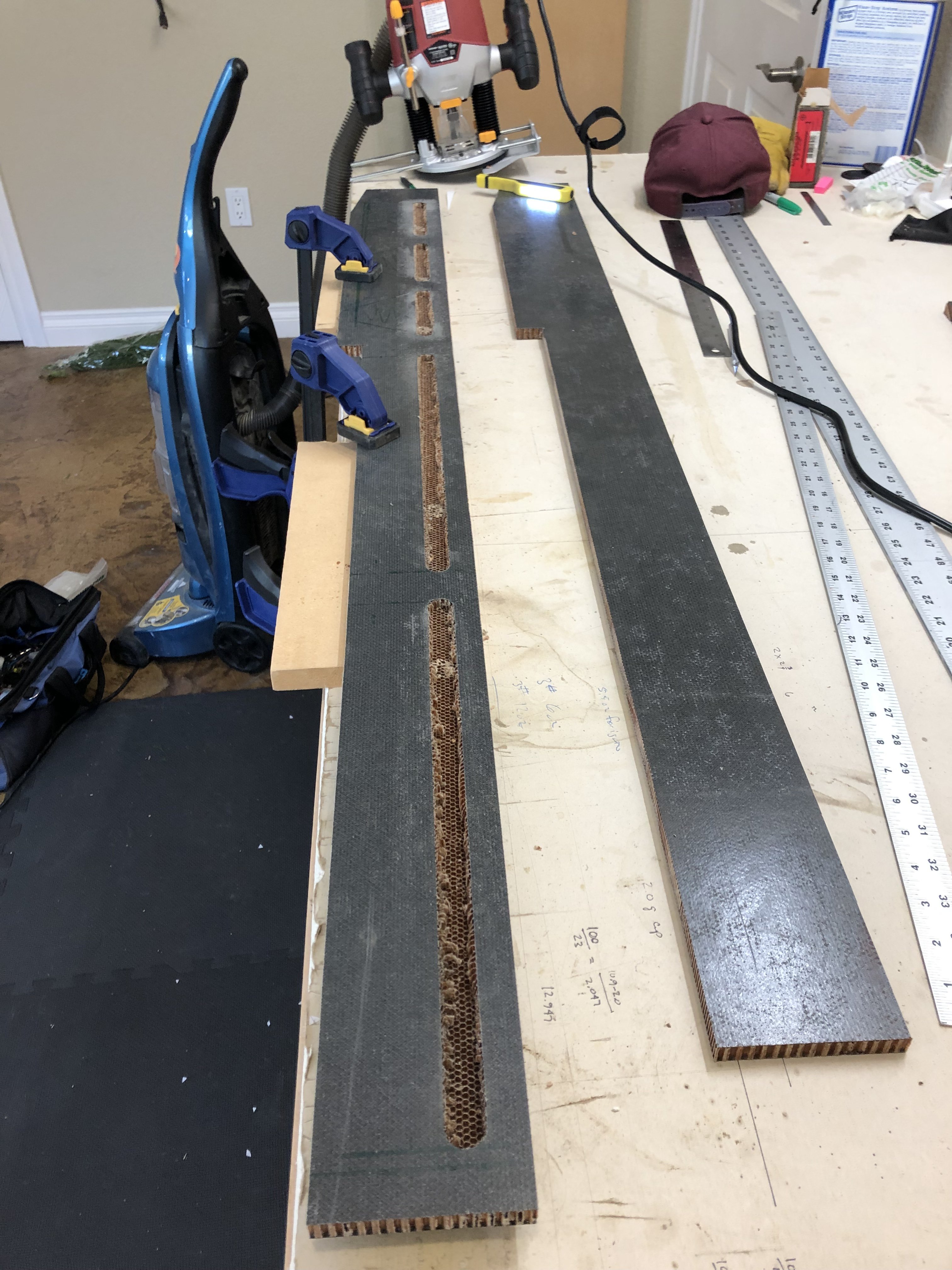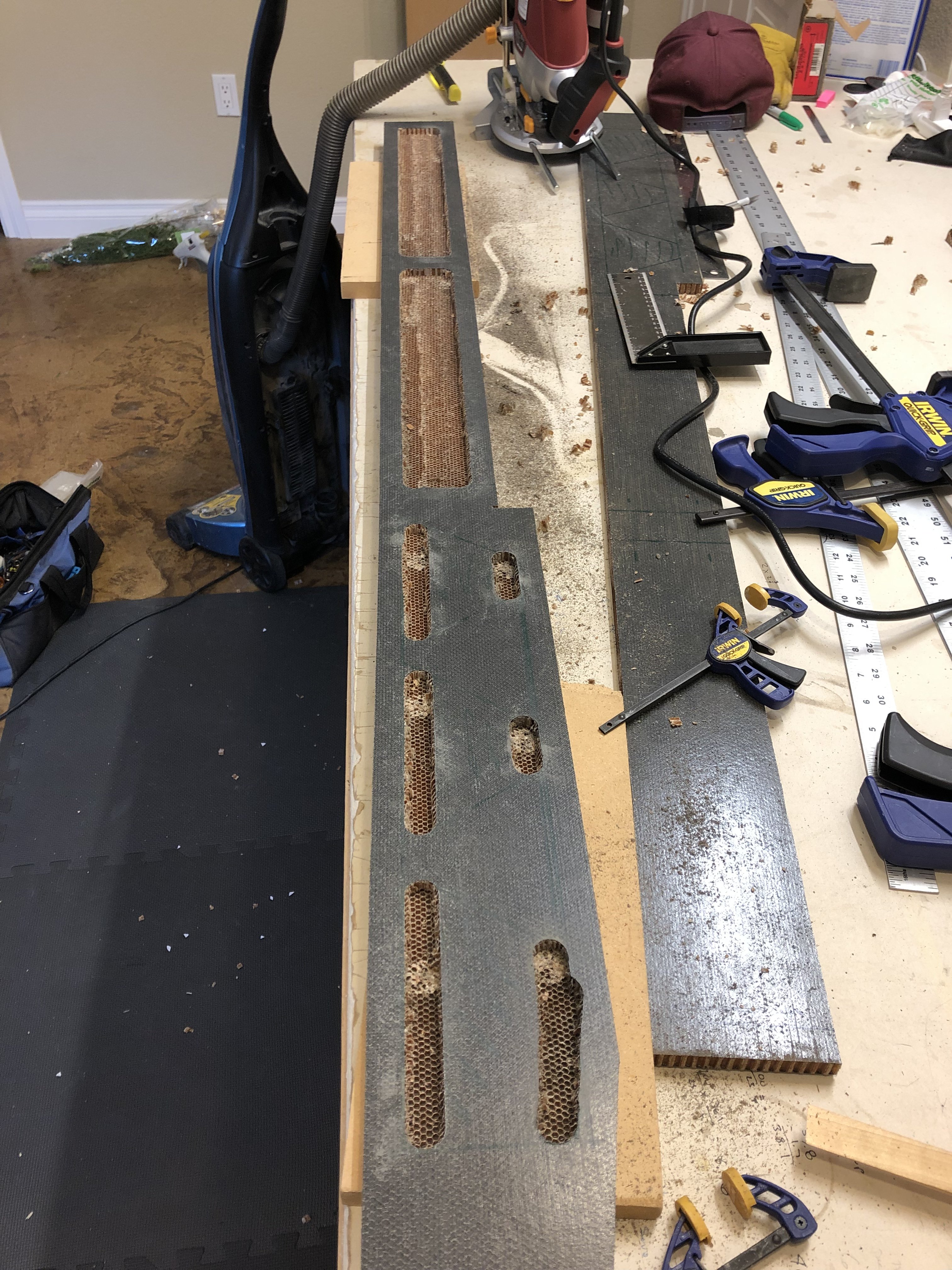 That is a great idea. Logistically, will need to get creative on how to accomplish it. Maybe I go with a bunch of 1/2" holes and create a pattern out of wood so I can use the router to plunge cut. Cutting this stuff requires a carbide tool and will need to be an end mill or router type of bit as to not pierce the outer skin. A lot of work, but I would probably be able to get the weight down to the same as previously anticipated since I could remove more material in more areas. Thanks for the idea, Mike! It is all about the build anyway...