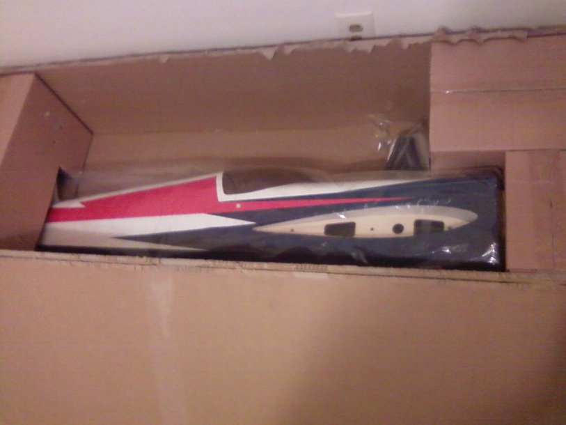 The only damage I can tell.......so far.......(rest looks ok!)........is some wood delaminated from the glass resin former of the right stab. Control surfaces come hinged and glued! (except rudder) and are huge! Came with this cool gas tank too!:big-grin: