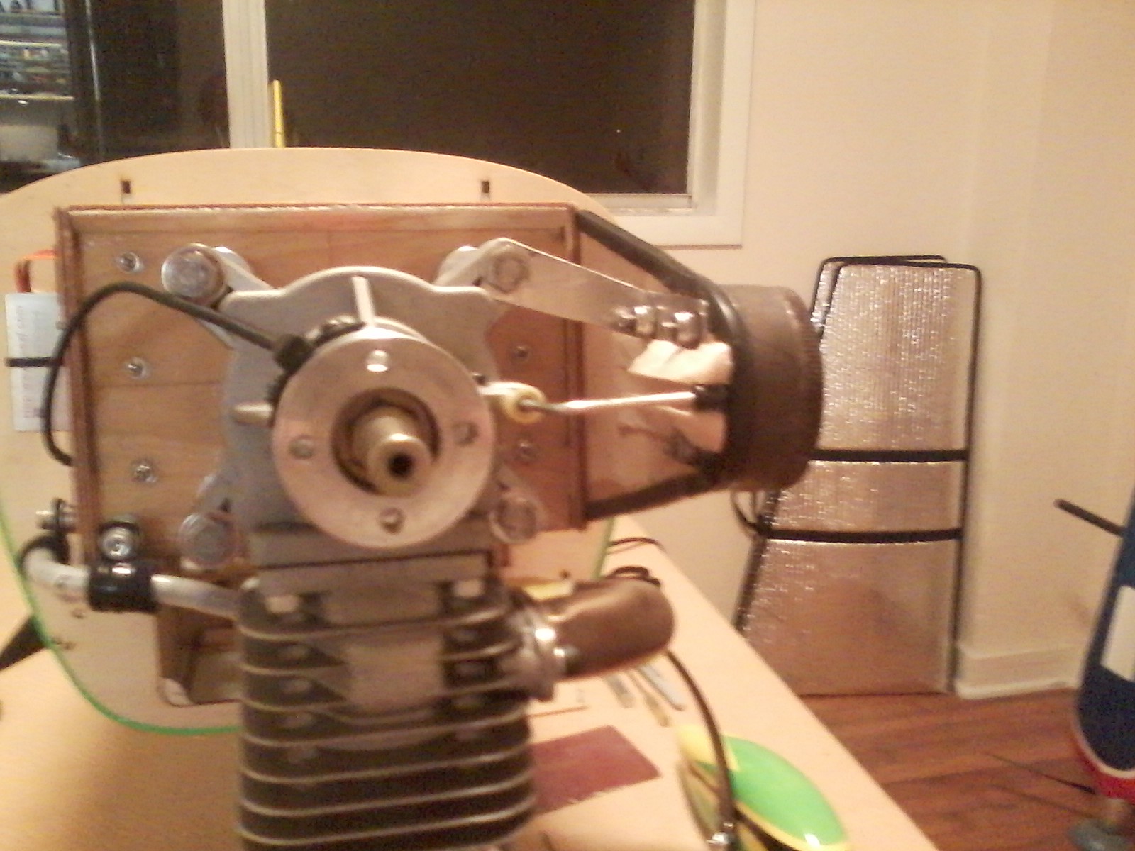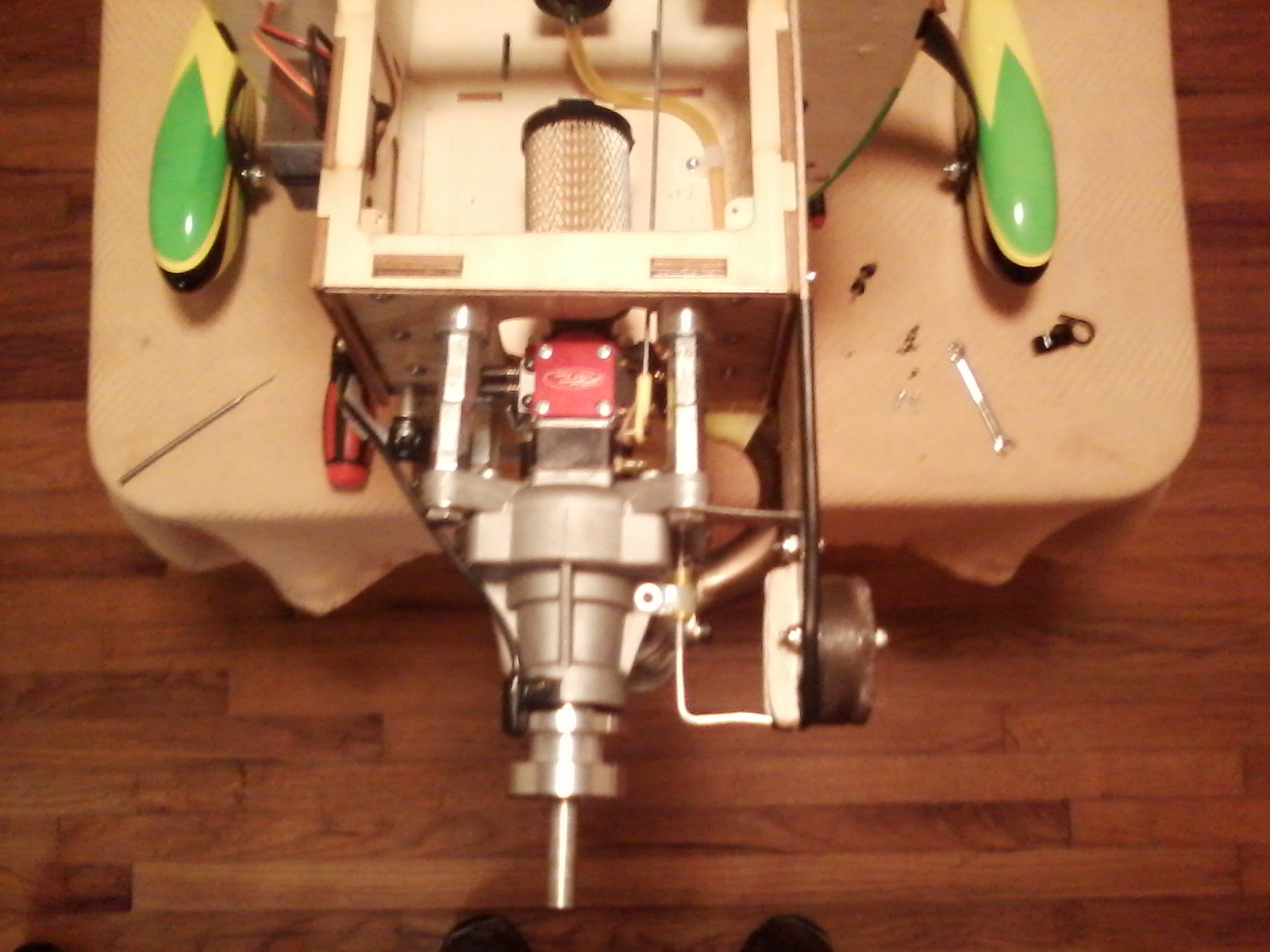 .See???Got the 8oz weight (old 3W drill guide from my 3W days) moved as far forward as I could get it. Need to make some balance tab extensions and strap the batteries back on. Then it's flight test No.2