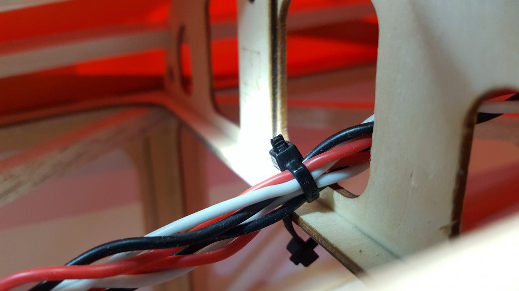 When my wires are running down the fuse and I want to zip tie them to the cross members, e.g. formers, I don't like to zip tie them directly and the zip tie cutting into them at basically a 45 degree angle. I'll put a zip tie on the former and then zip tie the wires to that zip tie. Seems like a lot less cutting into the insulation: