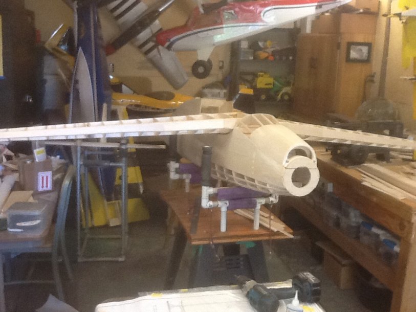 I've been working on the wing a lot lately trying to get it ready to mount to the fuse. So far I've installed 62-63 spar webs, the dihedral braces and put the 2 panels together. I've cut out for the retract supports and should be ready to fit those tonight. Without the wing tips, the measured wingspan is just over 98". There's so much work to do on this plane. But, I'm slowly getting there. I'll post some pictures this evening of the wing and the details of the construction.