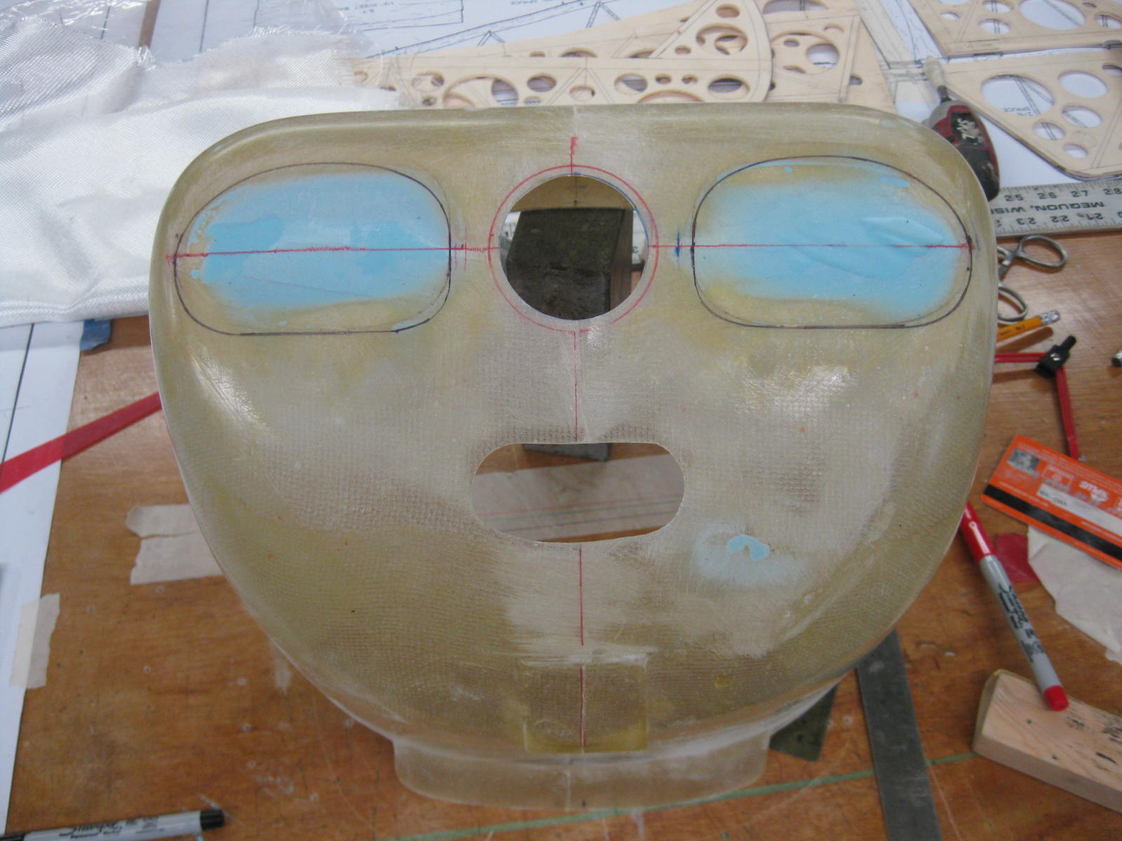 I filled in the original inlets, laid out the center lines for the engine and 2" diameter for the prop hub, then laid out the new openings. Decided didn't like the lube cooler inlet so it is getting filled in and redone. Thankfully the carb inlet is on the center line. Haven't cut the openings yet so it can be revised. What do you think?