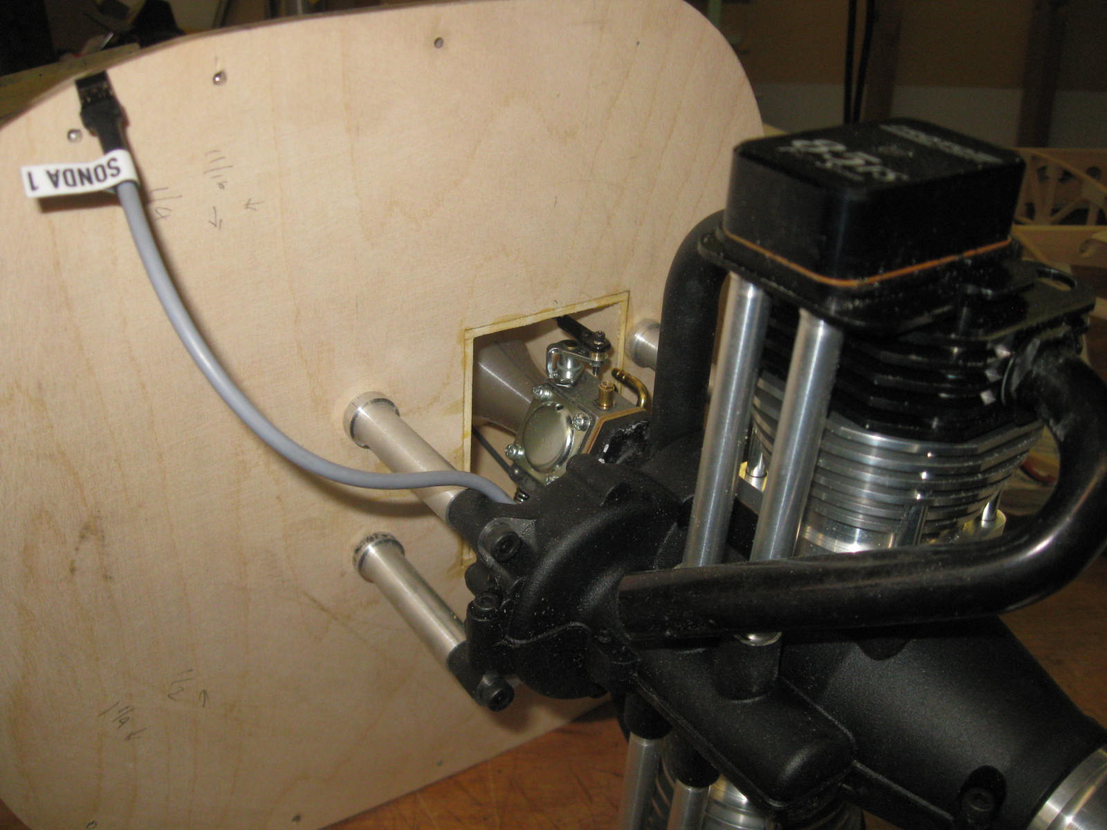 The inlet diameter of the ram is 1.25", there's about 1 1/2" from inlet of the ram to the back wall. The box area is 6.9 sq. inches, area of ram pipe is 1.23", the ram and the carb are about the same area so there is about 4 1/2 times free area to that of the pipe. I was erring on the side of caution when I sized the box (I Hope!). I don't expect to be at full throttle very often anyway. I have the radio on the Cherokee set to 60% of full throttle and rarely open it all the way. I believe scale planes should be flown in a scale manner, long roll outs, low climb rate and the like.