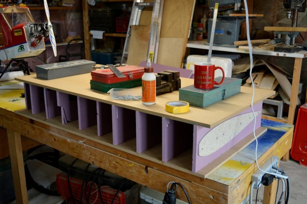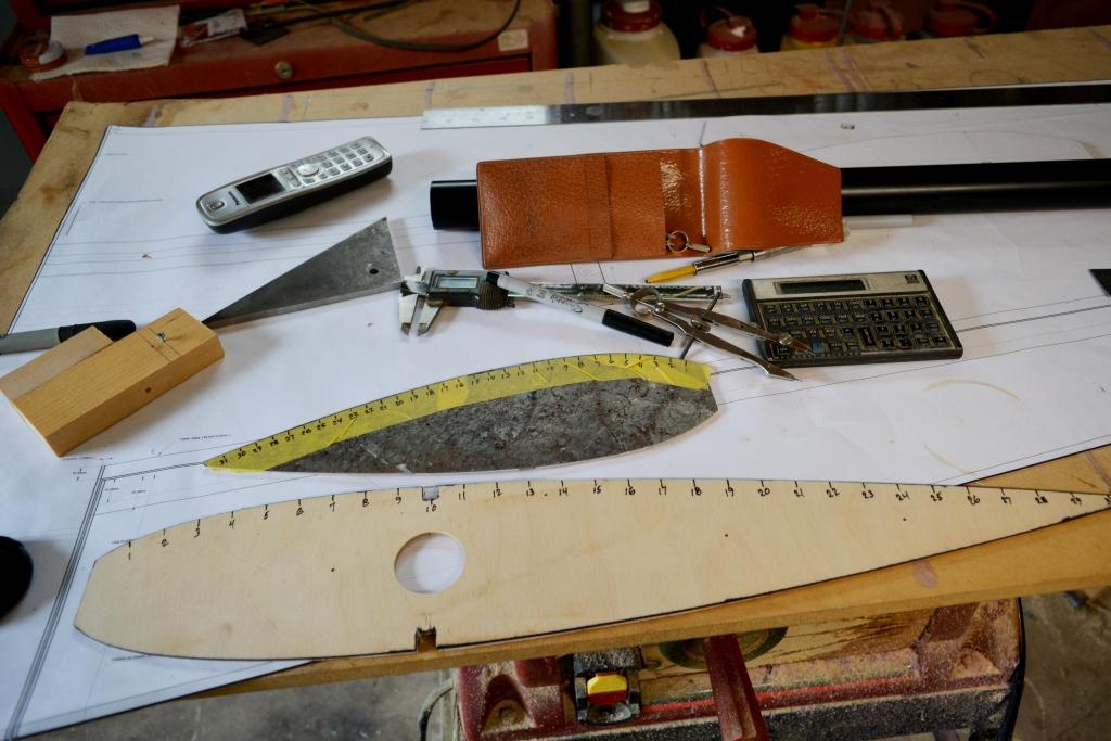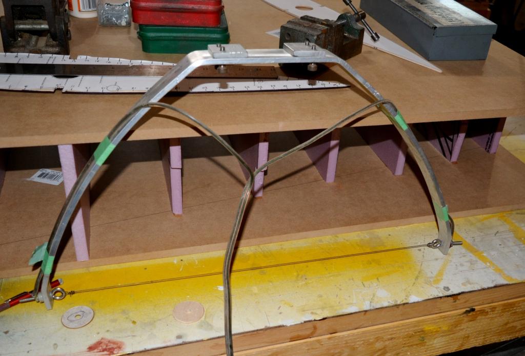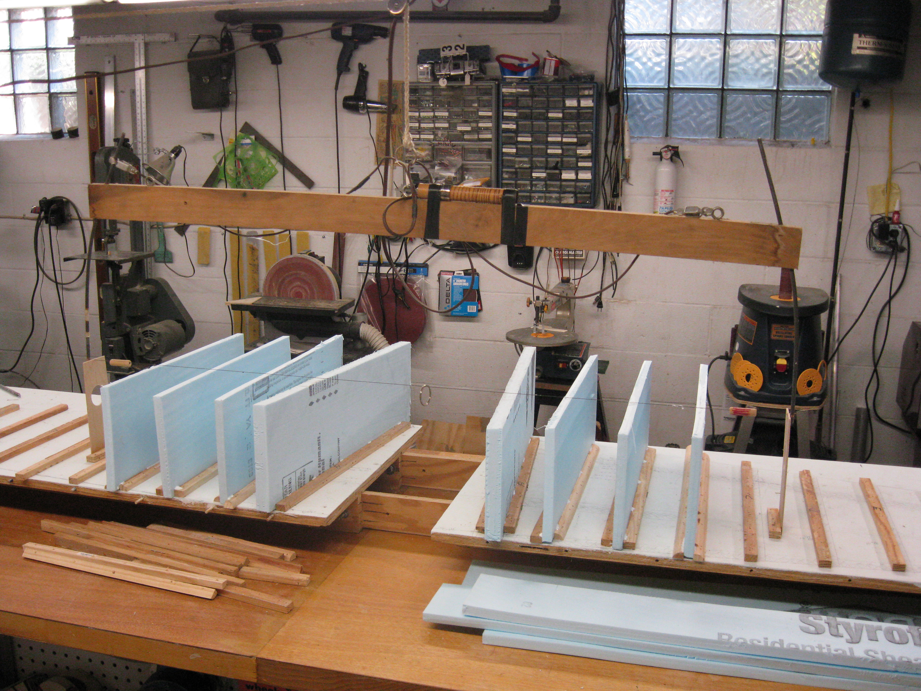 a bit more done, in preparation of the actual hotwire, you will notice an aluminum landing gear which I converted to a hot wire cutter, for the tube holes in the first few ribs,