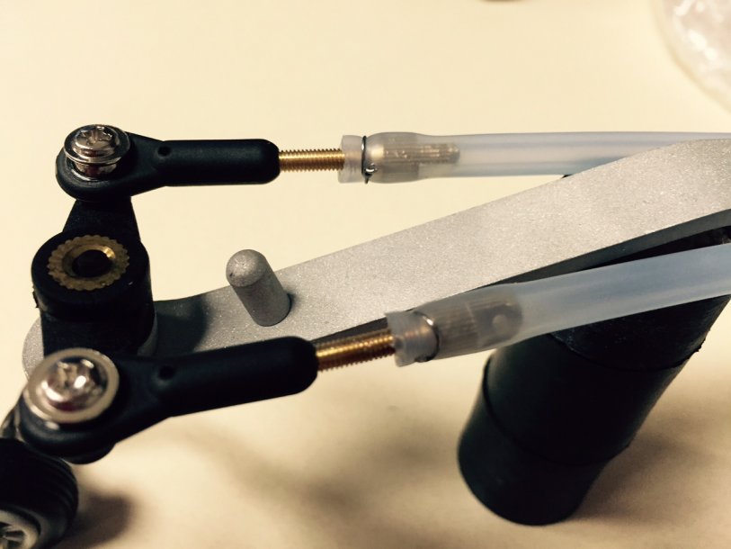 Played around with an idea that I seems very strong with parts on hand. I took some extra sets of rudder pull pull swivels and rounded off the sharp edges where the cables go through. This presses in tightly into silicone fuel tube and I pressed in just until it went down to the threaded rod. I am not a big fan of the cable ties but they will work fine so I used some stainless steel wire ties that are sold for fuel tubing. I am thinking of adding this to my 91" EF Extra.