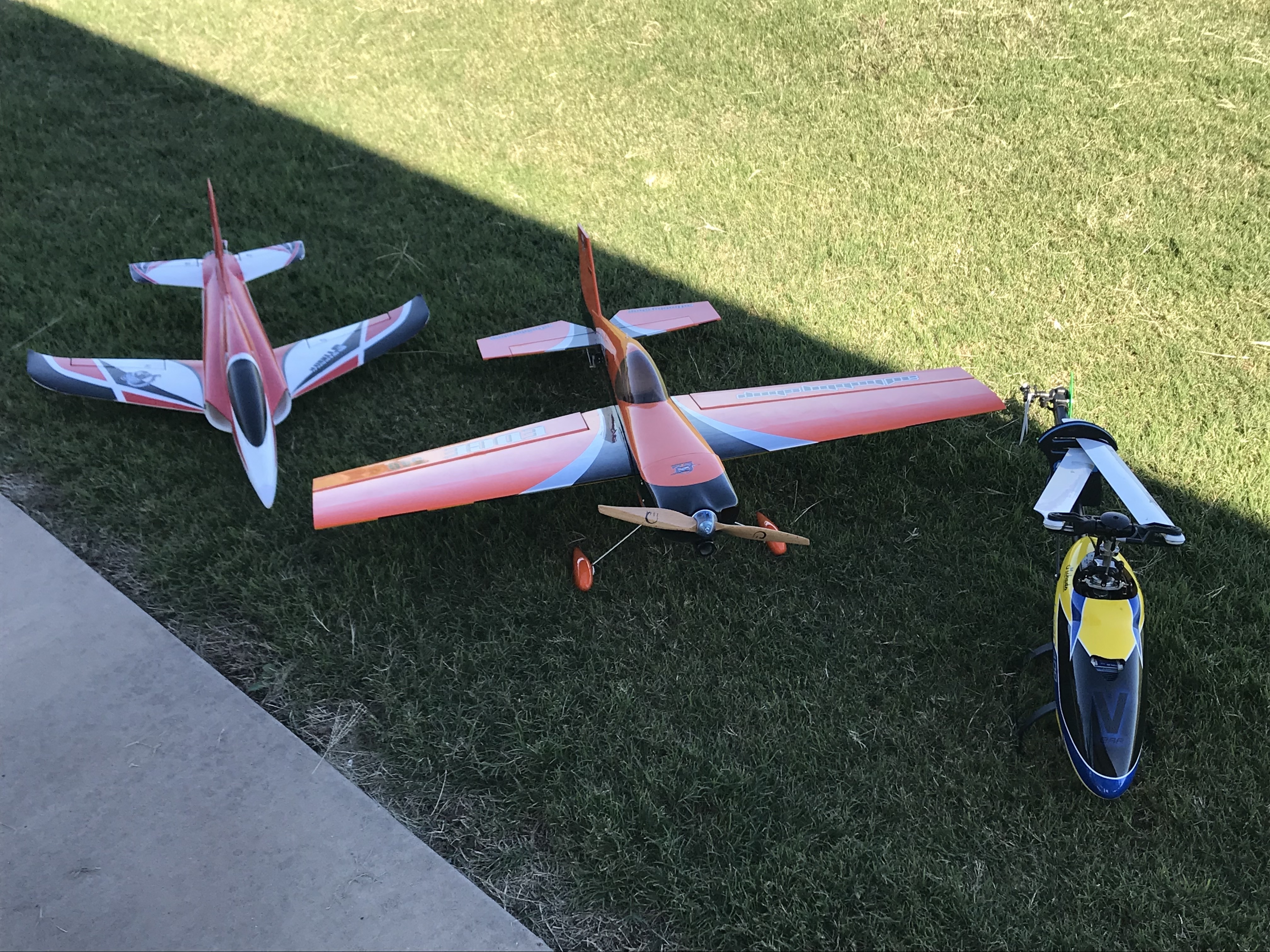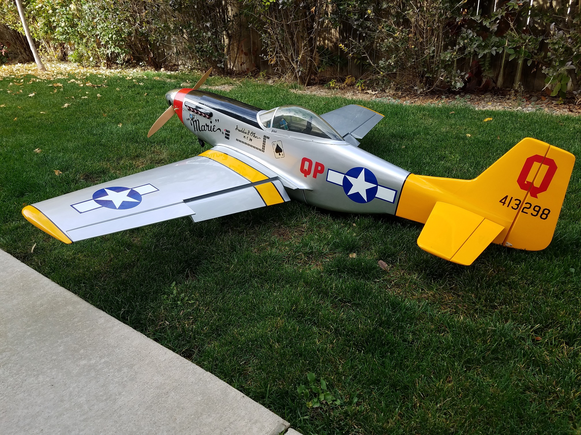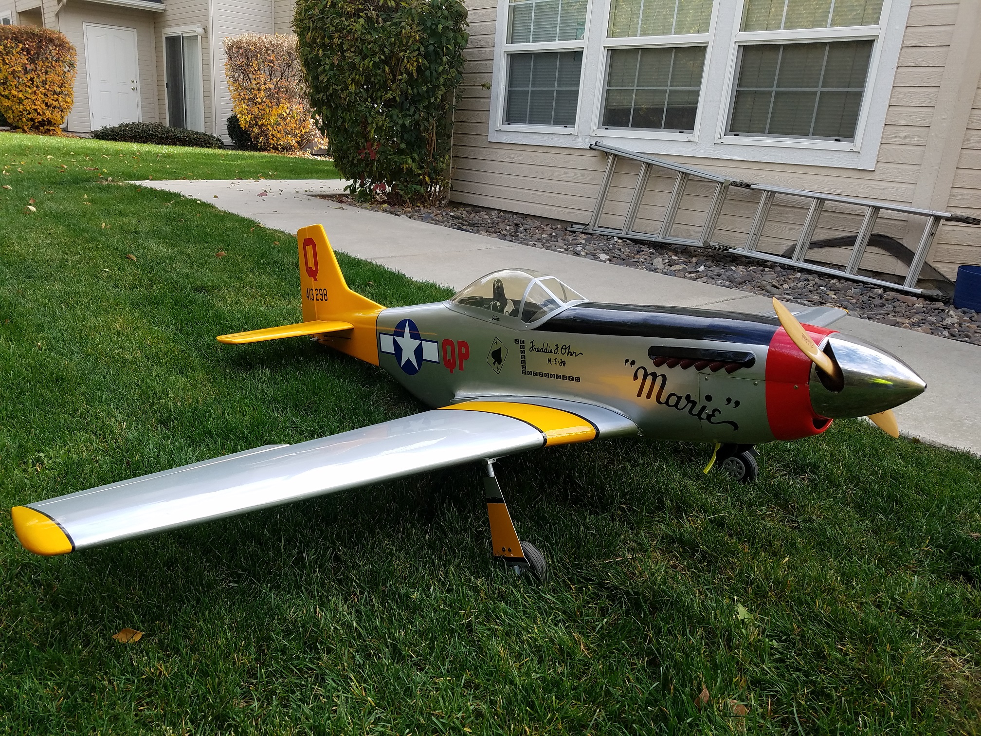 Actually, the wing loading is way less on Marie than ole Blue nose. Marie comes in at a whopping 16 pounds. While the little guy is right under 11 if I remember correctly. 78" vs. 65". And actually Marie is considerably far more forgiving. She's quite high spirited. But incredibly well behaved. At least this is what I remember from the last time I flew her. Which was five some years ago. No, couldn't get her in the air today as planned. The threat of storms and rain kept me at bay. Winds were gusting to 17 across the run way. Not a good time to attempt a re-maiden. But I did get her fired up and man she sounds great. I expect the big Stang is going to be very manageable. Yes a bit heavier. But far more stable. The rule of thumb I've found to be an absolute with no questions of doubt is, bigger planes just simply fly better. That's all there is to it. My 50cc Edge flew dang good. Butt load of fun. My 100cc Edge is just as much fun and every bit as capable as my 50cc was. But so much more stable it can't even compare. My sons big PAU Edge is even more stable, responsive and able to do anything the smaller ones can do. Out sizing and out weighing both of them by a ton. It just flies better and is more stable.