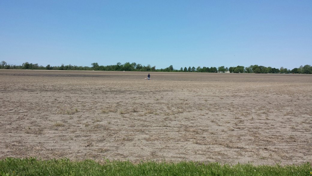 I had brought my Composite ARF 30% Extra 330L. I figured I would fly it, then let Tony have a turn. Well about 5 minutes into my first flight the engine just died at about half throttle. It had been running great before that. I was in just about the worst spot I could be. I was about 50' high and had just crossed over the beginning of the runway heading into the wind. I wasn't going fast enough to circle around, so I just kept going straight and hoped for the best. That part of the runway is about 600 feet long then there's a road then a farmers field. It cruised right over the runway then over the road at about 5' high, then out over the farmers field. That field sits a little lower than the road so I could see the plane, but not the ground. I just kept flairing and hoping, and luckily that field was bare and pretty smooth because it landed pretty smoothly considering where I was. Tony walked out and got it for me and we were happy to see only one gear leg flexed enough to damage the fuse side a little, but not that badly.