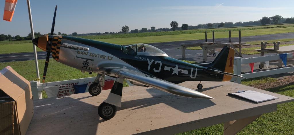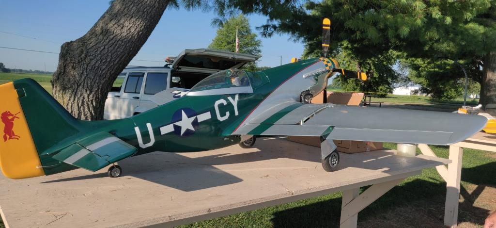 Our club had our Big Bird event today. Unfortunately I had work to do, but I did manage to spend a pile of money there. A club member donated an old Byron P-51 with the belt drive 4 blade prop system to the club to be auctioned off. The club president was kind enough to bid on it for me and I won it for less than my top bid. I went out and got it after work. The plane is around 25 years old, and has never been flown. It will need lots of work and updating, but I've wanted one since the late 80's.