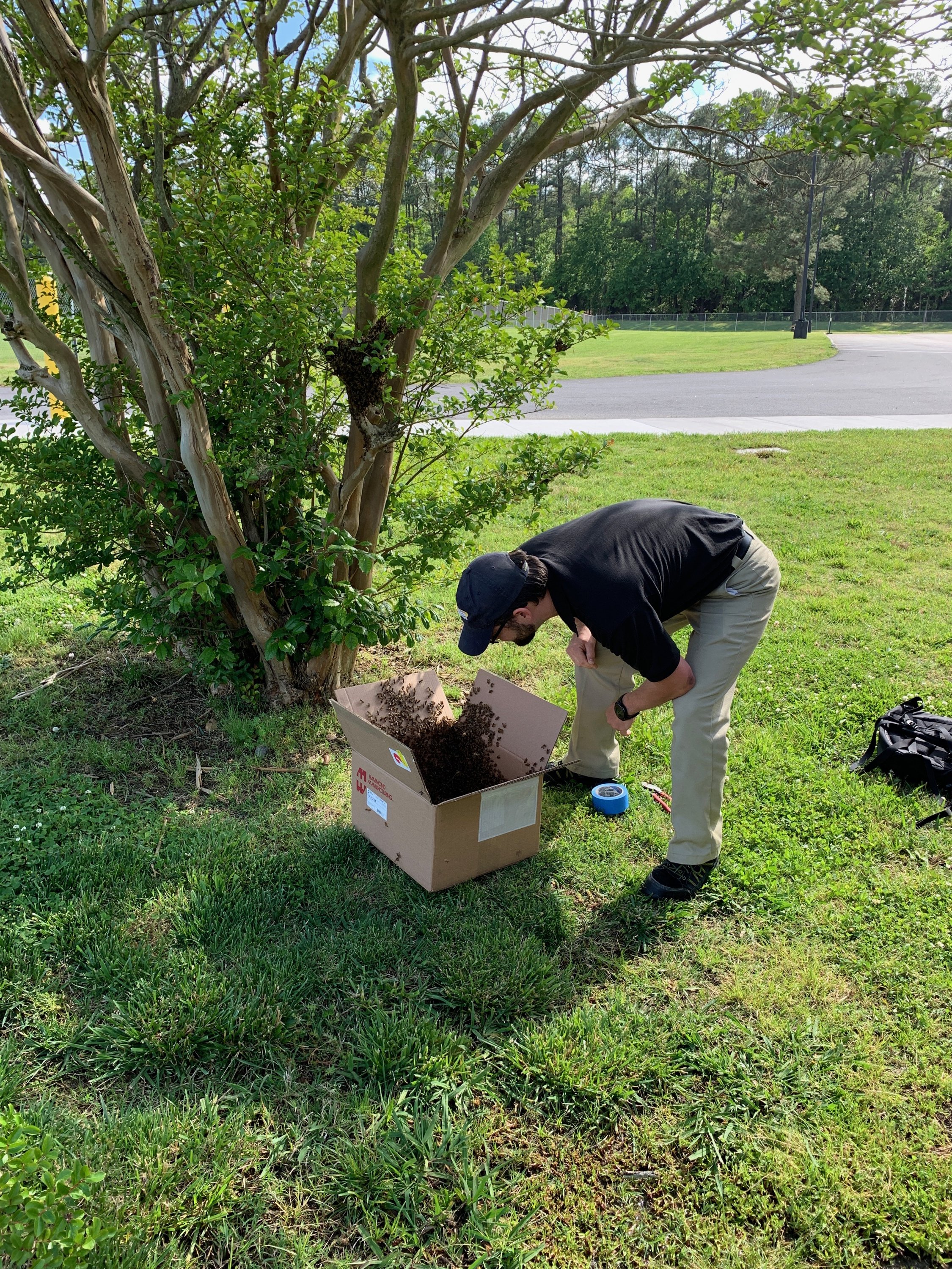 Very cool. Same thing happened at my wife’s school a couple years ago. Had a big swarm in one of the trees and just so happened that the janitor was also a bee keeper. So he just took them home.Today at work we came across a swarm of bees hanging out in a tree. Lucky for my coworker who keeps bees. He didn’t have any of the stuff he would need so he improvised. Just a random scrap box, the first roll of tape he could find, and a pair of cable cutters. Literally cut the branch, placed it in the box, and loaded them up in the back seat of his car. They seem happy in their new home now. Pretty cool to watch this happen. View attachment 114812View attachment 114813View attachment 114814View attachment 114815