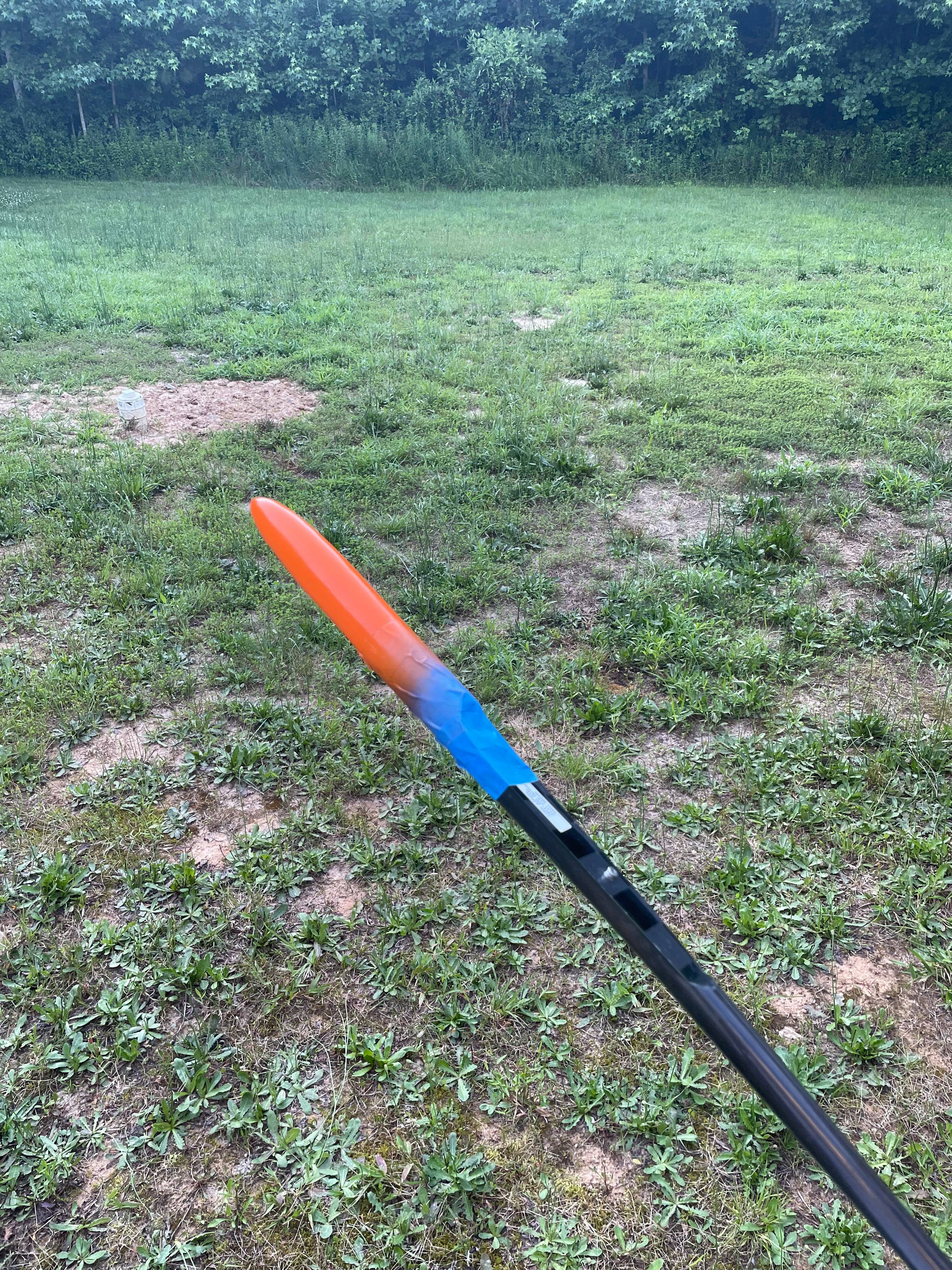 Decided I didn't like the look of the bare kevlar nose so I got the spray paint out. Orange shows well for me in the air. Ignore the tall grass its been to wet in my back yard for the mower the past couple of weeks.