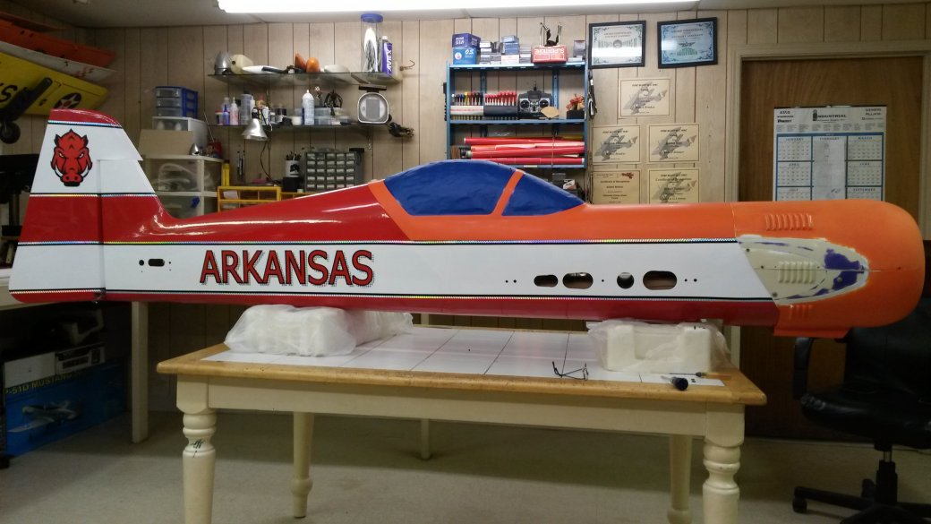 Dang, that is really nice Robert. Sooo, I don't suppose your wifey wants to paint another pilot bust huh?? LOL.... That Suk is going to be one heck of a nice change of pace from the original.I added a black pin stripe between the white and holographic chrome stripe on the fuse, wings and stabs. masked off the cowl and started the white paint. Also the pilot and wheel pants. I was having a lot of trouble getting paint to spray right and as it turns out a math error (doh) was the cause. I was instructed to mix paint and catalyst 1:1 then mix with reducer 1:1. I was mixing 2 Oz. of paint with 2 Oz. of catalyst. Then 2 Oz. of reducer. I should have been adding 4 Oz of reducer. I managed to get a couple of coats on and have sanded and prepped for a third when it warms up a little.