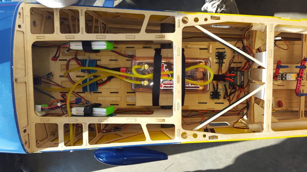 I worked some more on getting the 330 switched over to the Jeti. Seeing as how I am not running a hv setup, I still need my electronic switch between the batteries and the regulators, bummer. I had the other magnetic switch nicely concealed but now it will be replaced by a remote switch for turning the plane on after I turn the power on to the bird. The wiring is a bit cleaner now also.