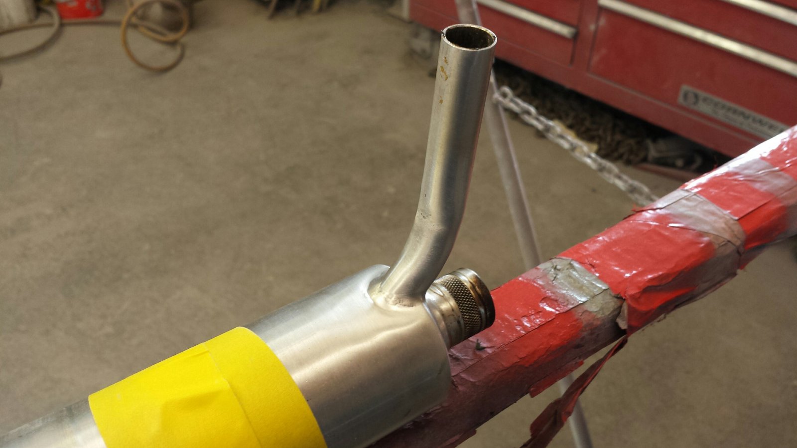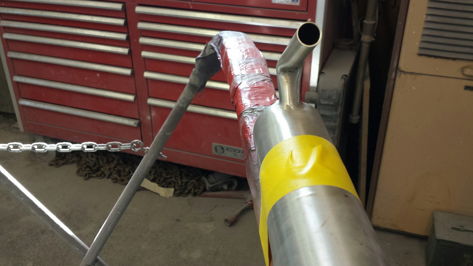 For the canisters I taped them down to a parts rack at work, and used a rod that fit nicely in the stinger and applied a little upward pressure while heating the inner and sides of the kink. That got the major part of the kinks out, but I needed to use a small hammer and tap very carefully on the high spots, while resting the high spots on the other side on a block of wood. When I was happy with the results I sanded off all the tool marks and then went over it with a red ScotchBrite pad.