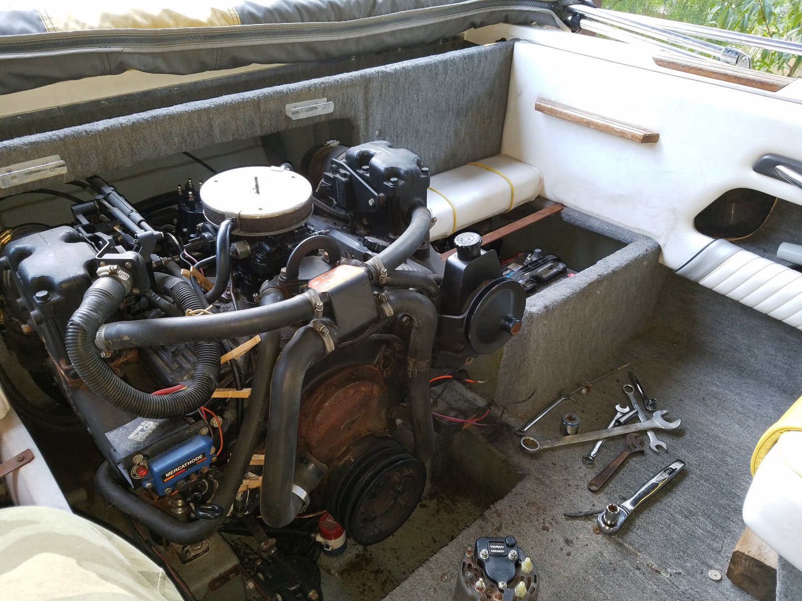 So far we've ordered a new alternator, water pump, timing chain cover, trim limit switches, starter motor, fuel pump, spark plugs, dizzy cap/rotor, plug wires, ignition coil, new battery terminals and hold down strap, and probably something else too I'm forgetting but I'll discover after I get it