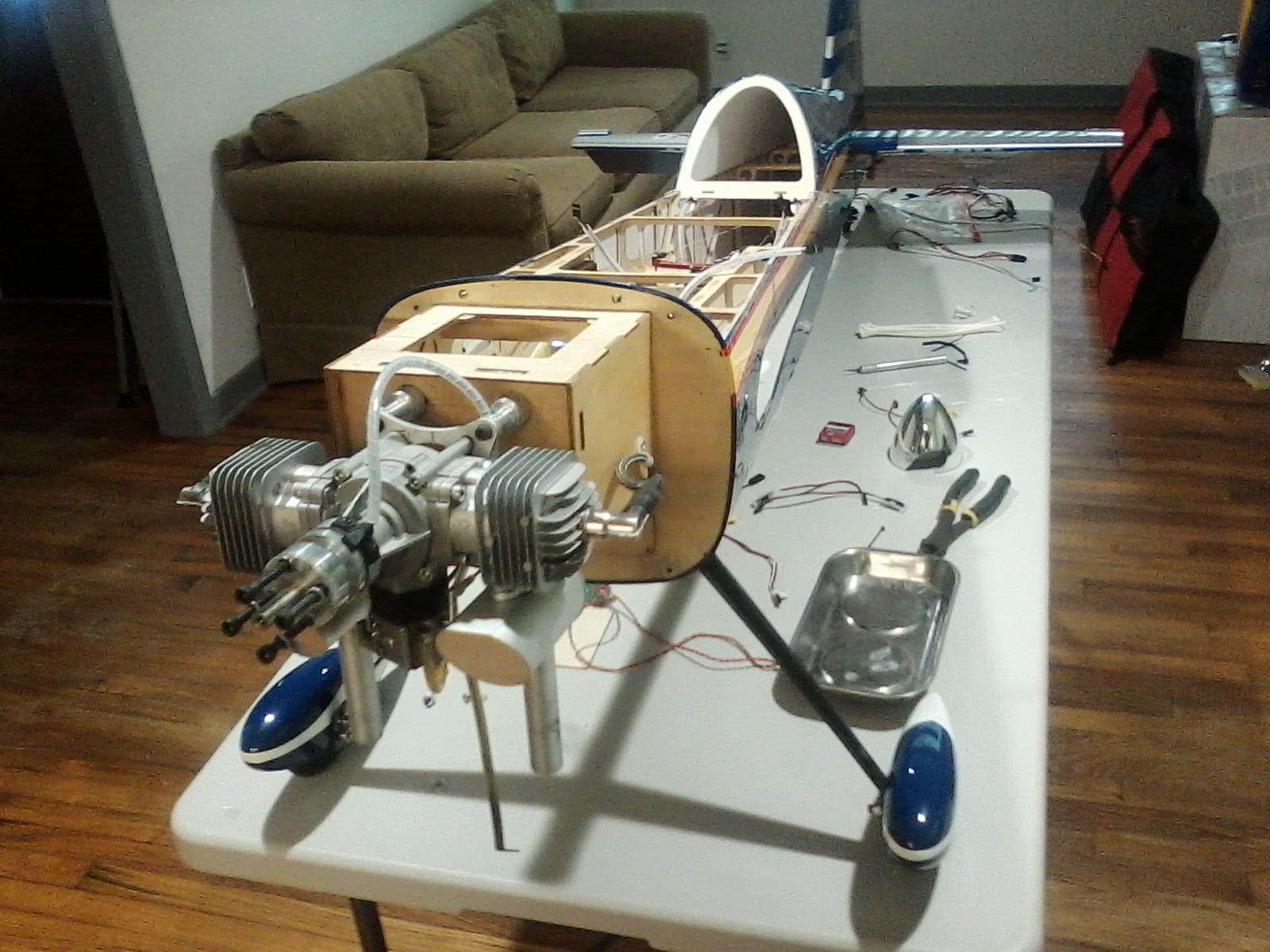 . But hopefully it will be a better, cleaner, more reliable ride for the owner when it is finished. I flew it last Sunday and it did fly extremely well but was pretty nose heavy. The batteries drained very quickly too. So better wire management, engine cooling, engine mounting, receiver / gyro mounting, vibration and heat safe guards, new batteries with an IBEC, balance and a thorough control surface linkage / deflection check and adjustments. Of course my ignition and carb parts showed up today when he brought me this to do