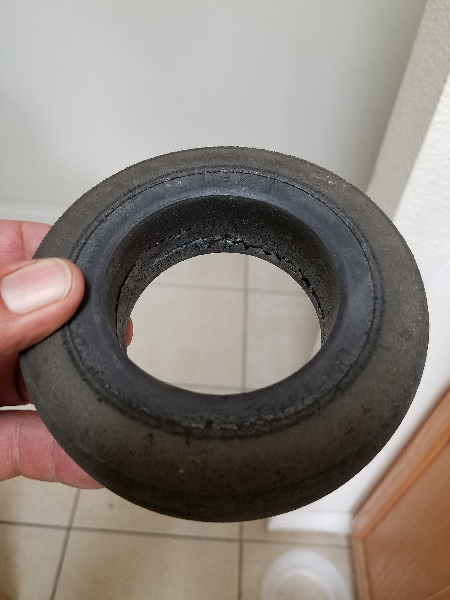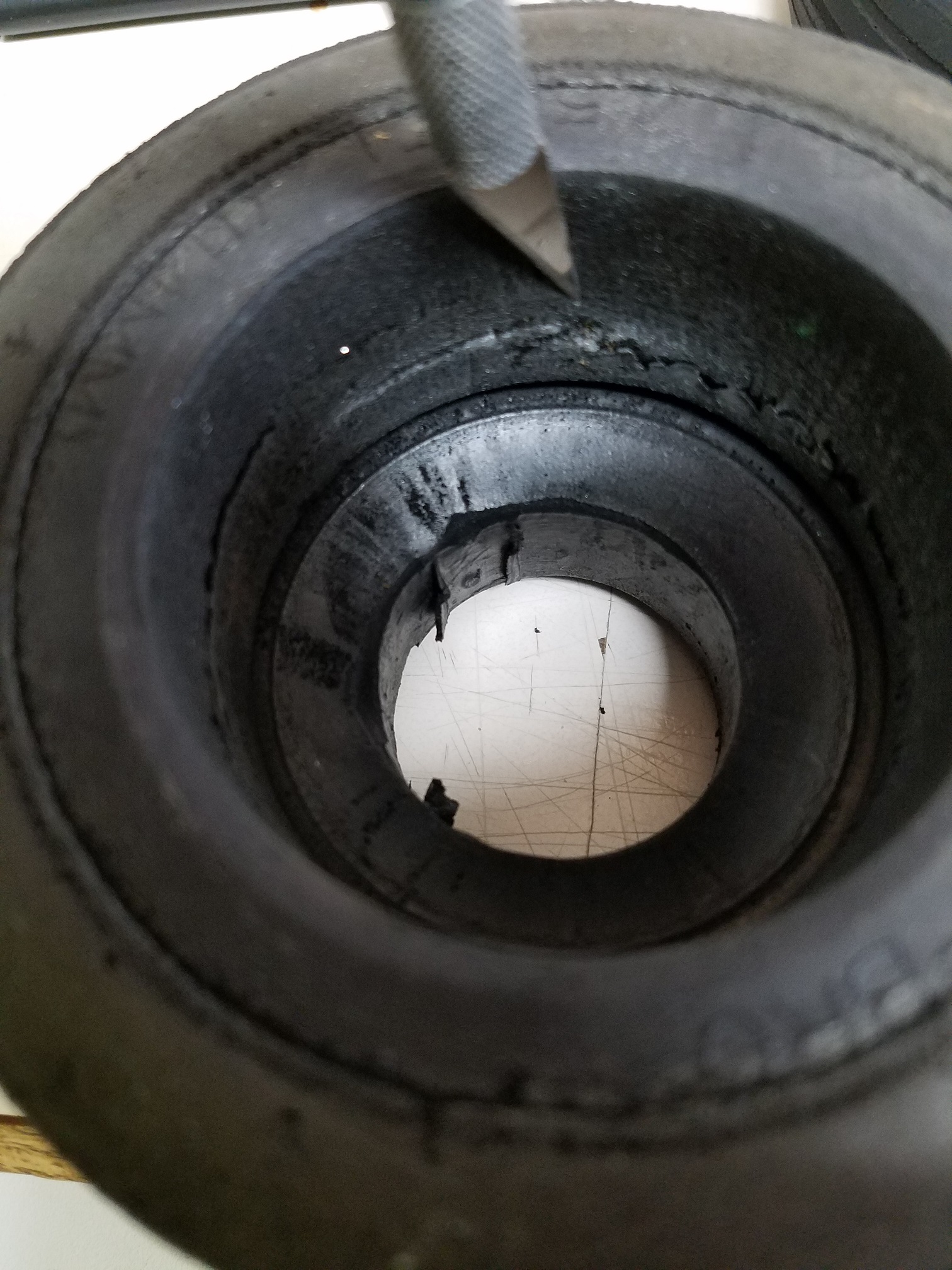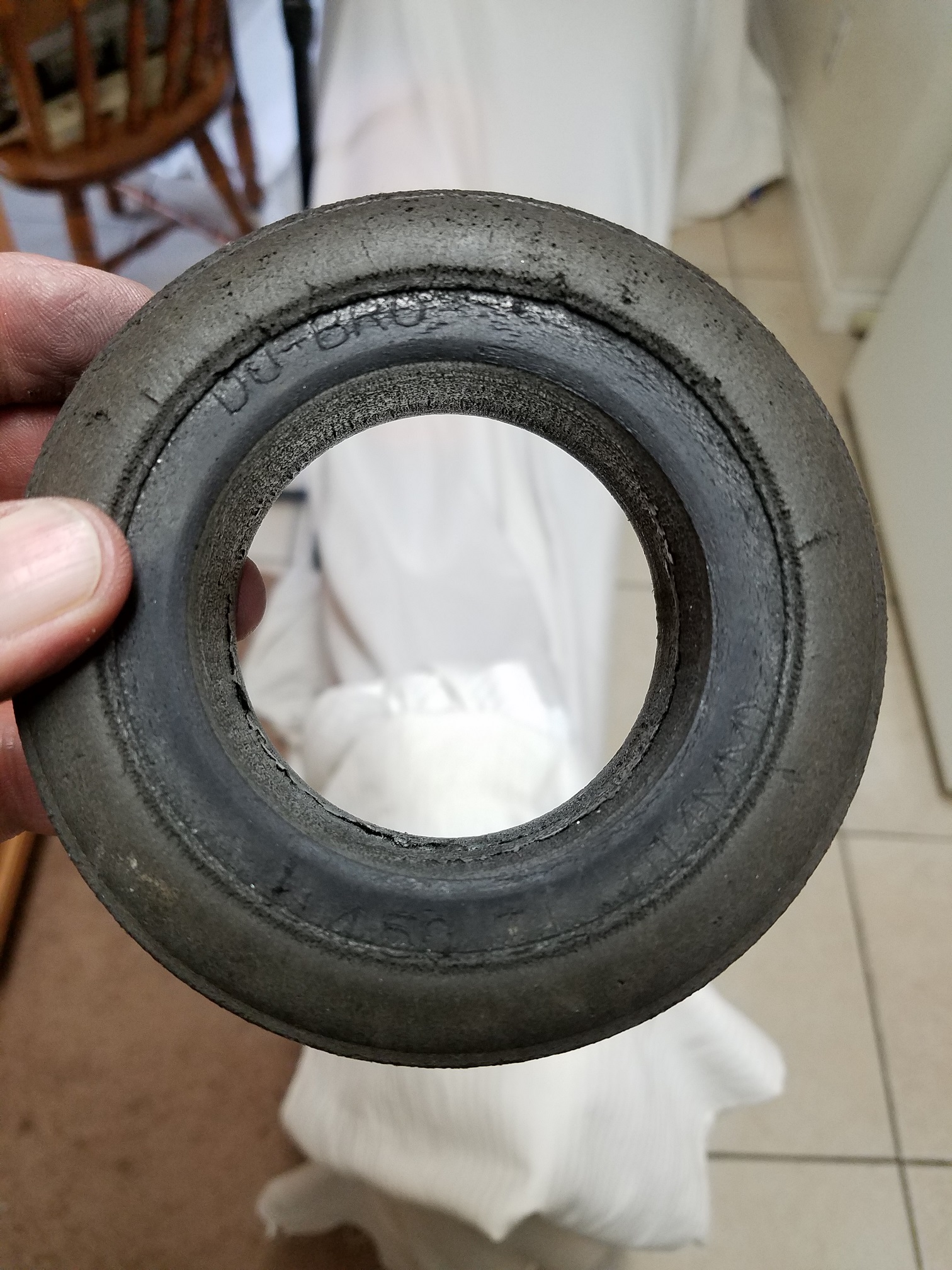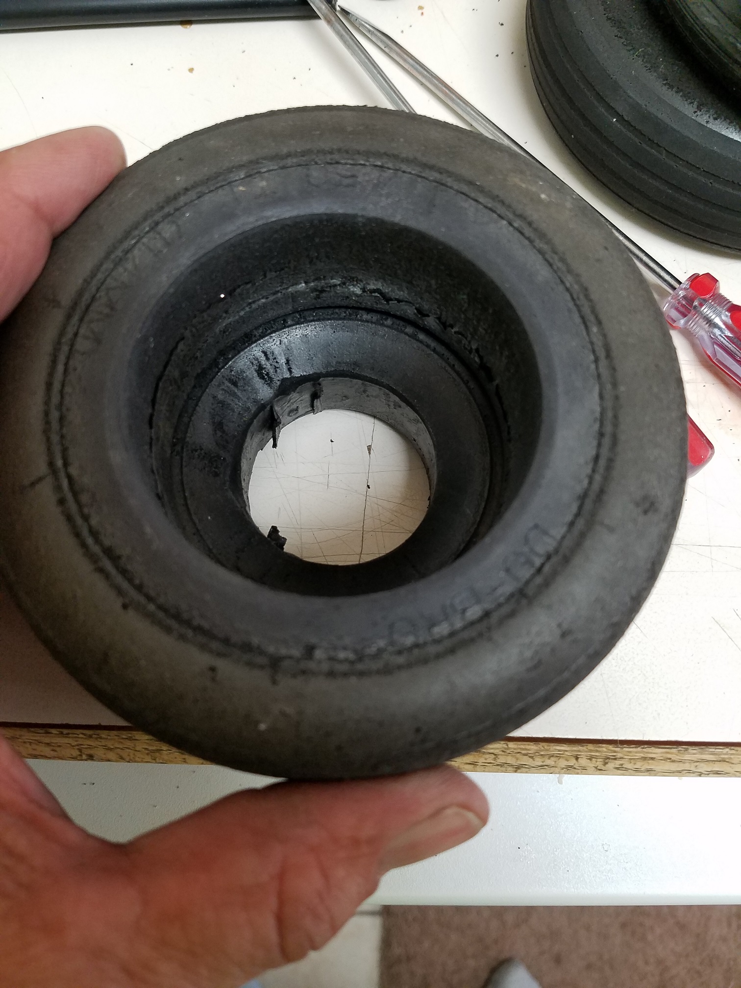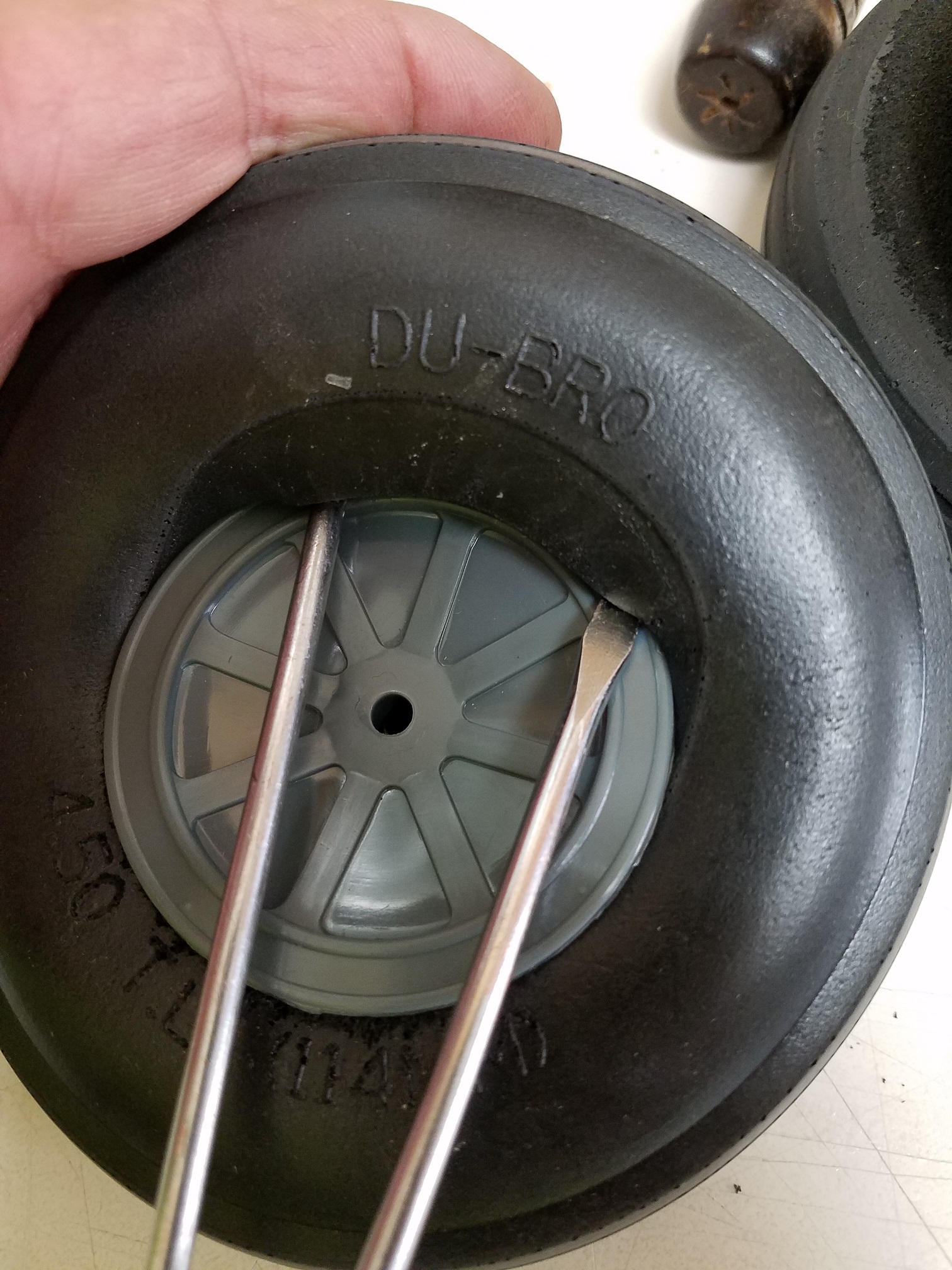 Plus, I decided to put a more appropriate size wheel on the Pitts. What ever shall I do with them gorgeous wheels then? Oh well, I know a baby Yak that needs some wheels. Here is what I did. I tinkered around one evening and removed the original tire using a couple of screw drivers like we used to use tires spoons to remove an old car tire from a wheel. What do you know? They are Dubro tires. With the centers cut out.