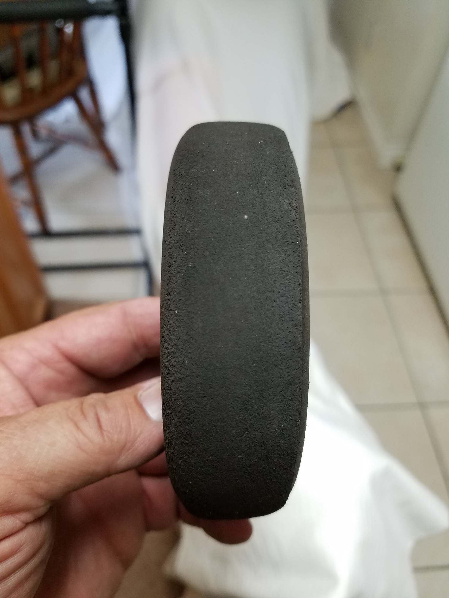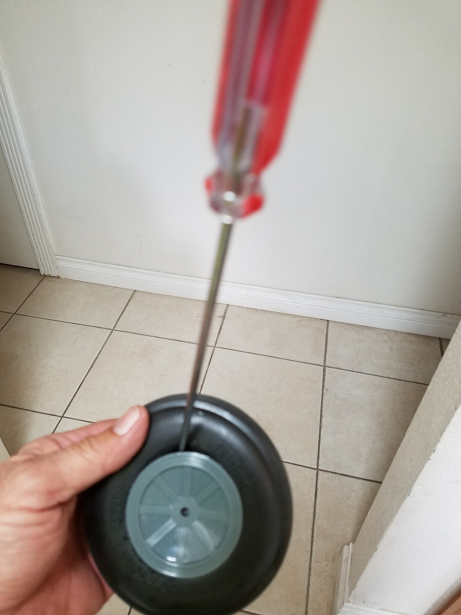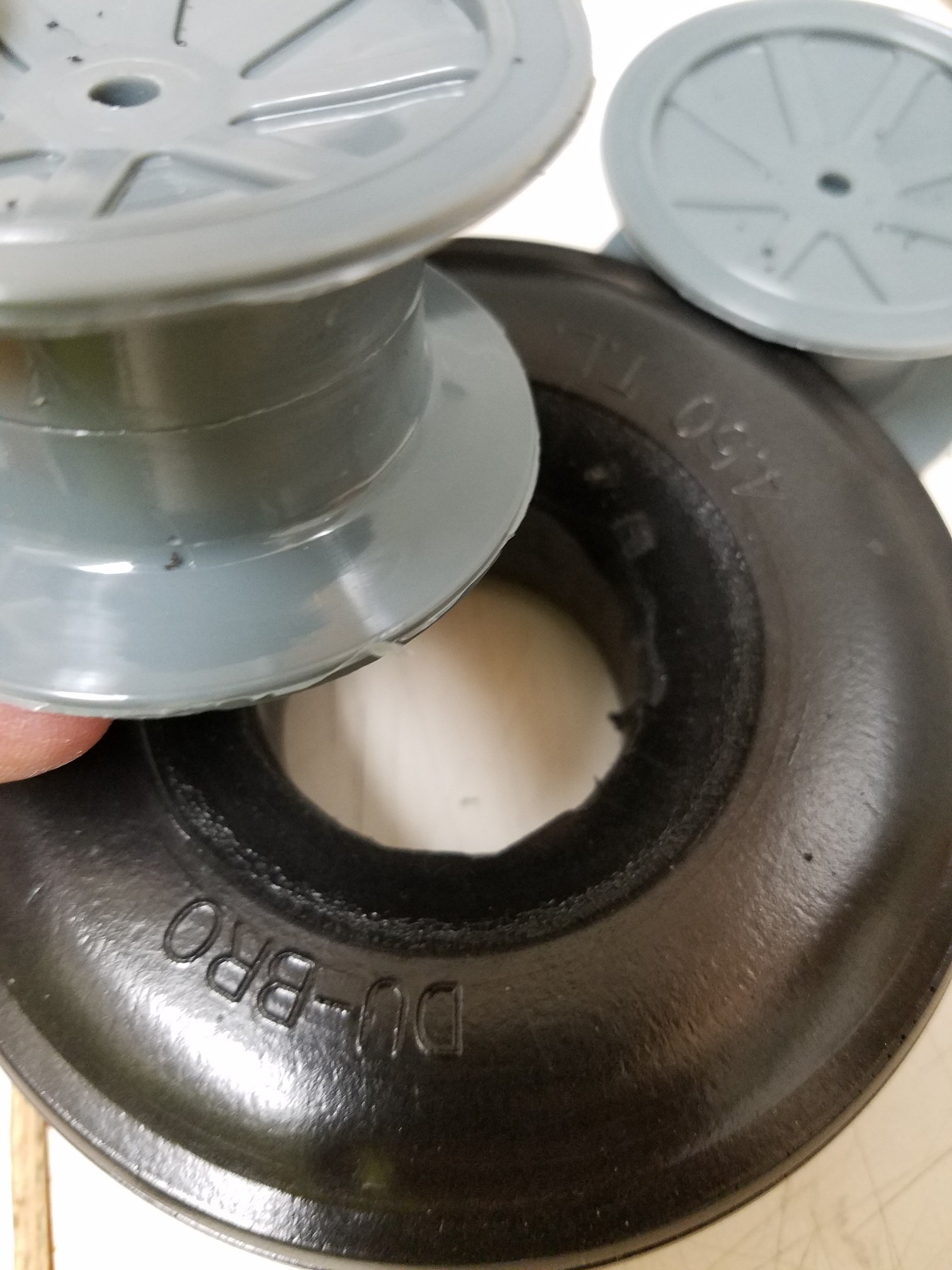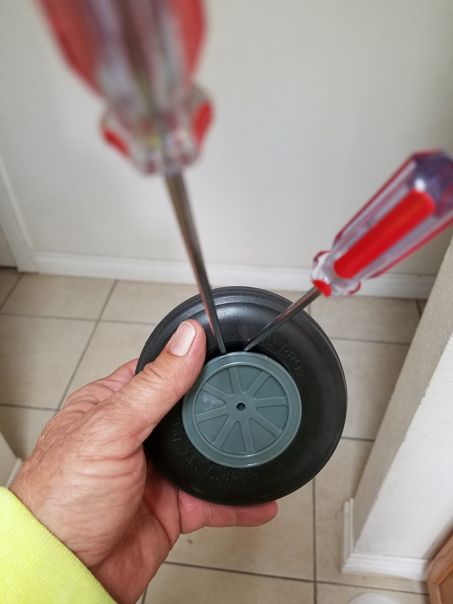 Ok, now with the tire centers cut out, it was time to re-install the newly cut tires to the White Rose wheels. My first attempts before I even cut the 4.5" Dubros was with a 5" that I had removed from my broken Yak wheel. You all remember that right? Ugh. Anyway, I used the same method to install as I did to remove the tires. Two screw drivers like the tire spoons. It worked ok, but doing so has a tendency to "tear" the foam tire. I didn't want to do this to the new tires, so I opted to "MUSCLE" them on. A little difficult, but no tears. Once they were on, a little side wall pushing and the beads sat right down where they needed to be.