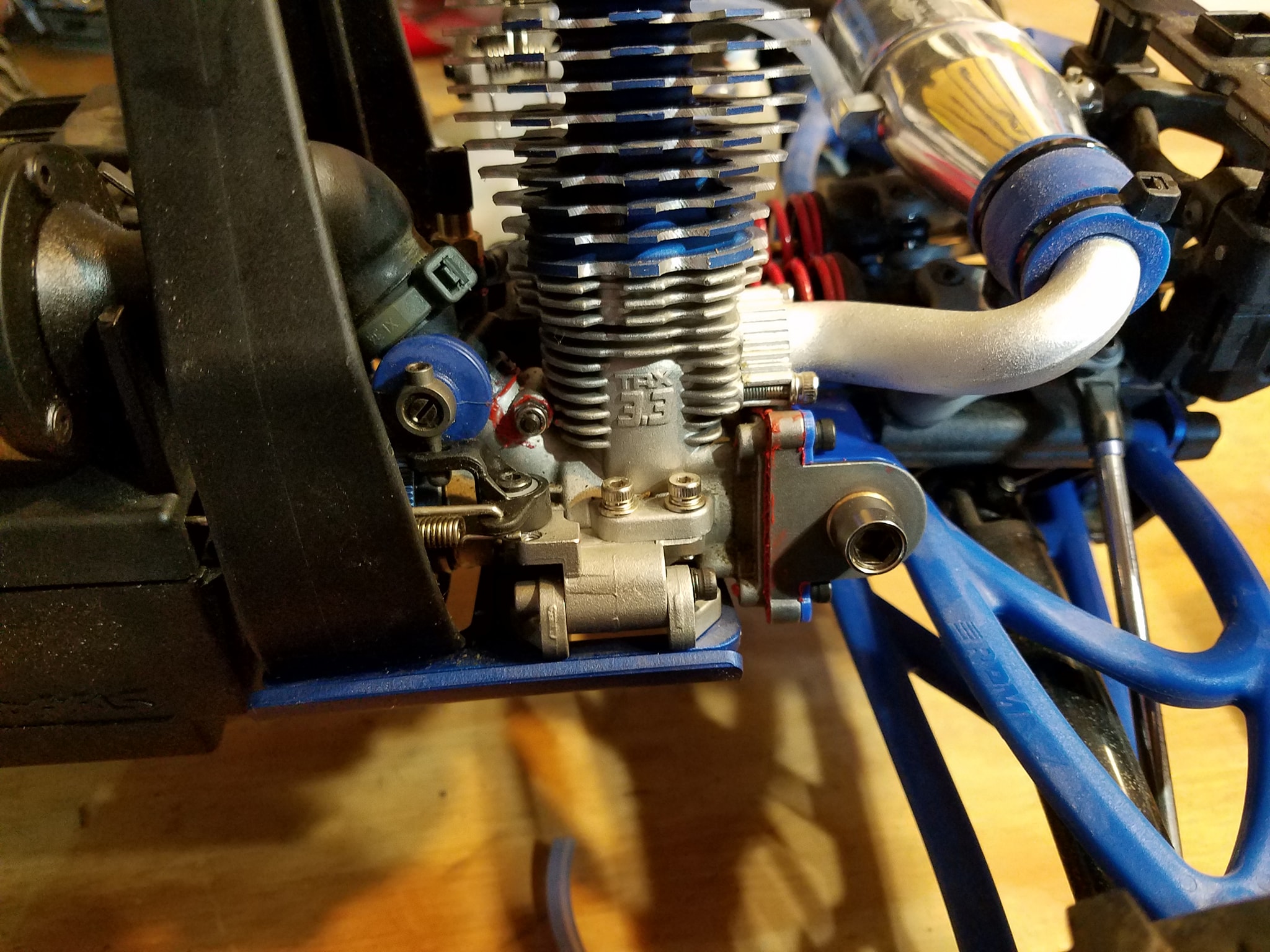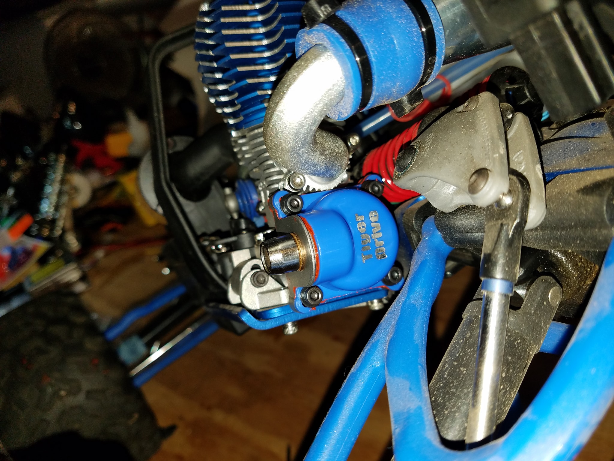 Many moons ago when I last ran my Traxxas Revo 3.3 I got fed up with it because it wouldn't hold its tune and never idled worth a damn. Plus it always took forever to start with the "EZ" (yeah right..) start system. I attributed this to low cranking speed and not getting enough heat in the glow plug, and possible air leaks when it was running. So last night I received my Sullivan Tigerdrive unit in the mail and set about getting it installed to the engine, as well as work on sealing up all possible areas that could leak with red RTV.
