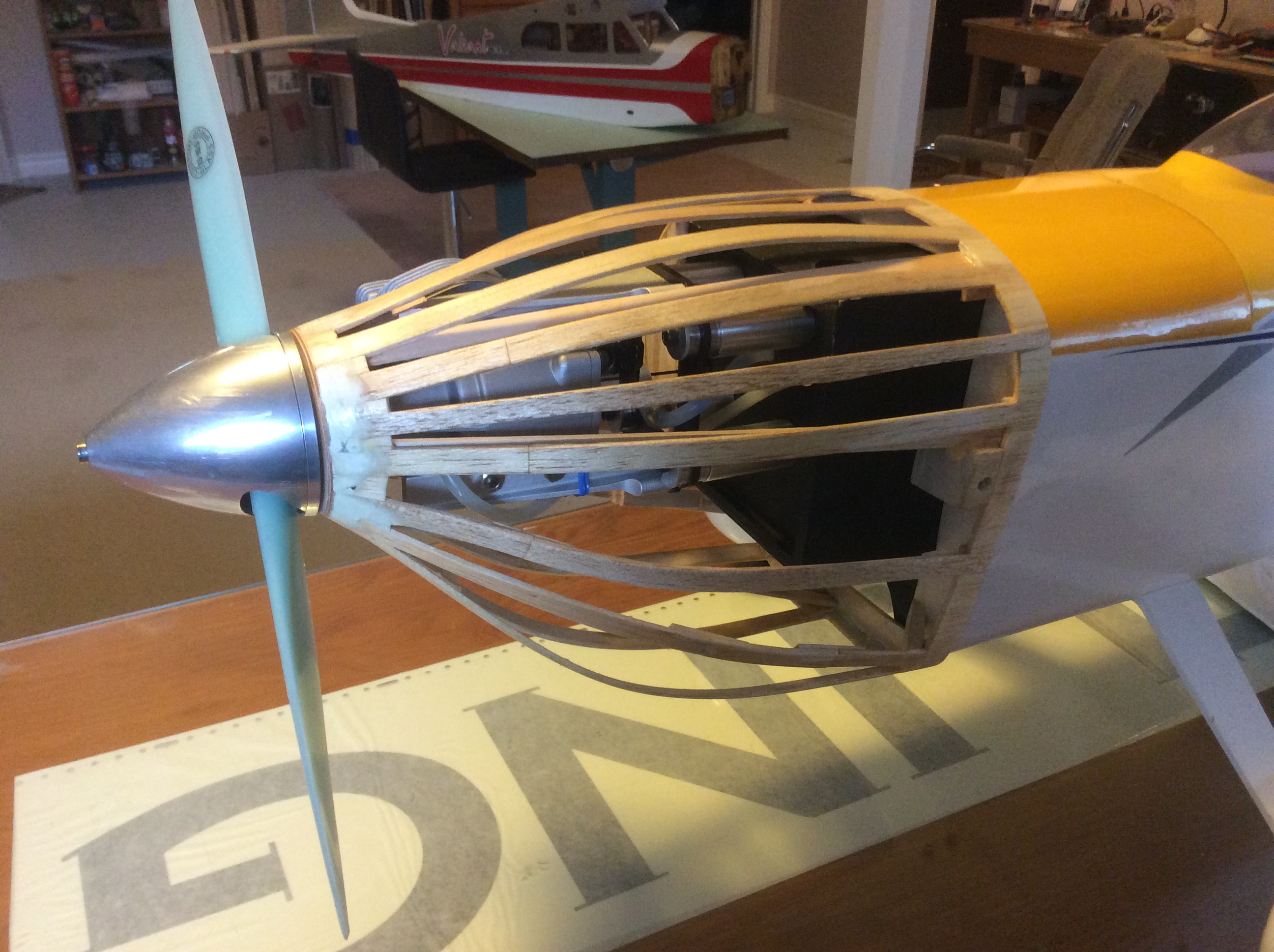 Well it is built and fitted on the plane and mounting blocks added. That was not easy I must broke every stick on it at some time working on it. It is sanded and one coat of thinned epoxy coat on the outside. Will now have to try and cover it without changing the shape and breaking something. Hope fully when the covering is shrunk down on to it it will still be the same shape.