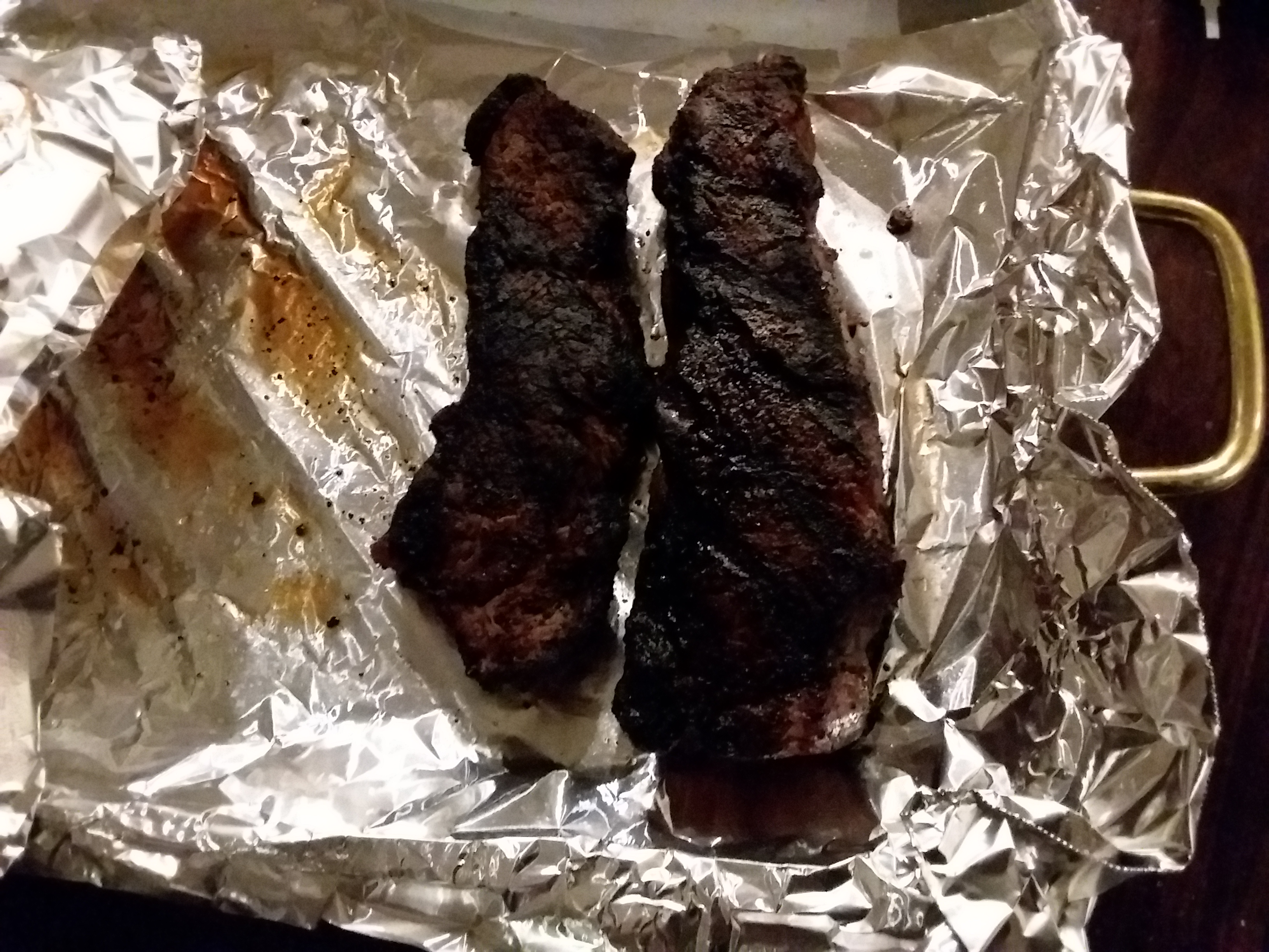 Most of a bag of charcoal then lots of oak pieces until the grates glowed red. 3 minutes then 2 minutes then sit for 5 while the sweet potatoes finish. I like my steaks kosher salted for 30 and room temp before they hit the grill.