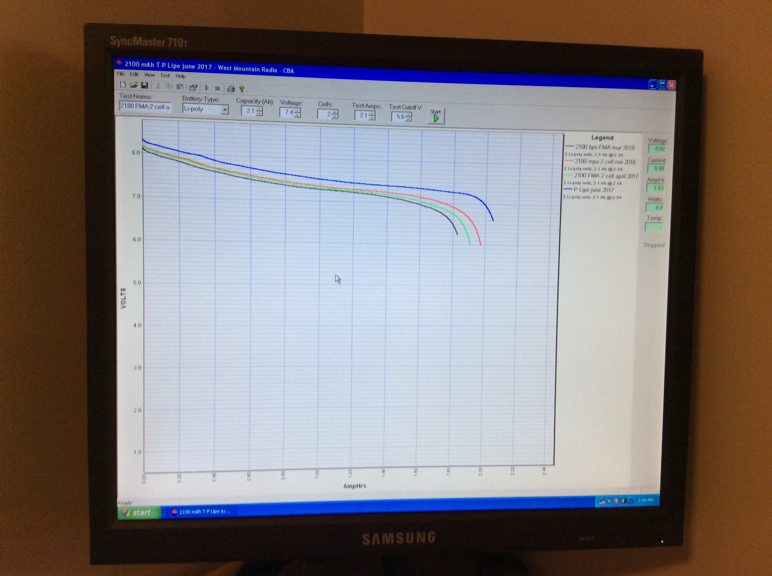 Ok I have a few question to all on GSN. Did a battery check for the plane that is being ready to fly. Check the pack and would like your opinion. It’s a 2100 mAh battery and is 4 years old. As you can see from the test graphs on the screen each line represents a year so the best one the first year and today is lowest one in black. From the graphics you see how the battery is slowly losing power over time.
