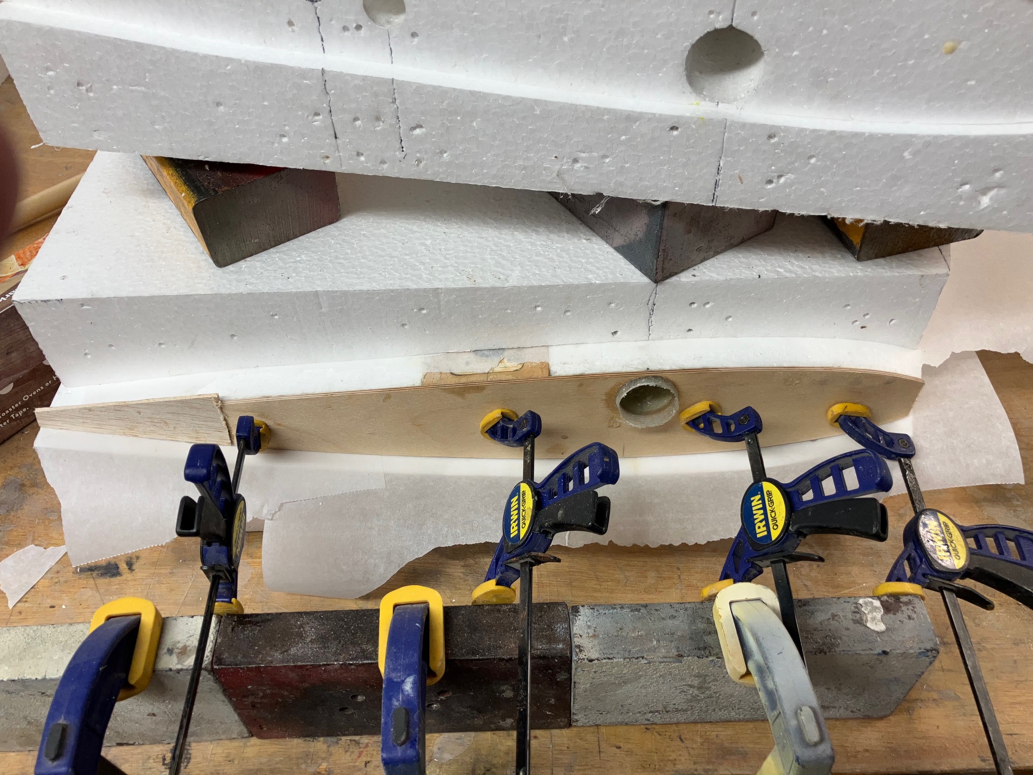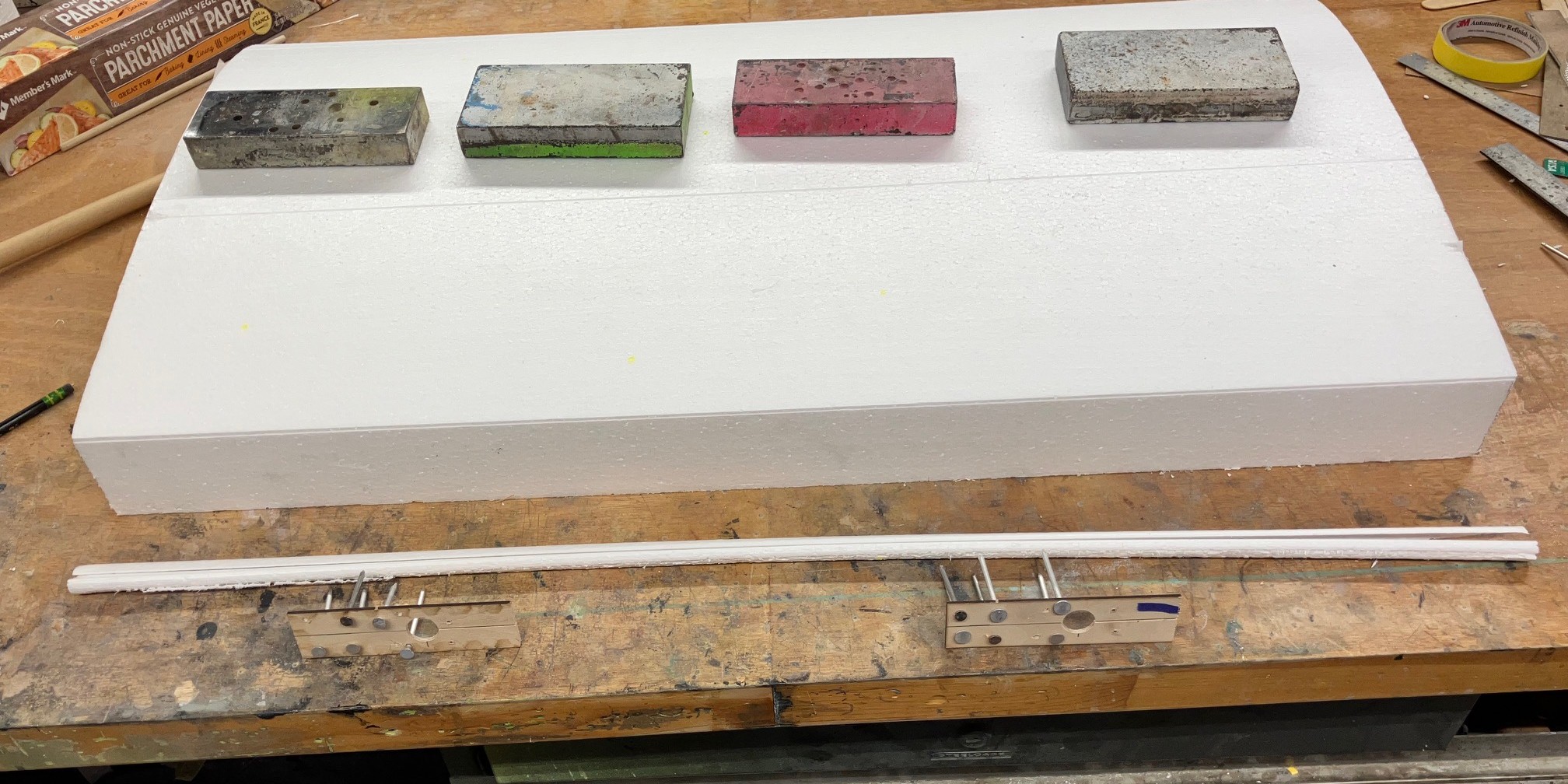 Cut a little foam today. First cut the 4' x 4' block to the shape of the wing platform, then cut the airfoils. The platforms were cut by myself and I enlisted the help of my wife Debbie to cut the airfoil shape. One down, three to go, will cut the socket hole in the inner panels before the airfoil is cut. The right outer core weights 10 ounces.