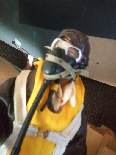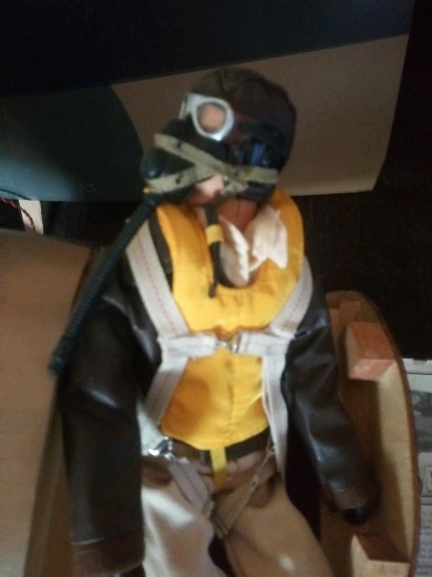 He has a servo lead coming out of his...um, ah....hmm, arse....hee hee. His head will move with a control surface movement. Hook him to the rudder or the ailerons and his head operates with them. LOL.