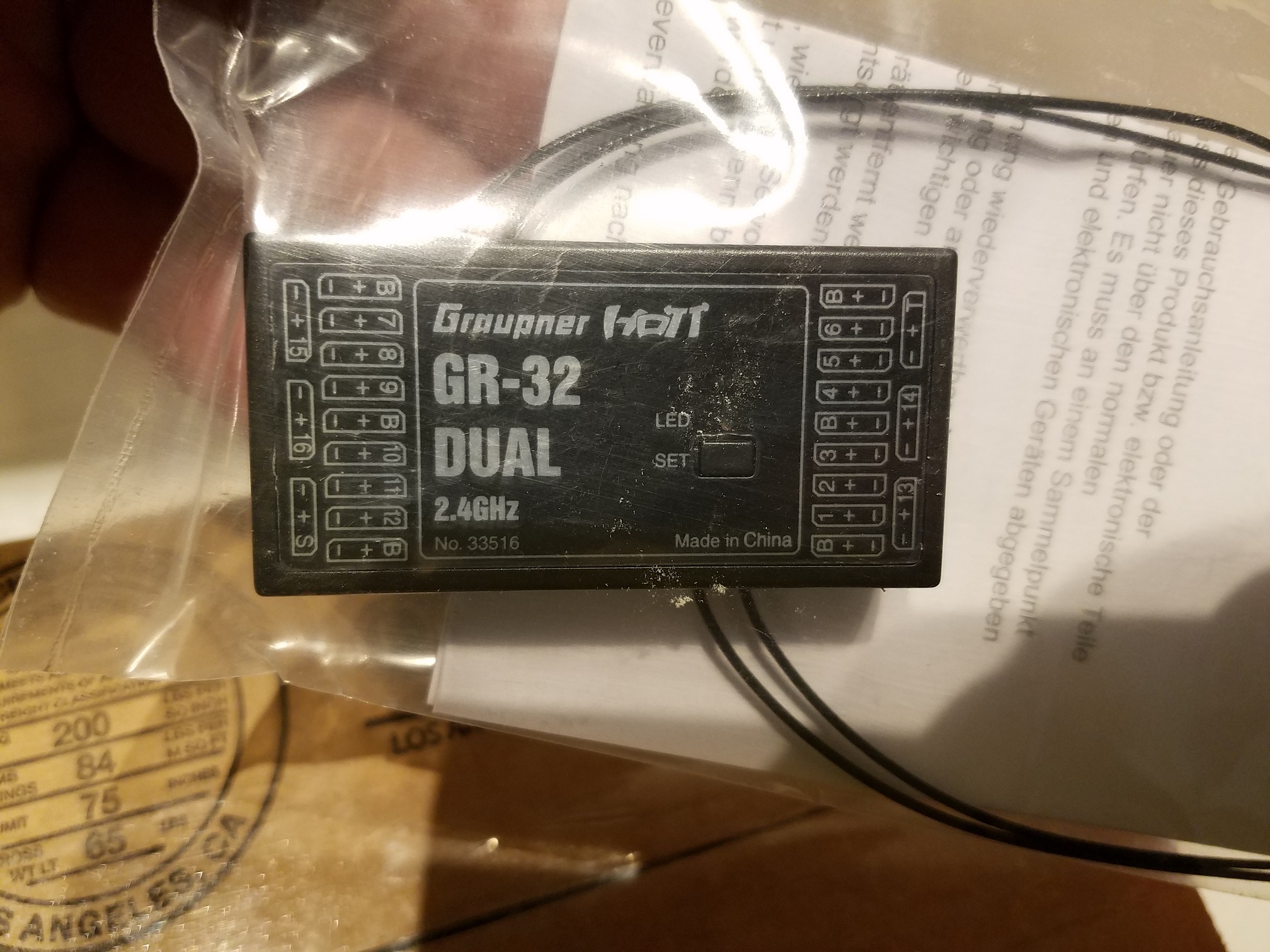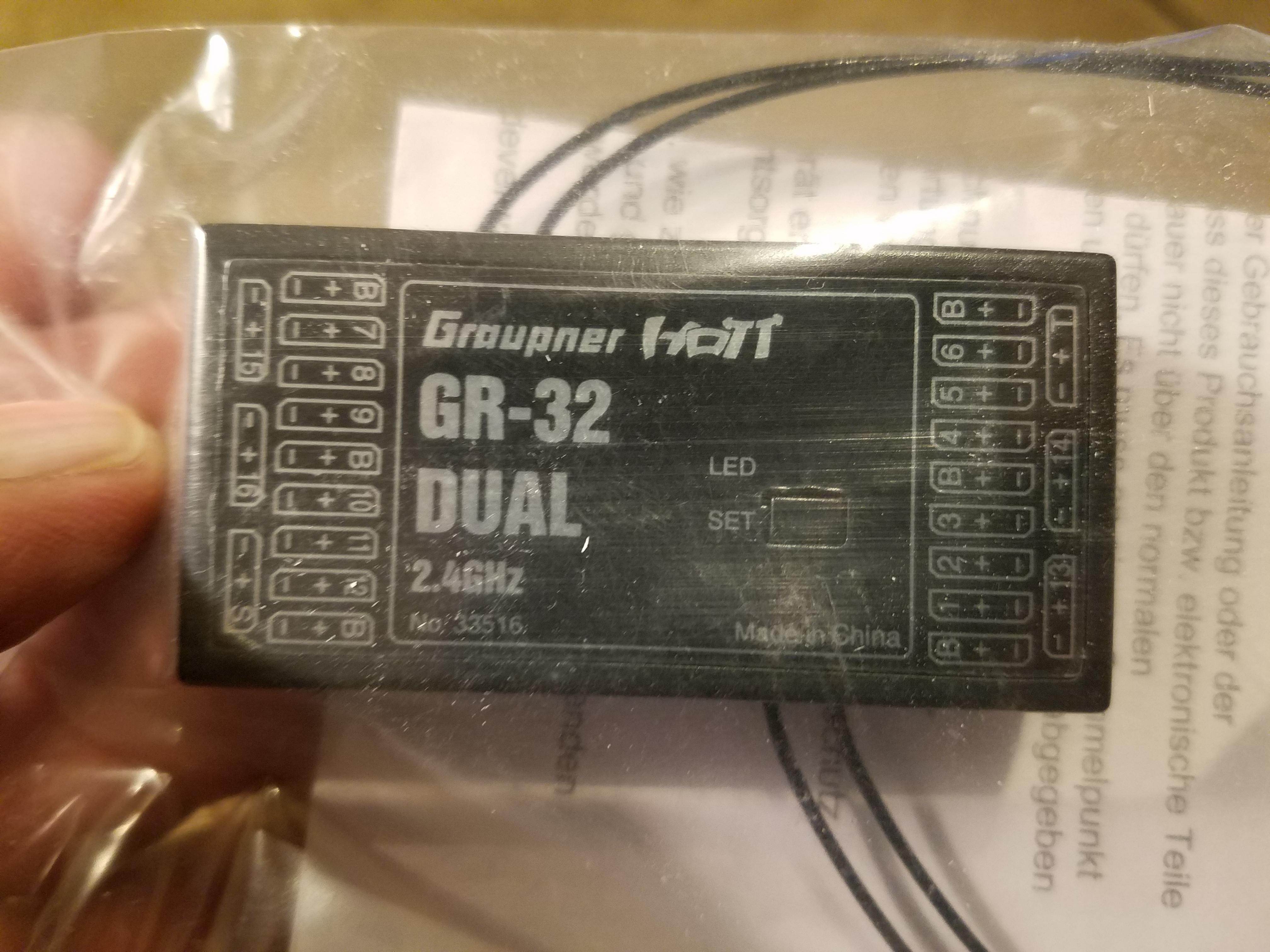 Bottom row left to right is ch. 13 and 14 with telemetry on the far right. On the left side of the rx., you will see ch. 7-9, B then 10-12 with B again on both ends. Bottom row left to right is ch's 15 and 16 with S on the end. I do not know why they number the channels in that order. As for the "B's", they are battery ports. However my understanding is 4 batteries can be plugged into this receiver. I don't know why there are 6 "B" ports. It is also my understanding that any "Hott" receiver can be used in conjunction with the GR-32. So in essence another GR-32 can be used to give the radio functionality of a full 32 channels. No S-bus needed. Just bind it with your radio as you normally do and set up channels the way you like. I really love this idea. If I wanted to use a 12 ch. rx., an 8 or even a 4... it does not matter. As long as it is a "Hott" rx., you can design your own system the way you like. This way a rx. can be placed in the main wing with it's own power supply and no wiring between the fuse and wing. A million possibilities.